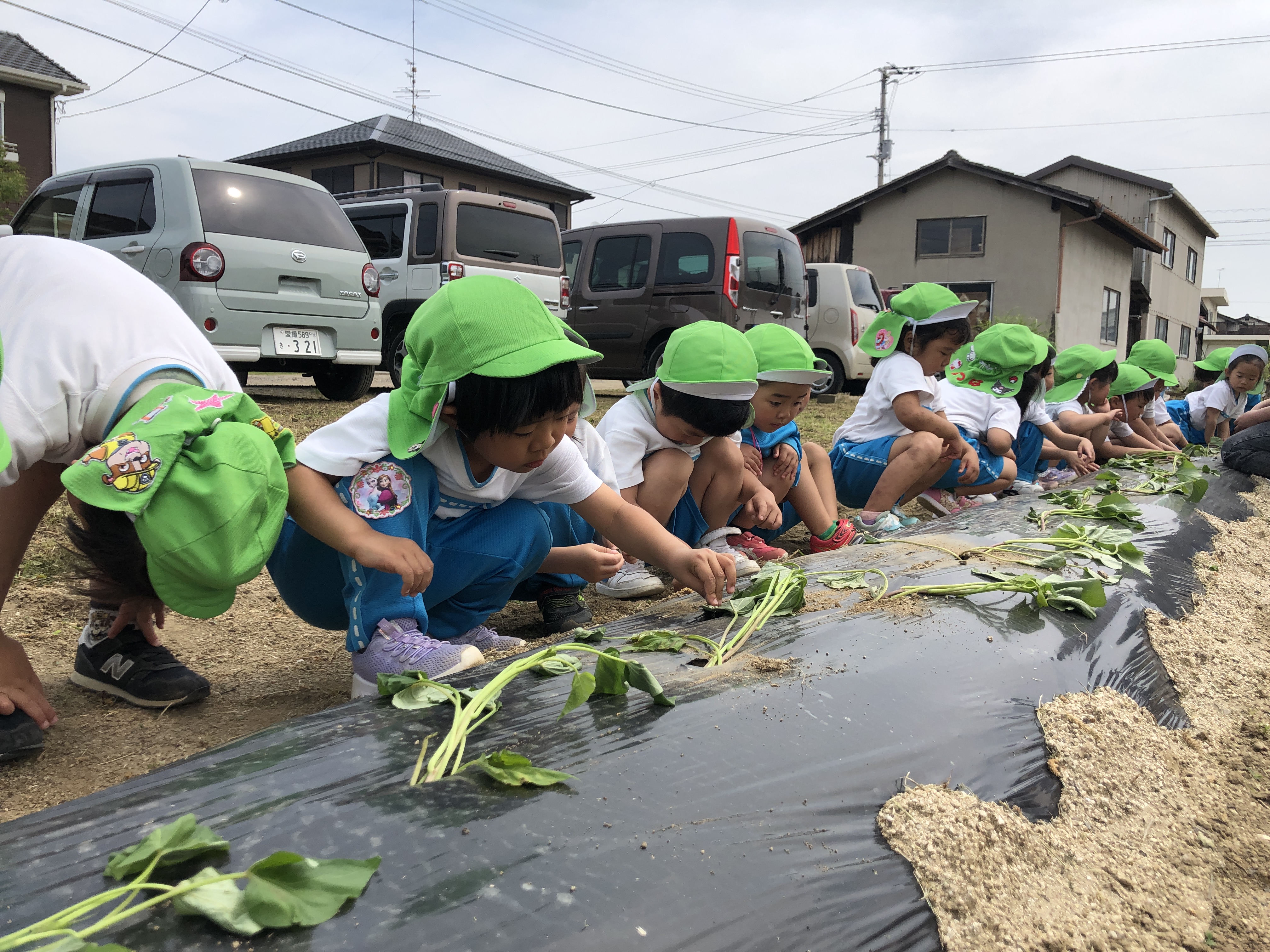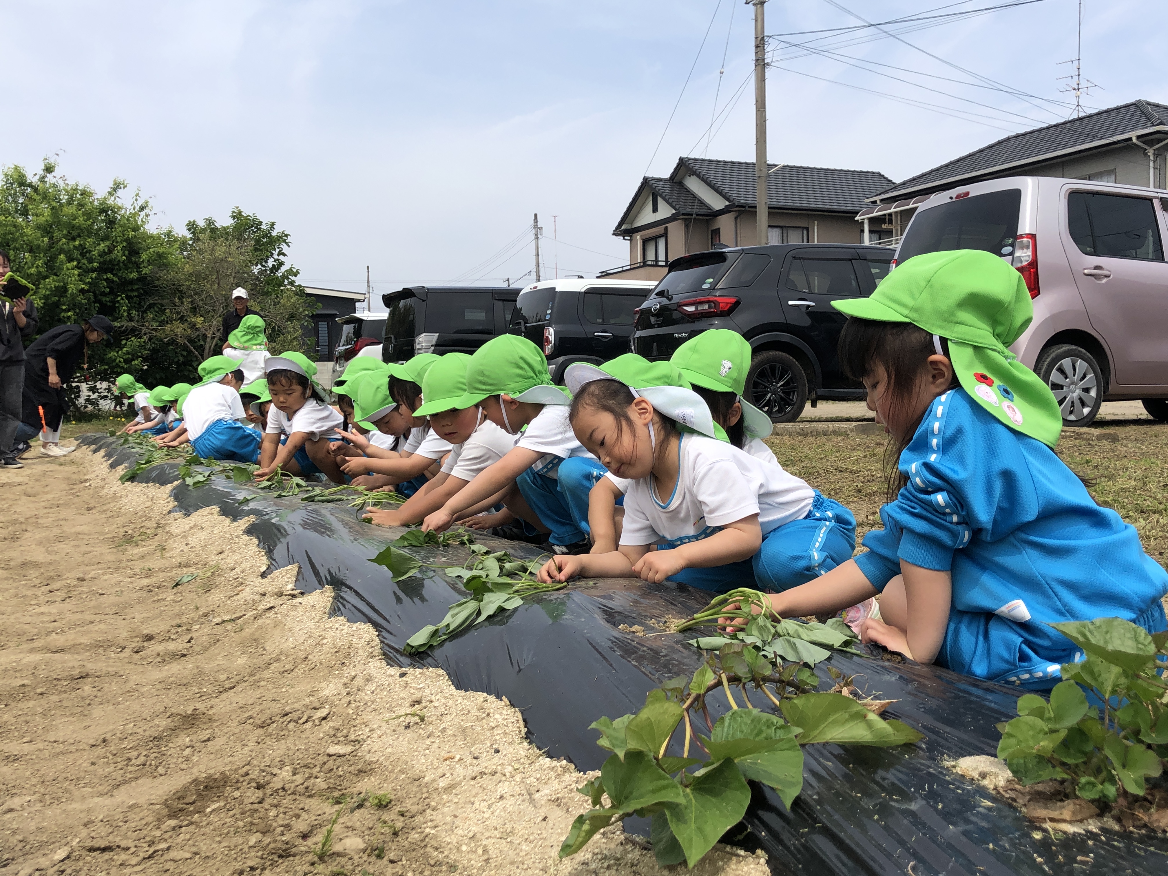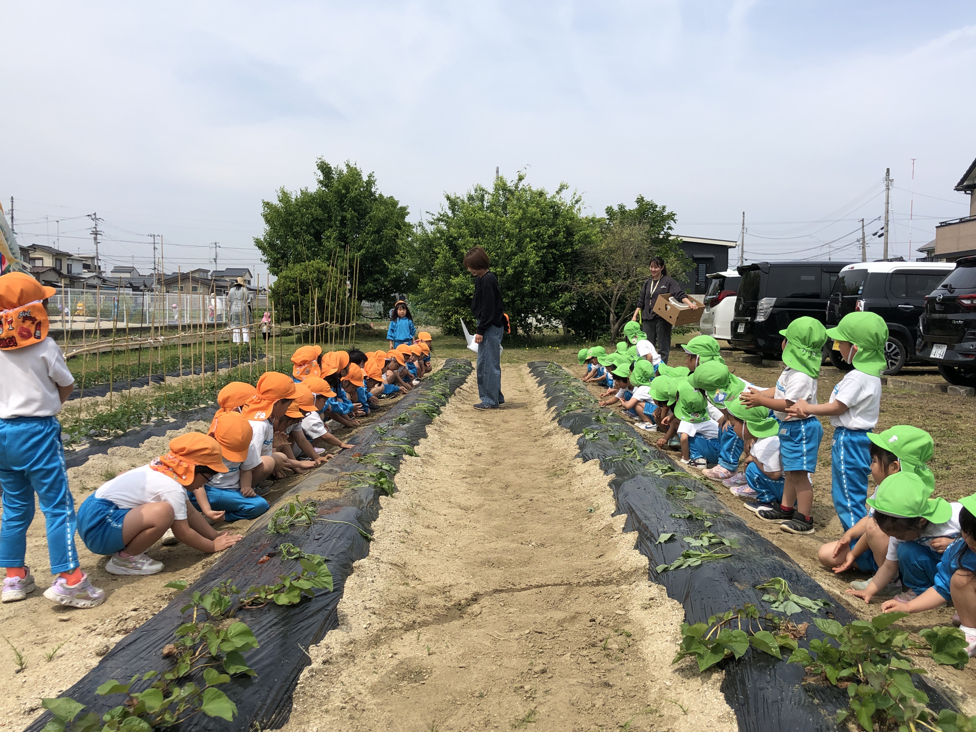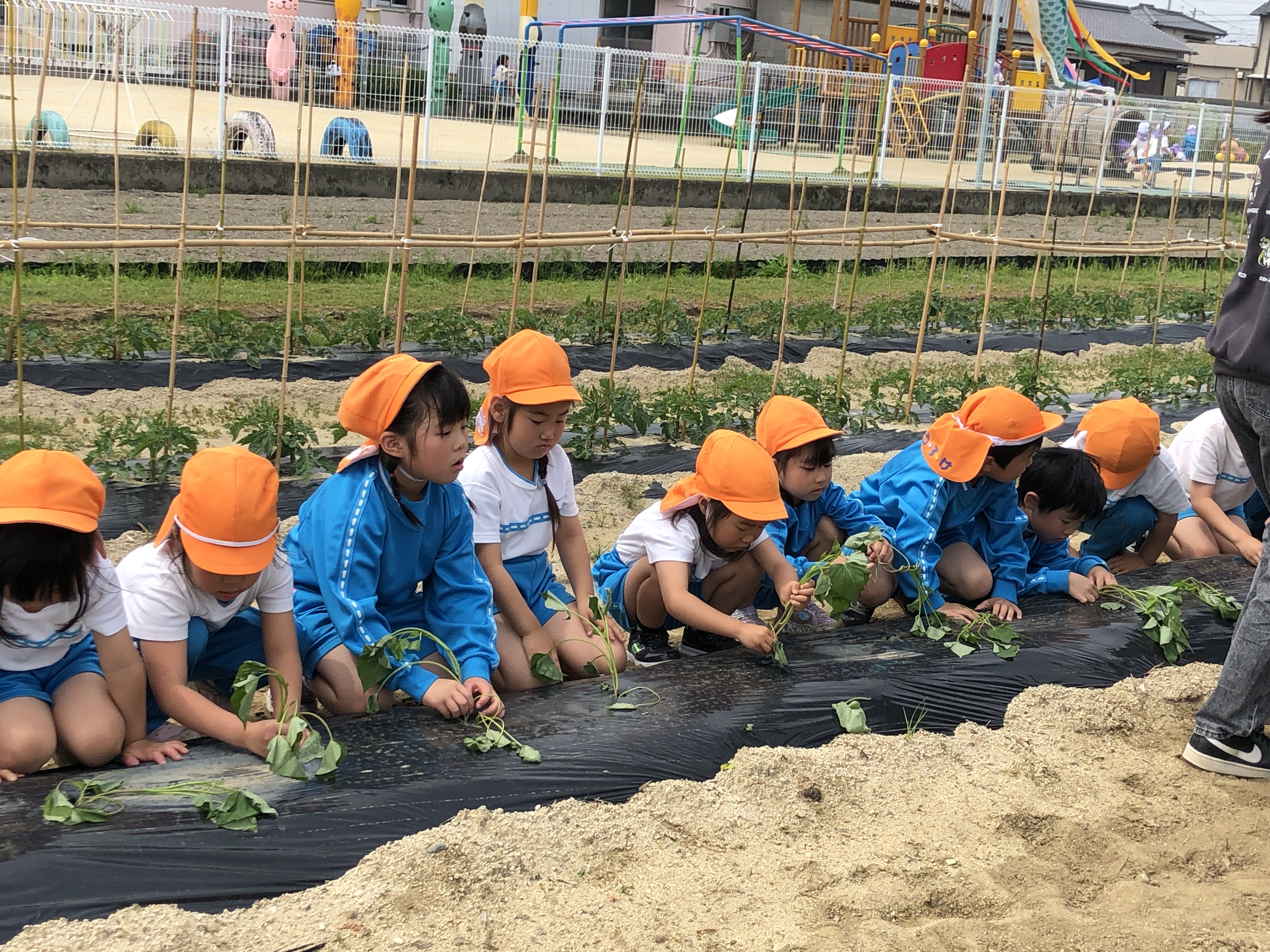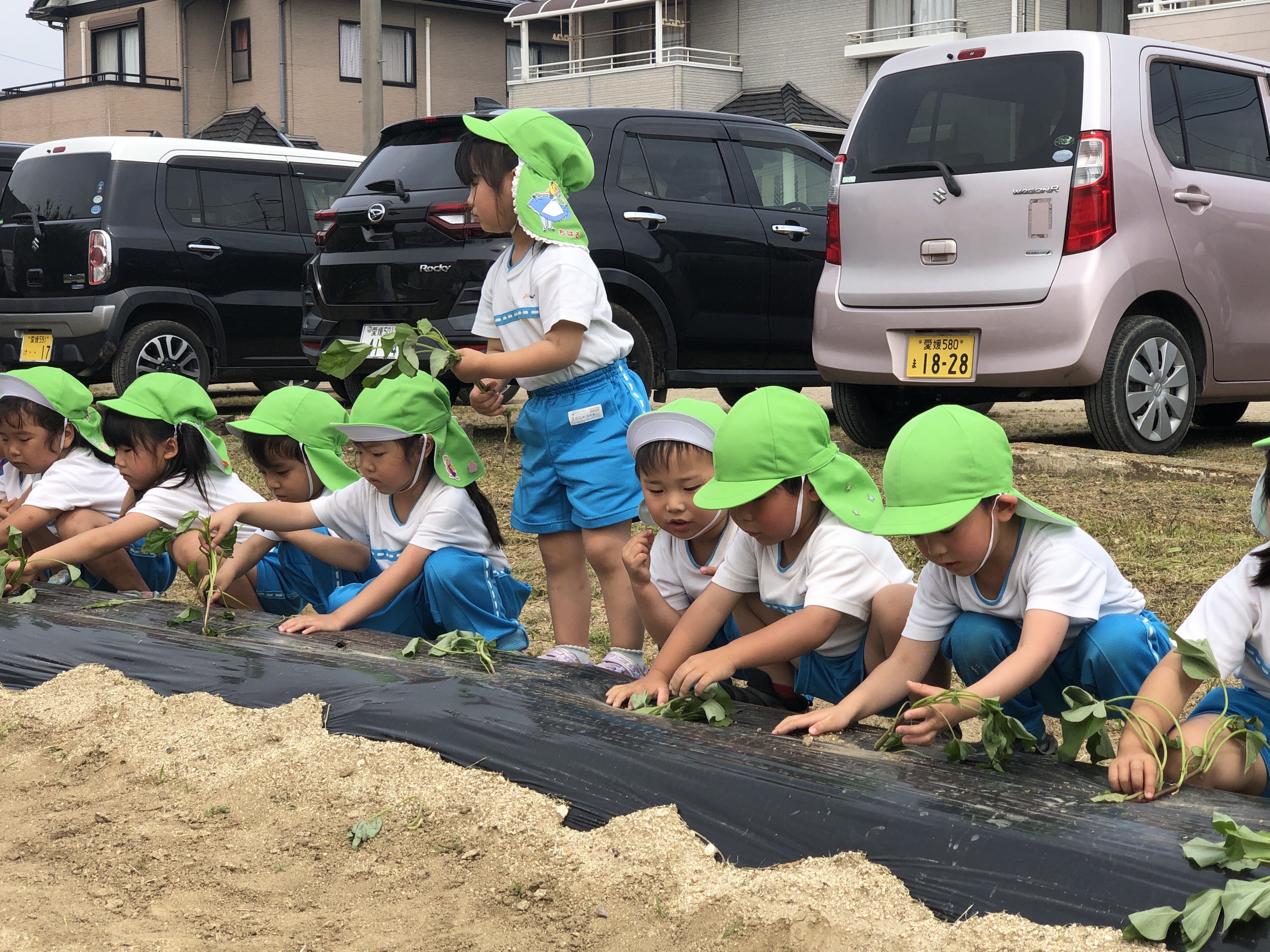 ふじ組(年中児)とさくら組(年長児)のお友だちがサツマイモの苗を植えました。