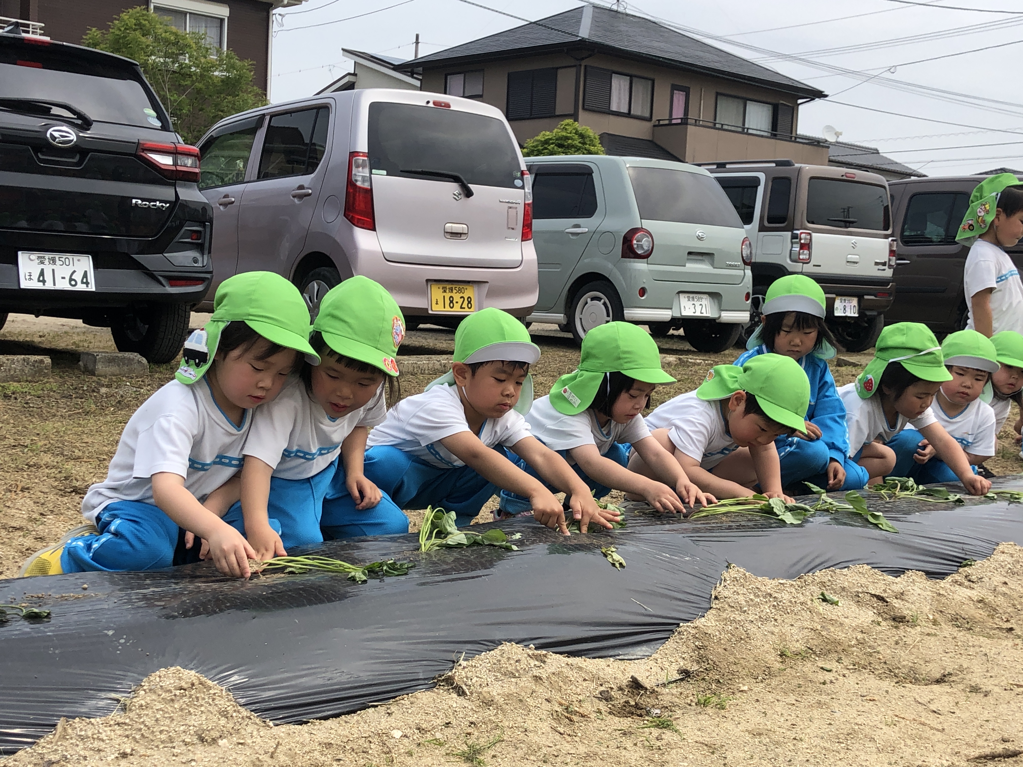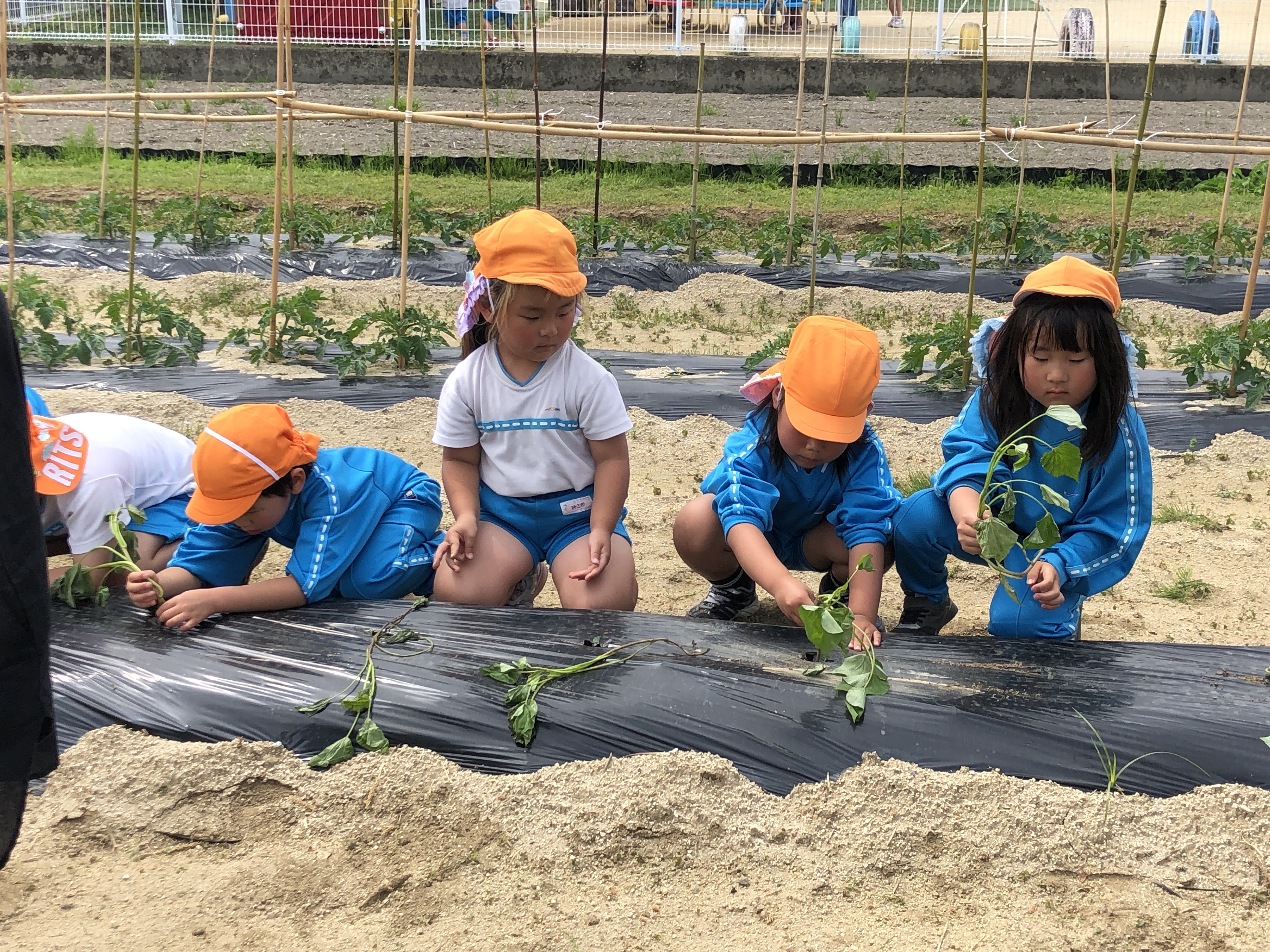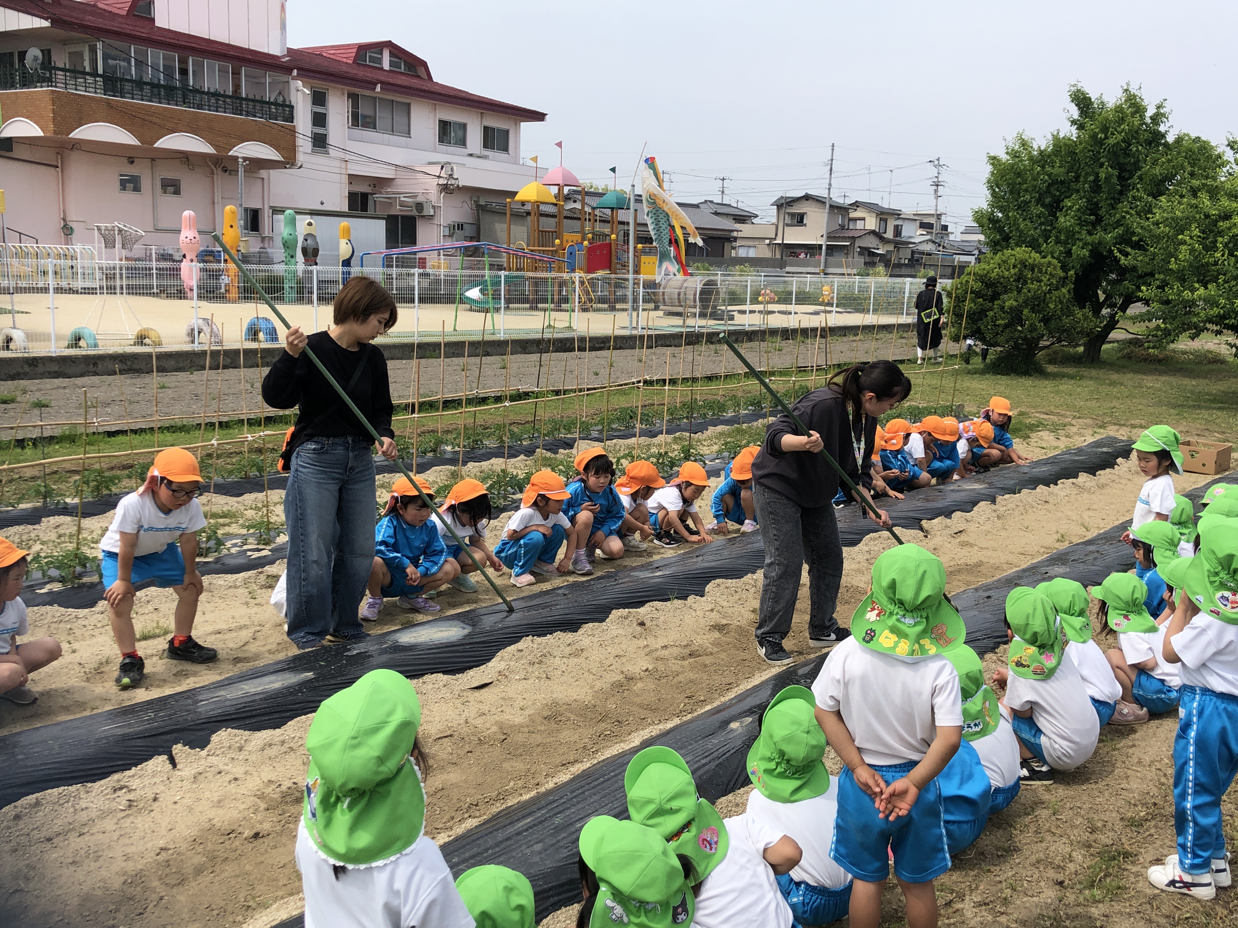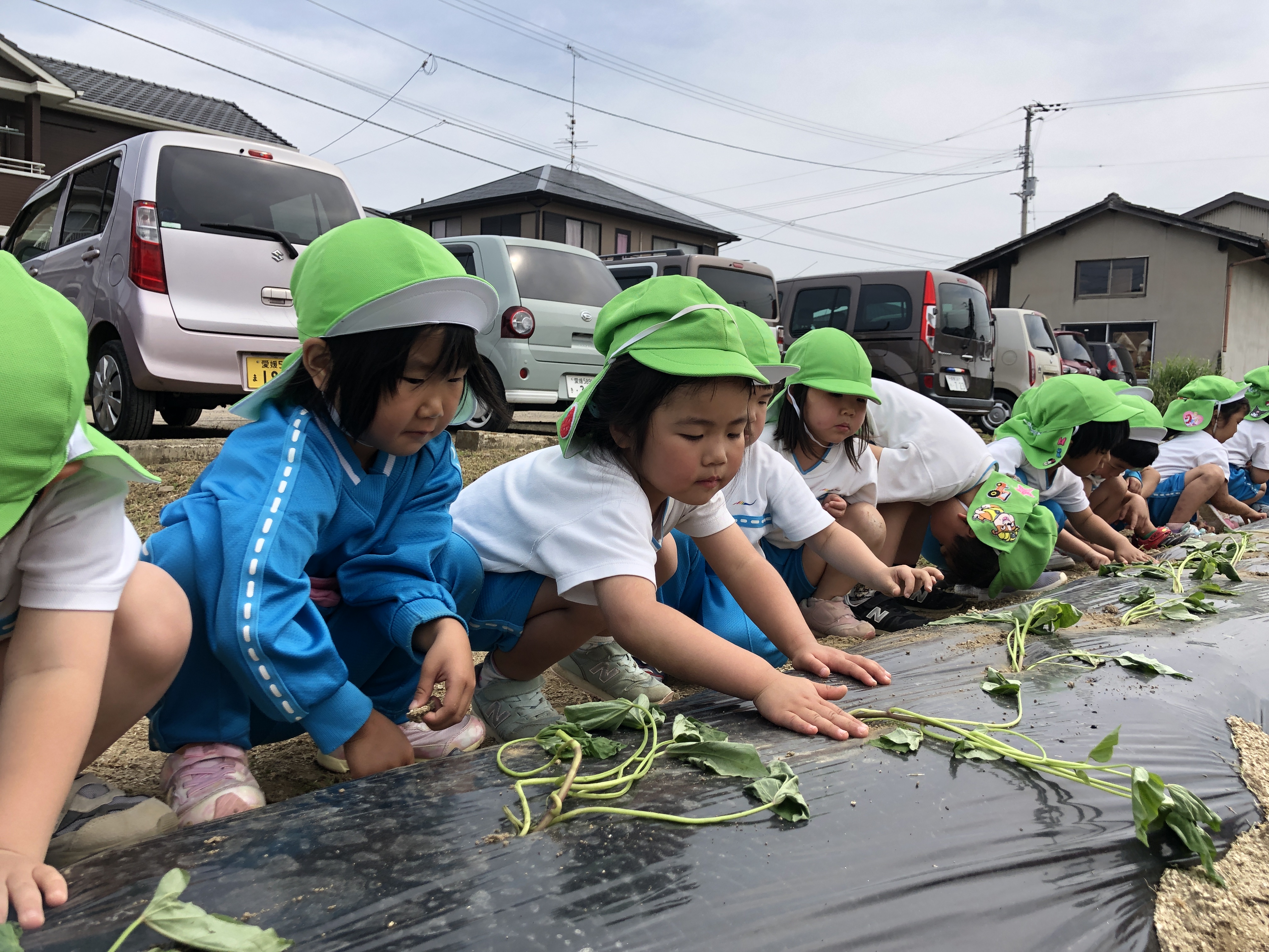 ふじ組(年中児)とさくら組(年長児)のお友だちがサツマイモの苗を植えました。