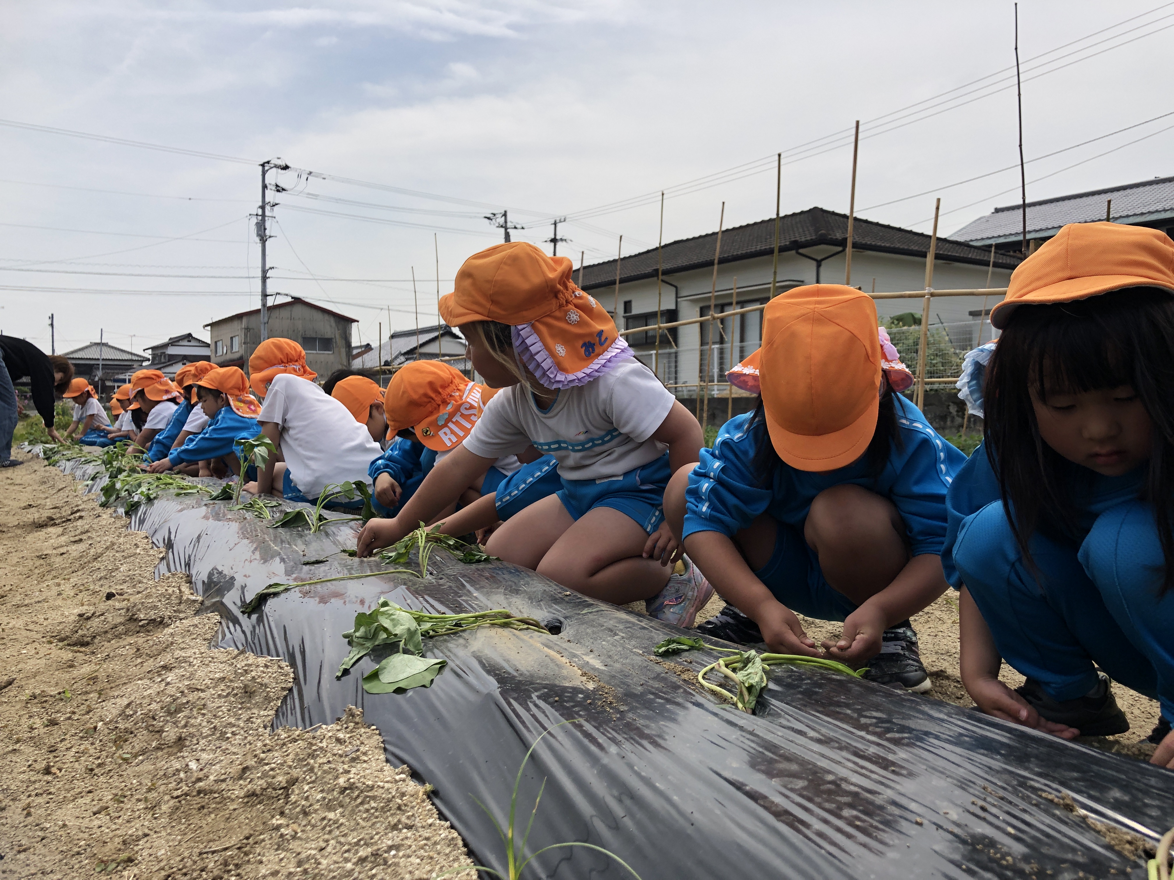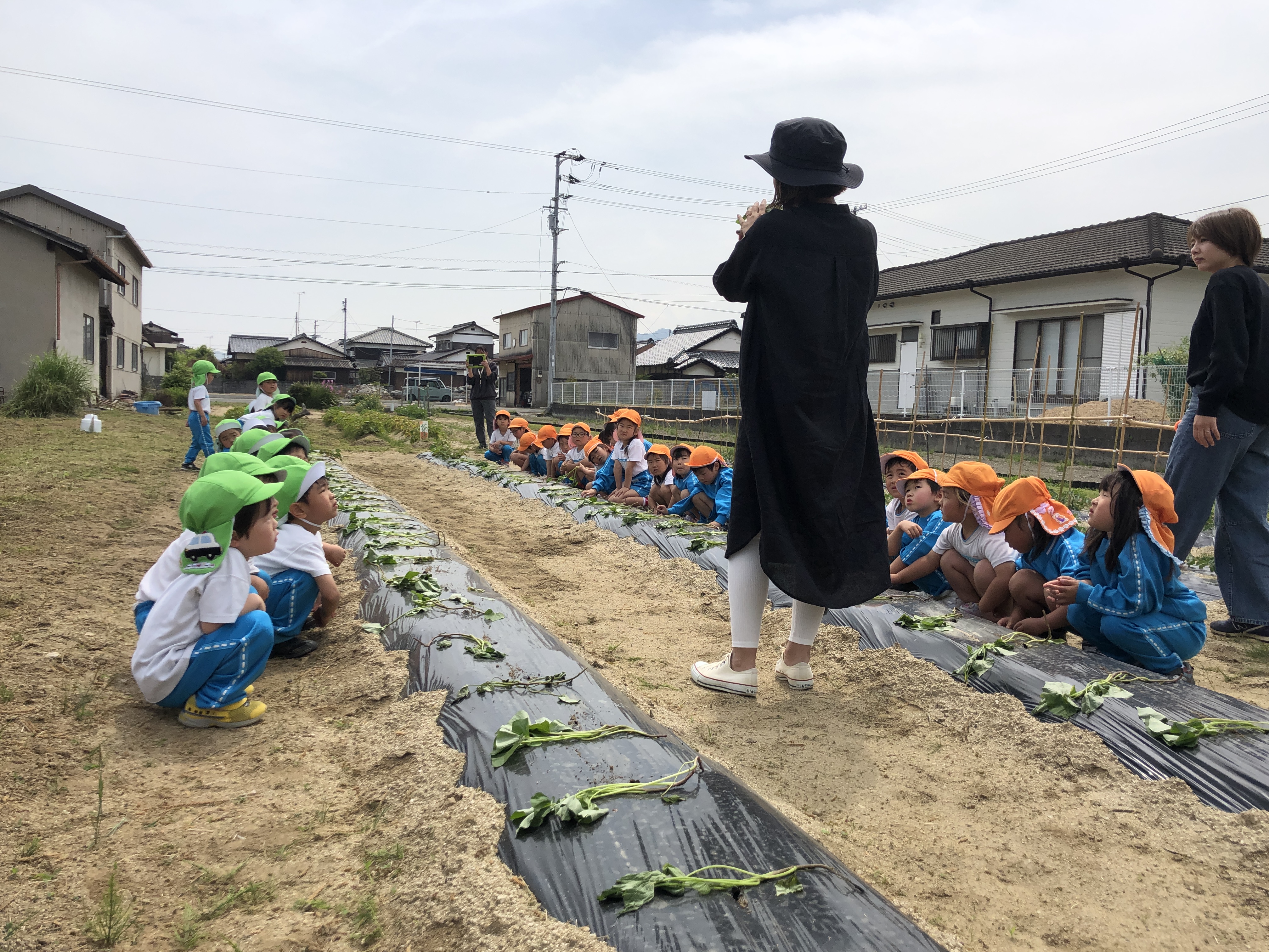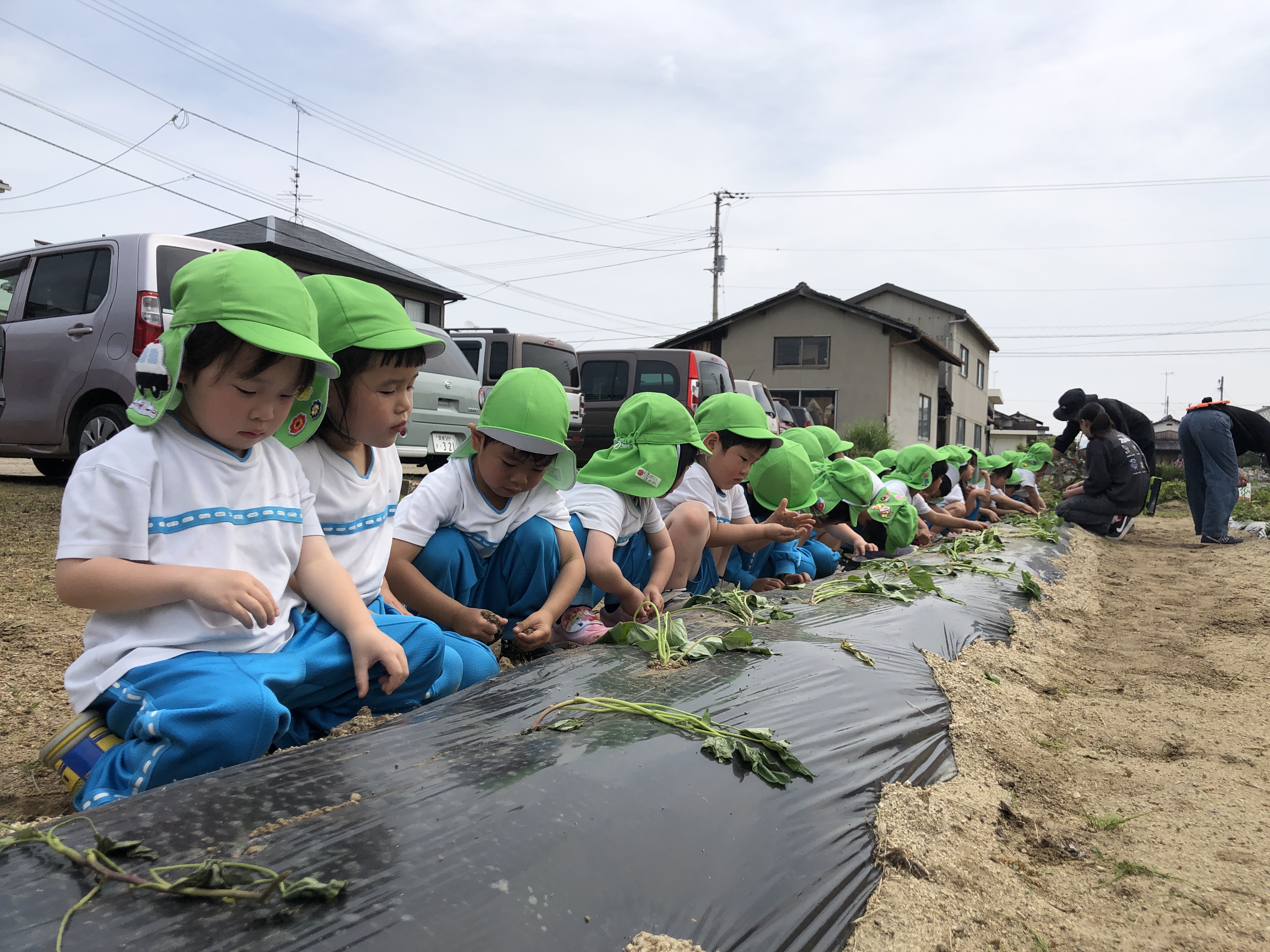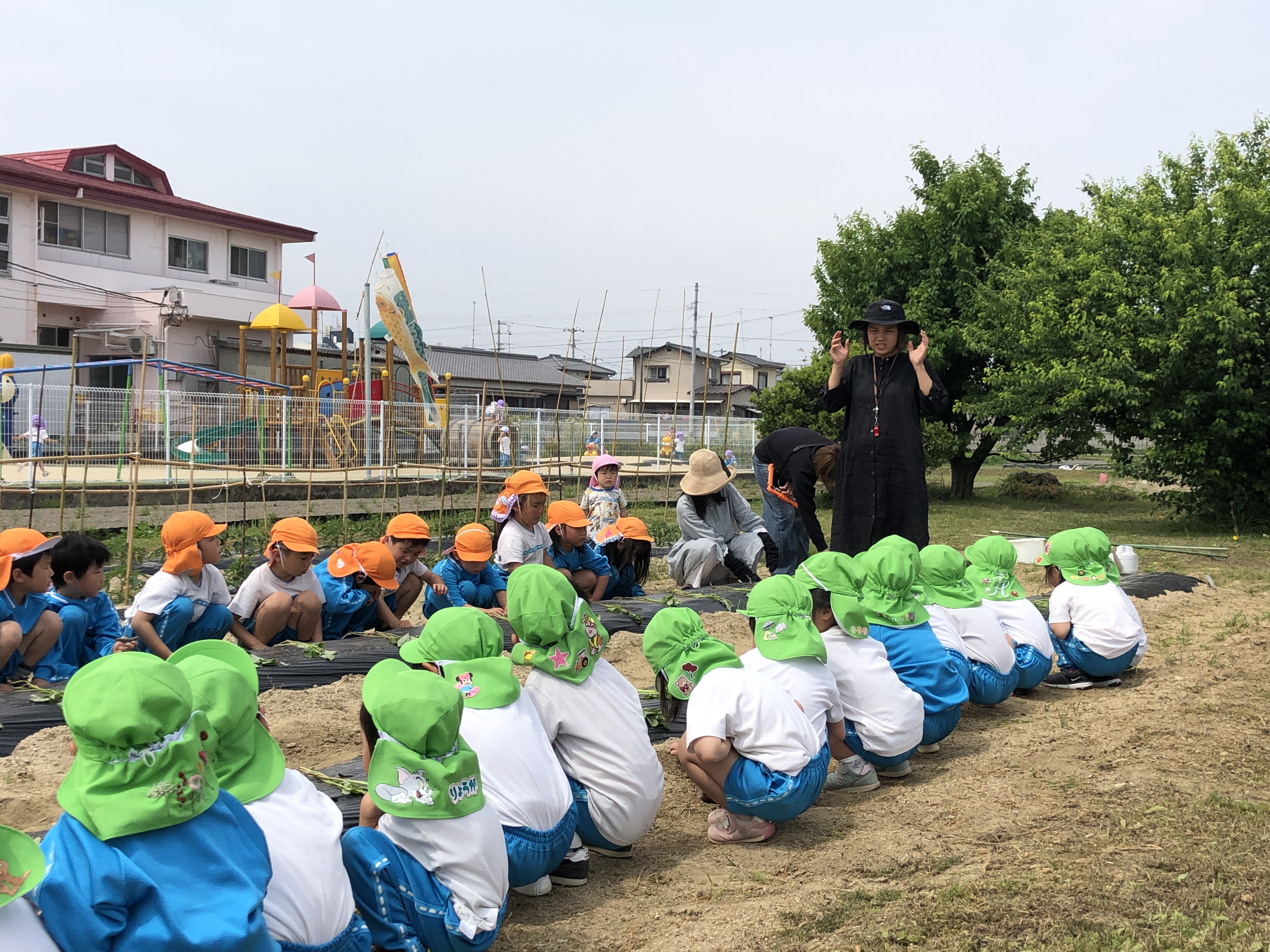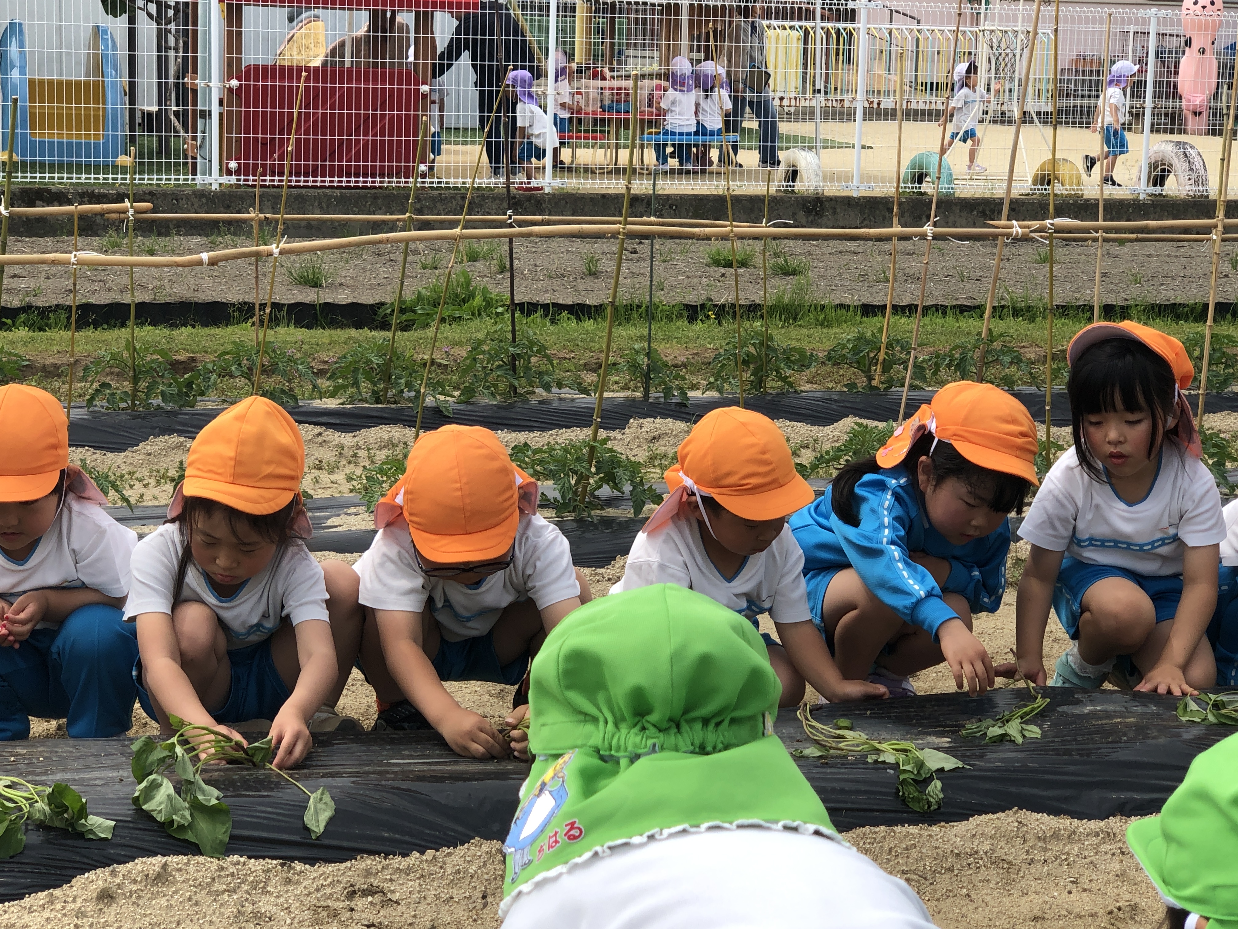 ふじ組(年中児)とさくら組(年長児)のお友だちがサツマイモの苗を植えました。