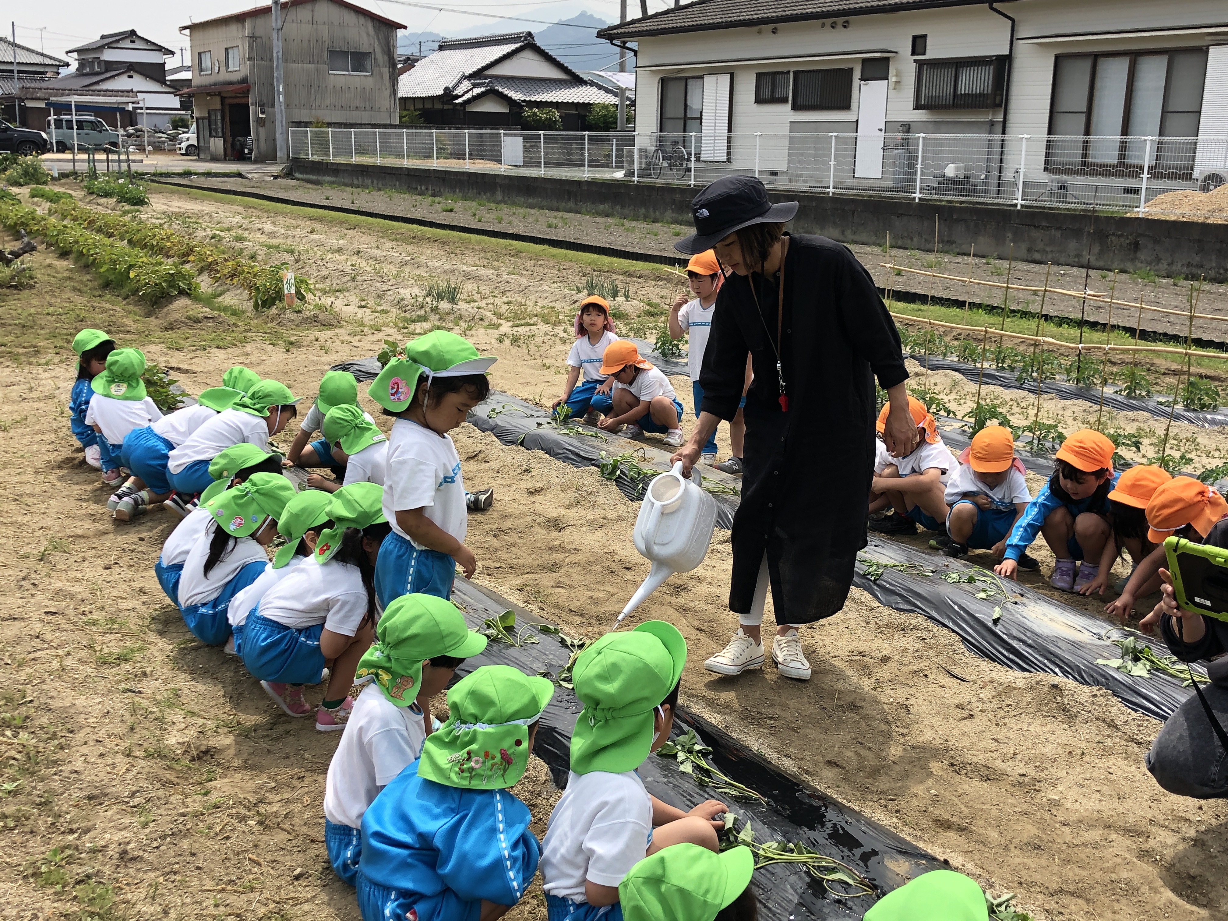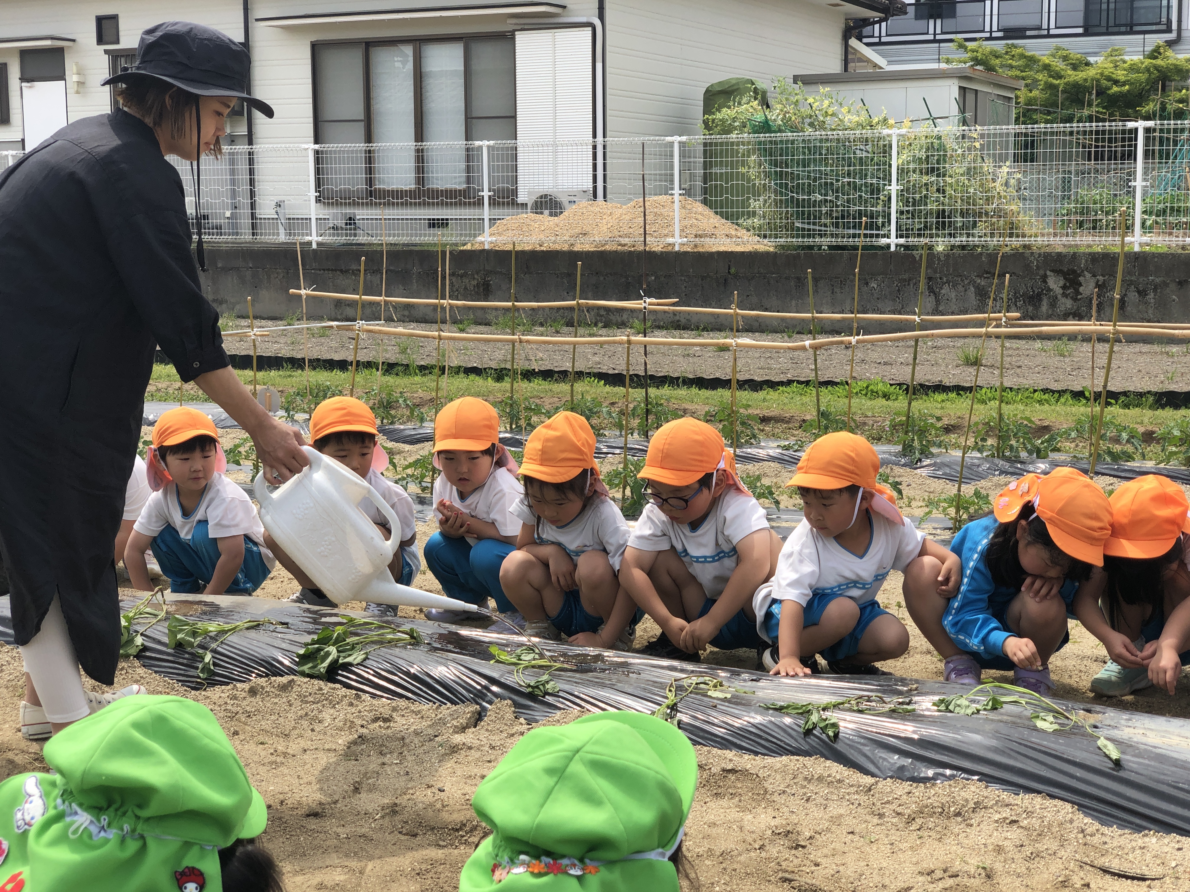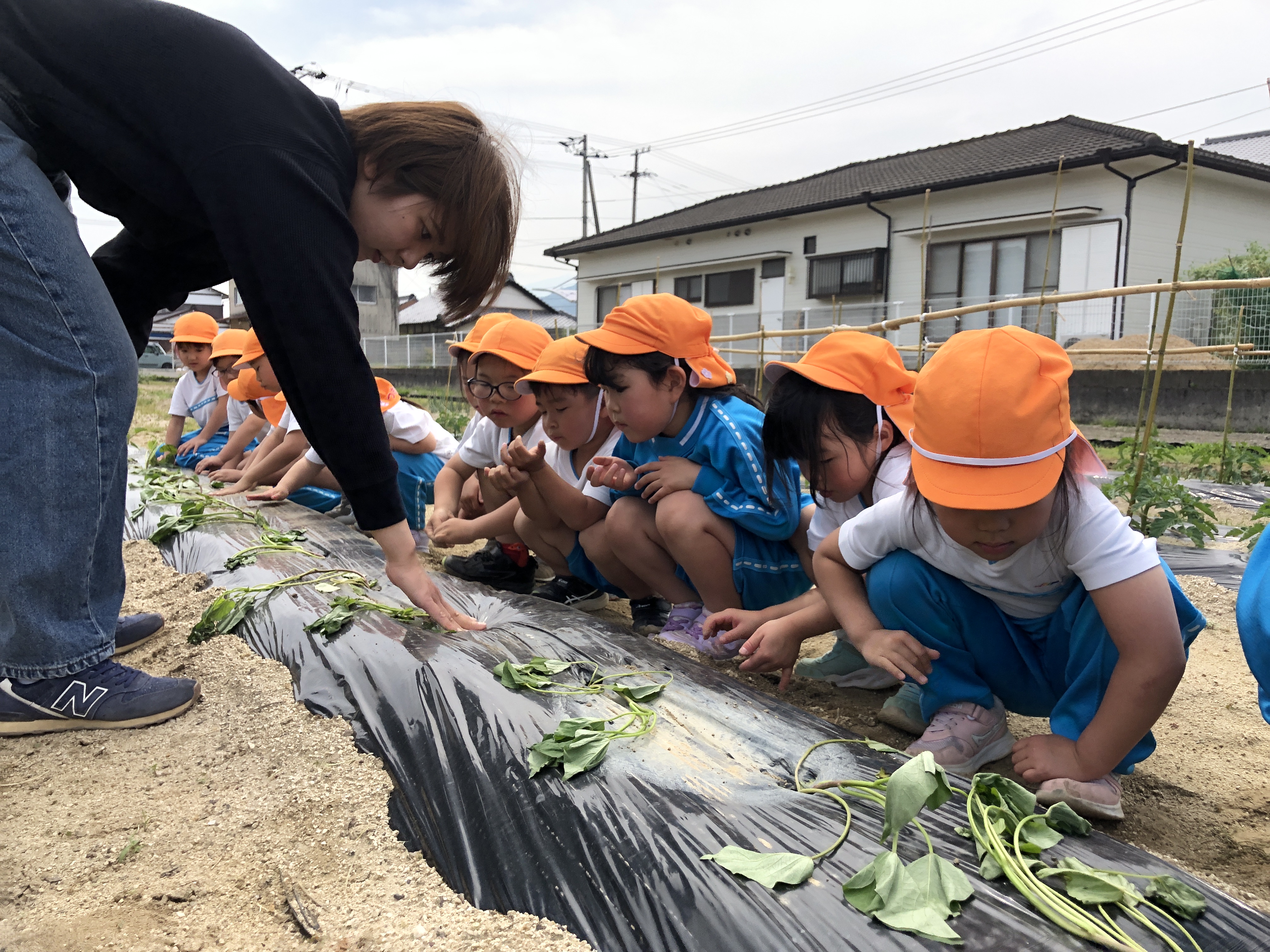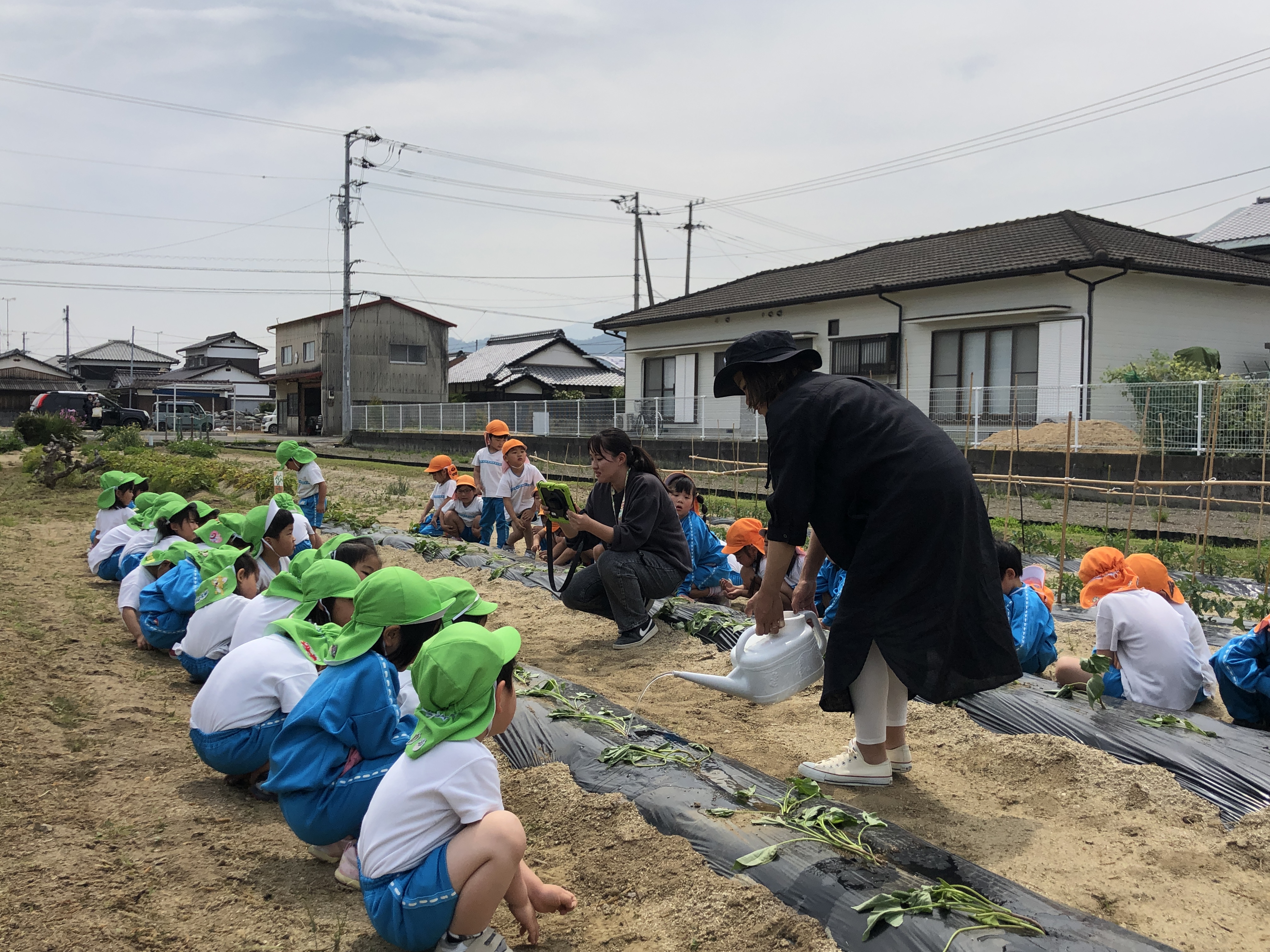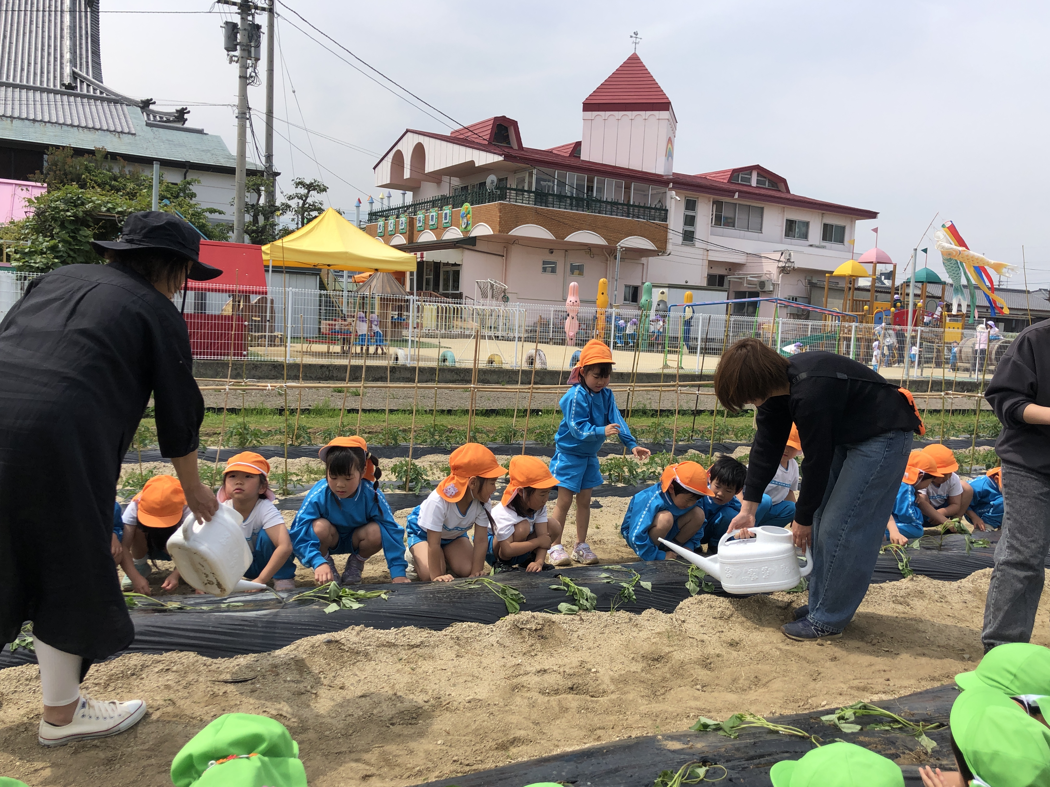 ふじ組(年中児)とさくら組(年長児)のお友だちがサツマイモの苗を植えました。