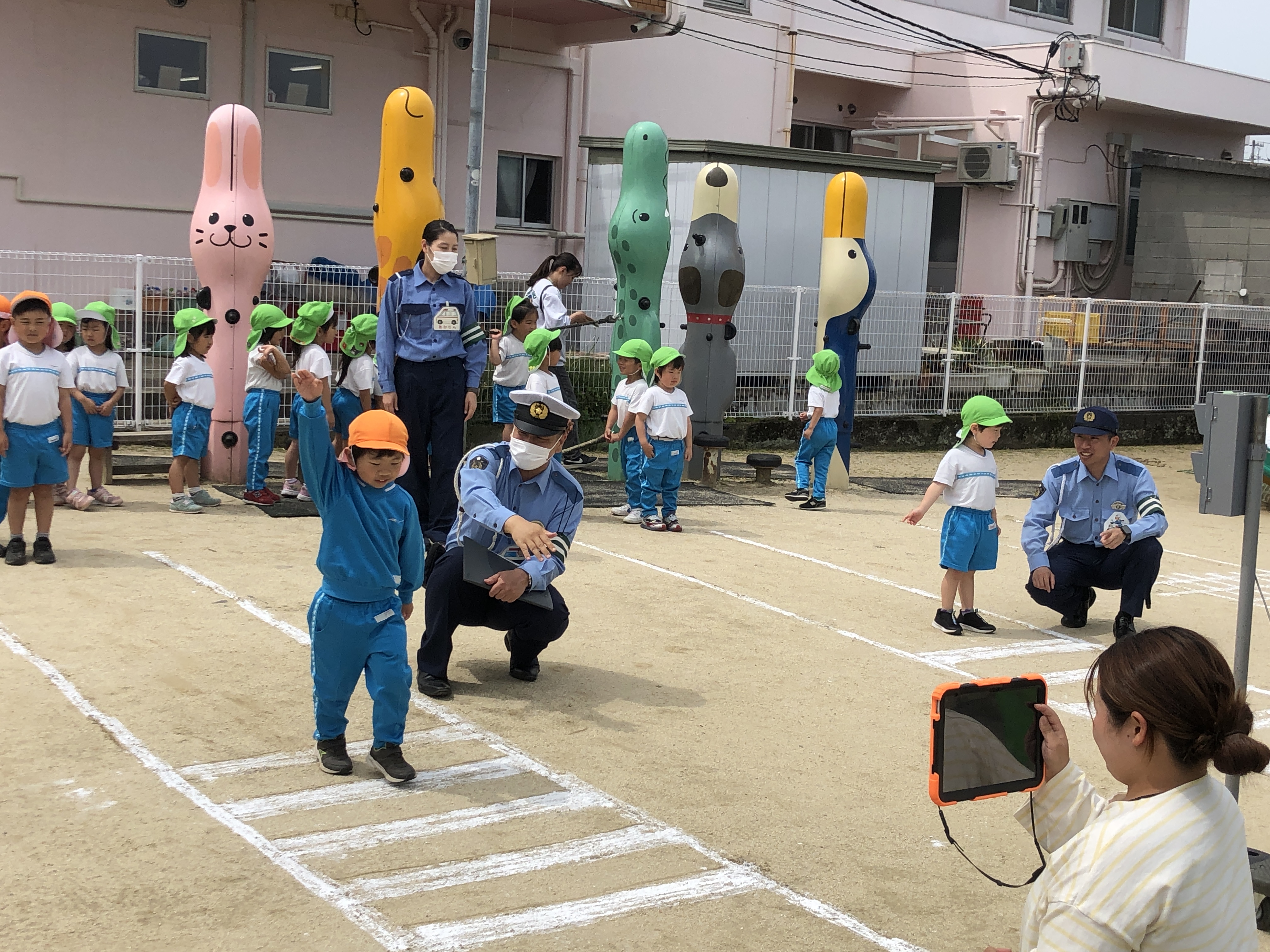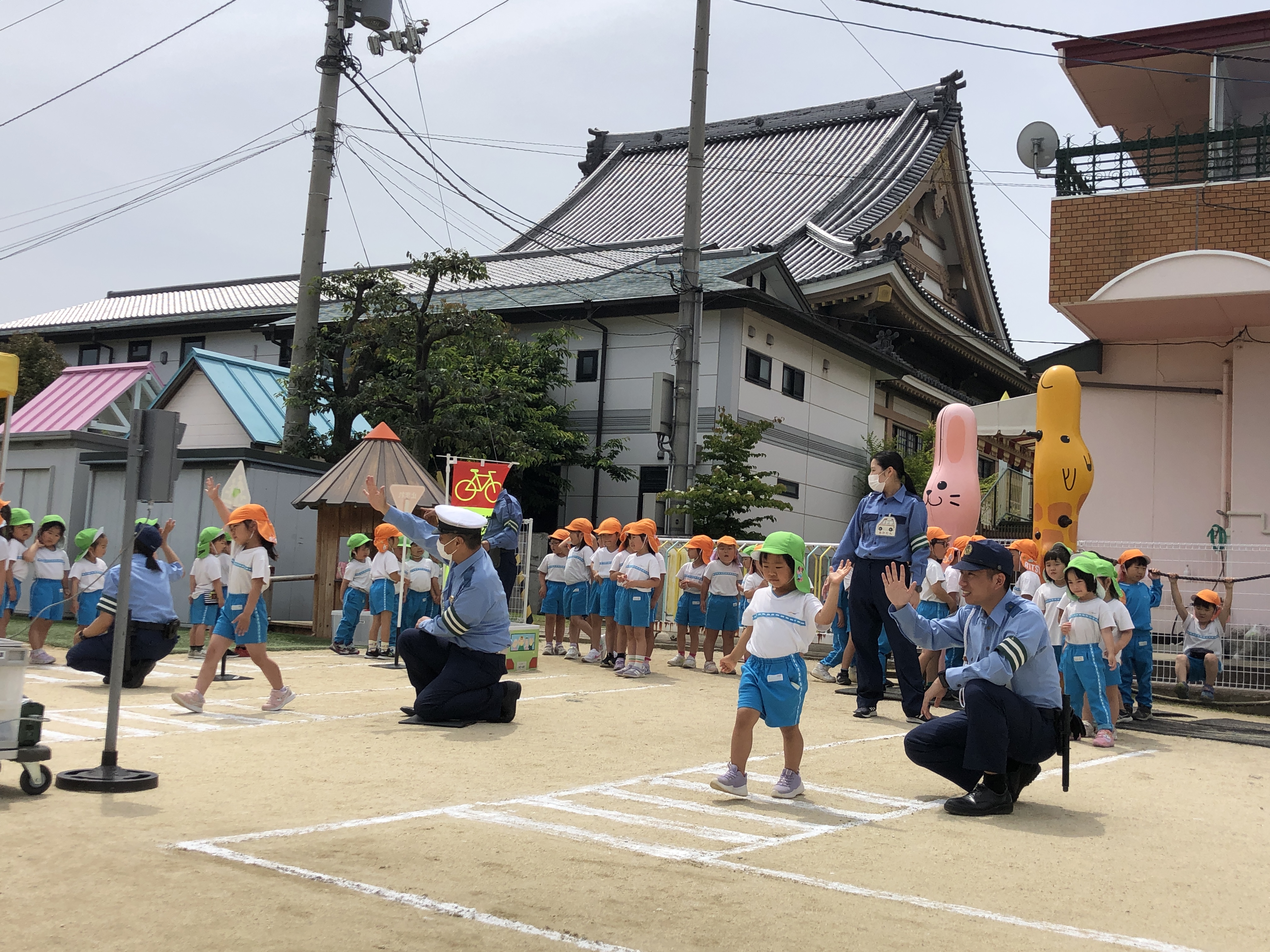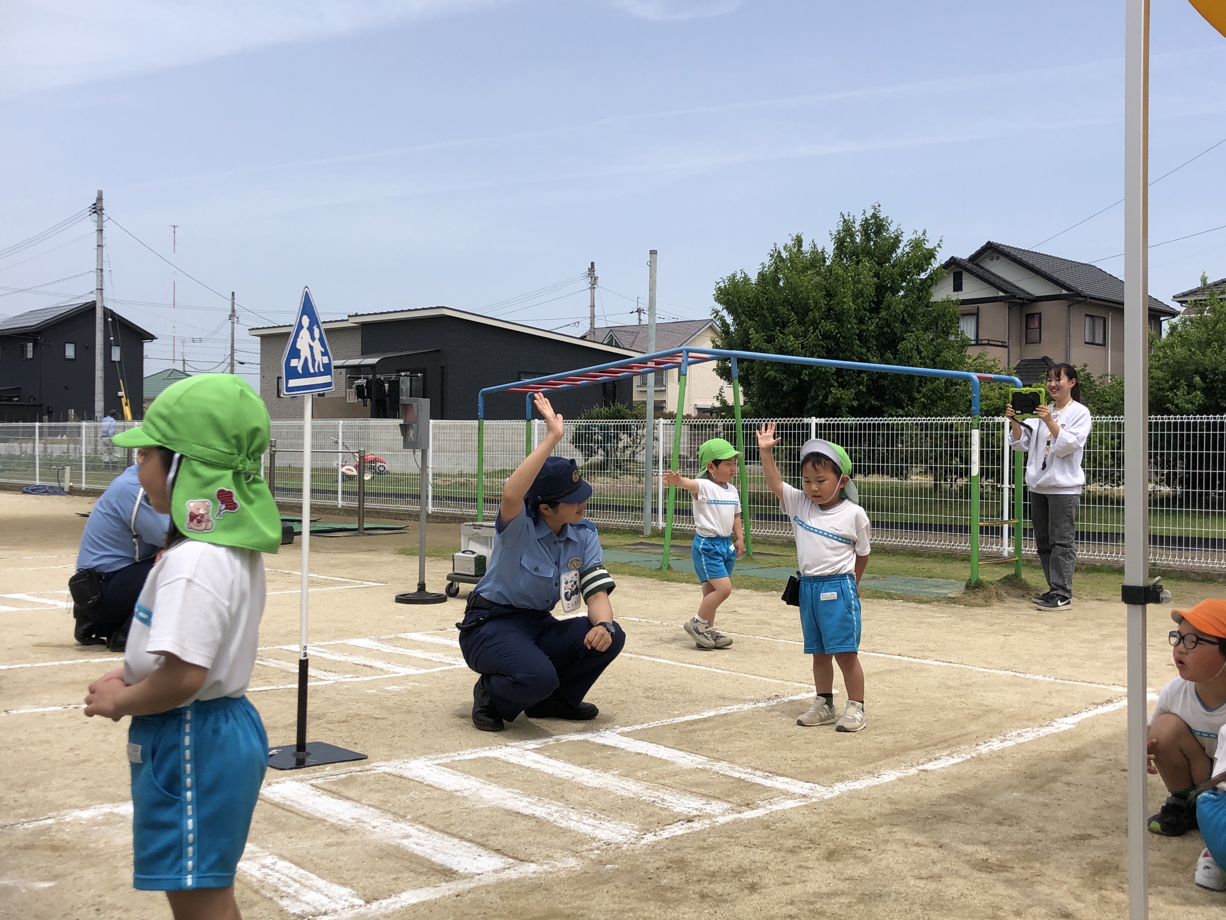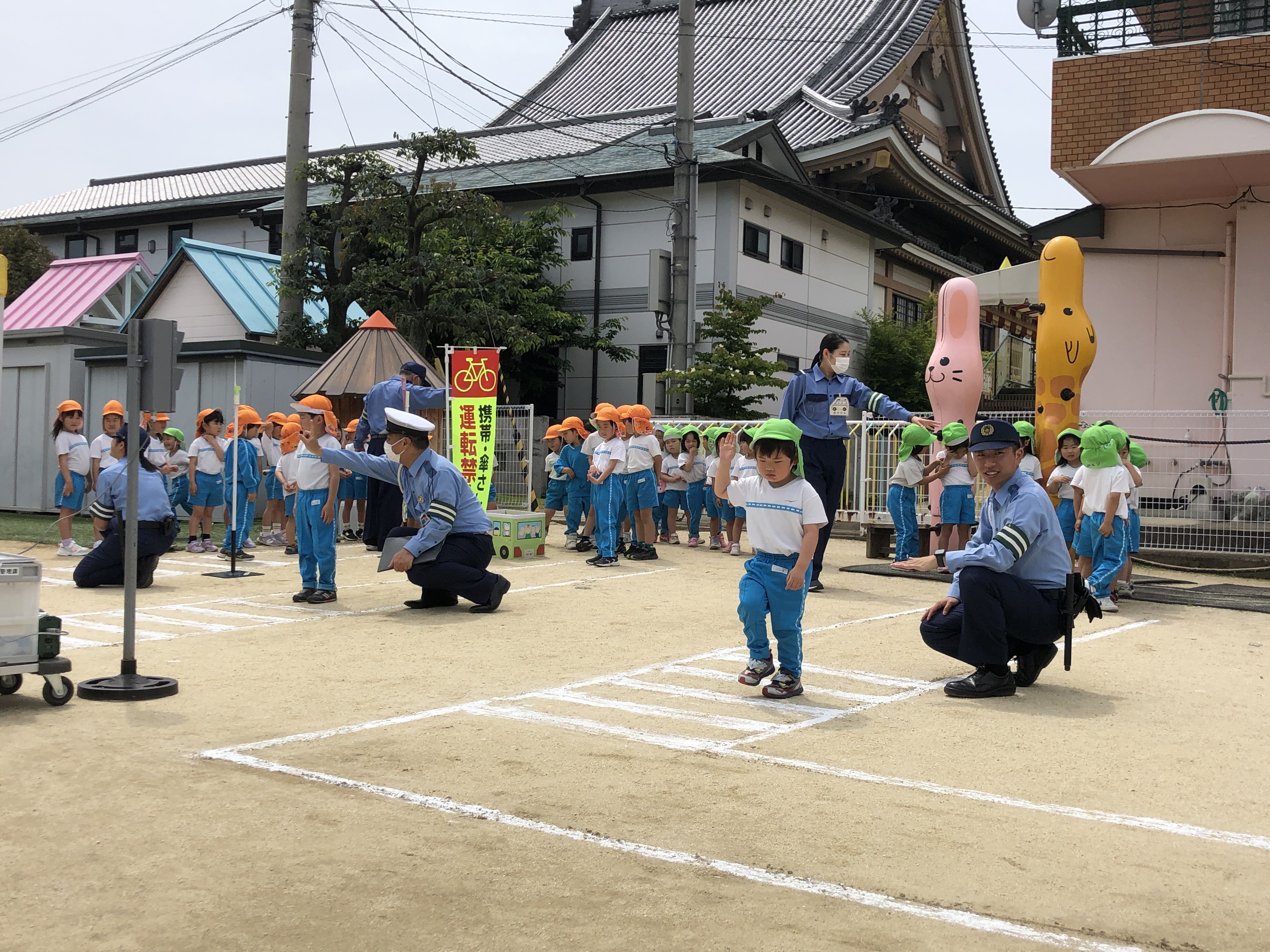 交通安全のお勉強、みんなよく頑張りました。今日ならったことを忘れないように、交通ルールを守って歩きましょう。『飛び出しは、絶対ダメ!』ですよ。