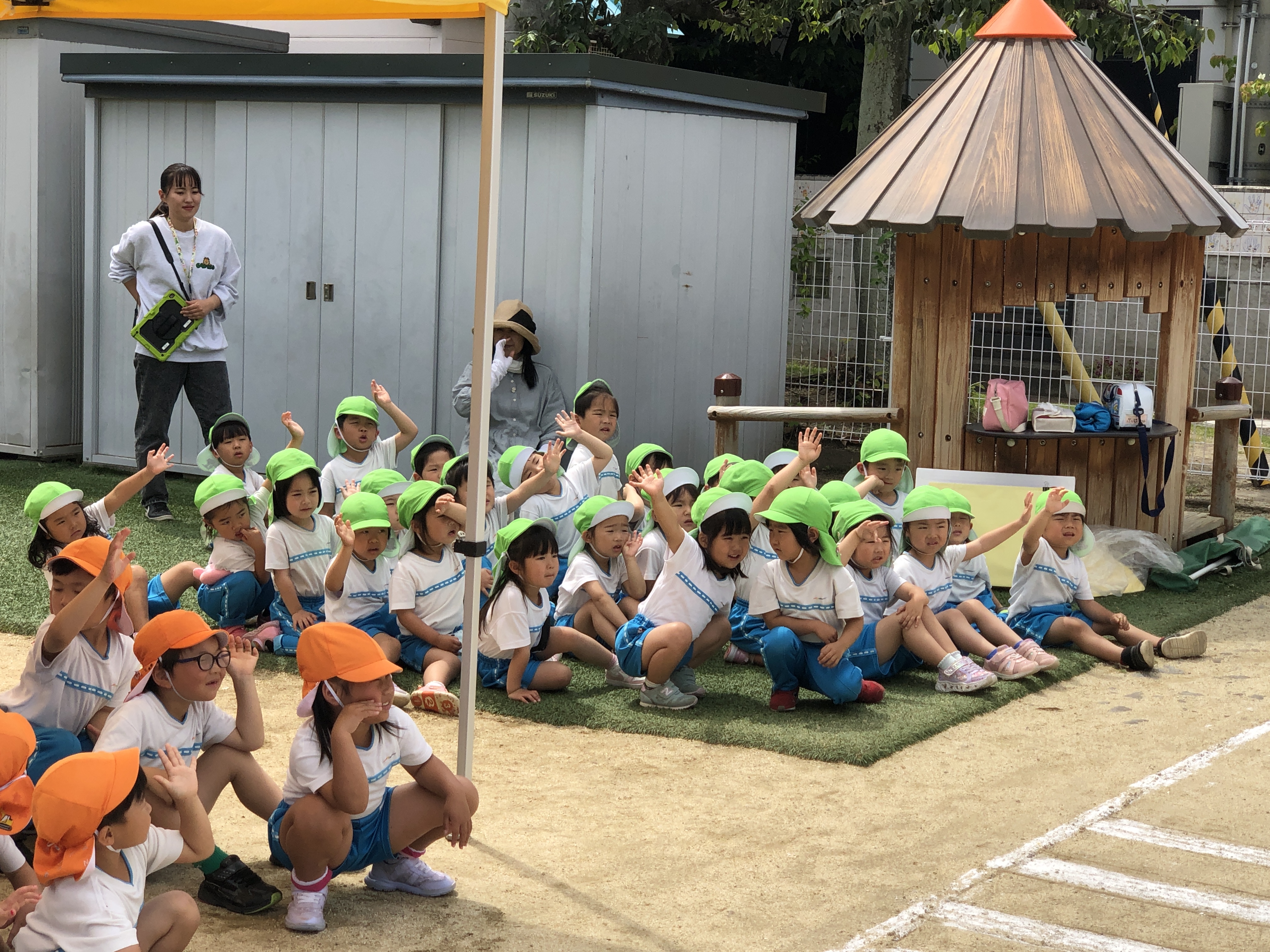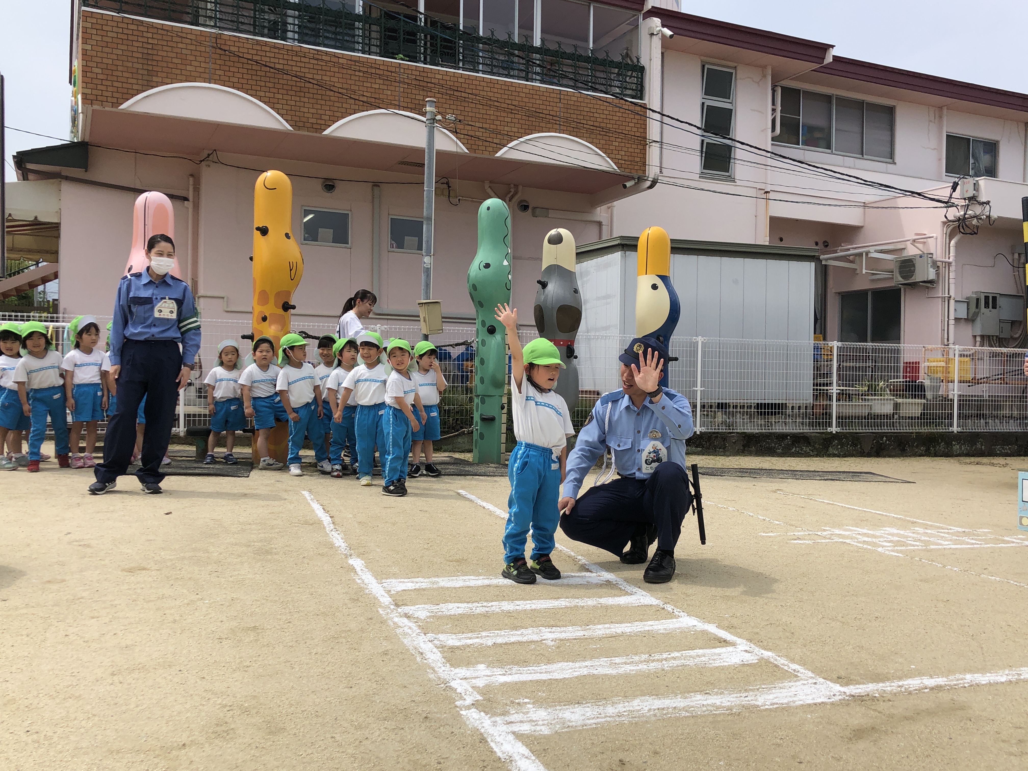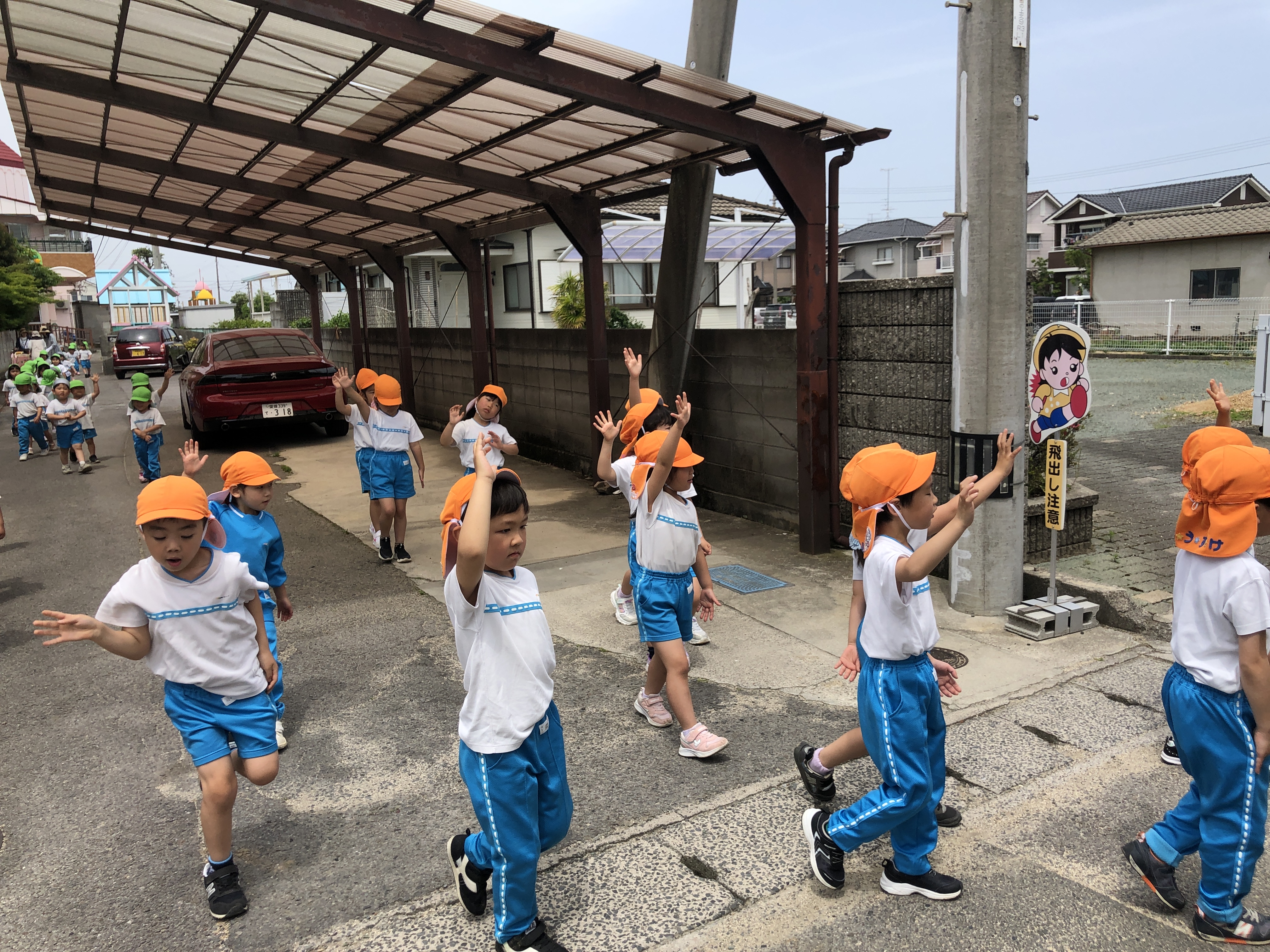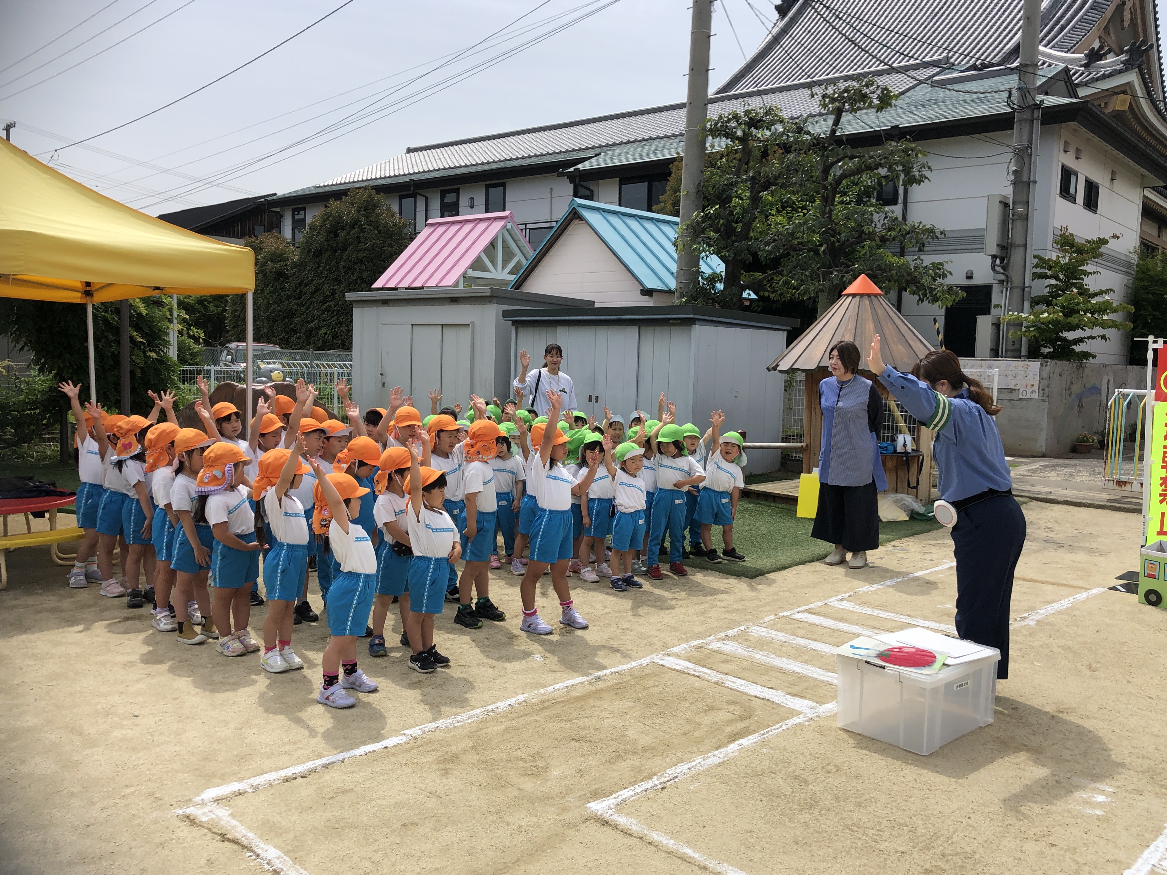 交通安全のお勉強、みんなよく頑張りました。今日ならったことを忘れないように、交通ルールを守って歩きましょう。『飛び出しは、絶対ダメ!』ですよ。