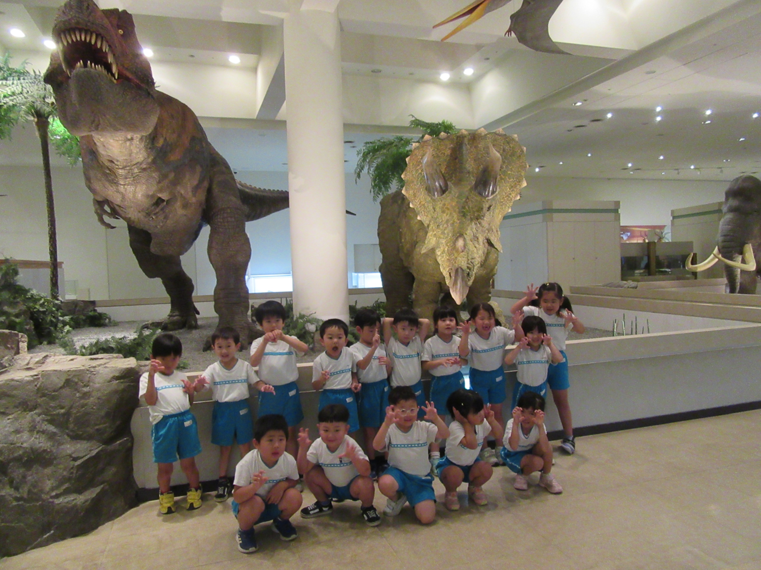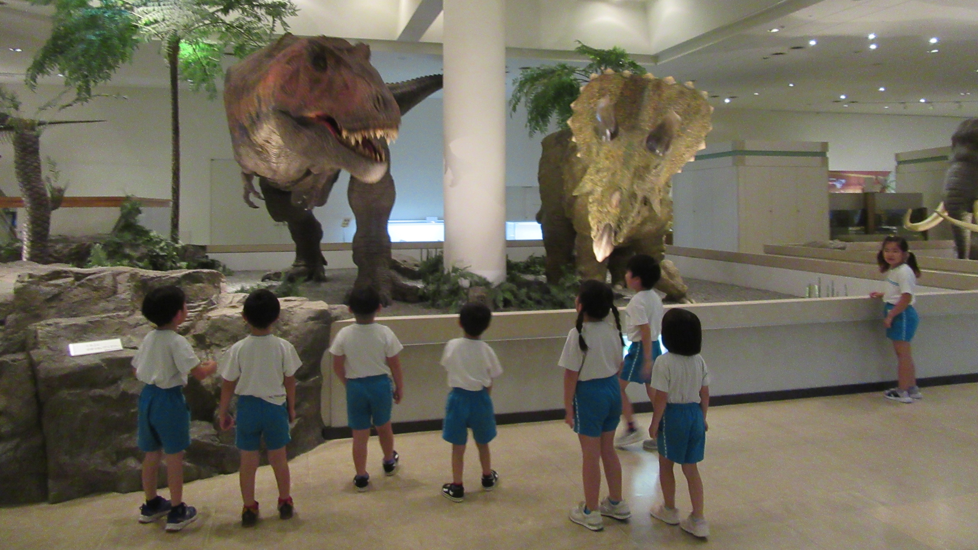 食事が終わった後は、楽しみにしていた恐竜を一番に見に行きました。ティラノサウルスにトリケラトプス、そしてプテラノドンが出迎えてくれました。