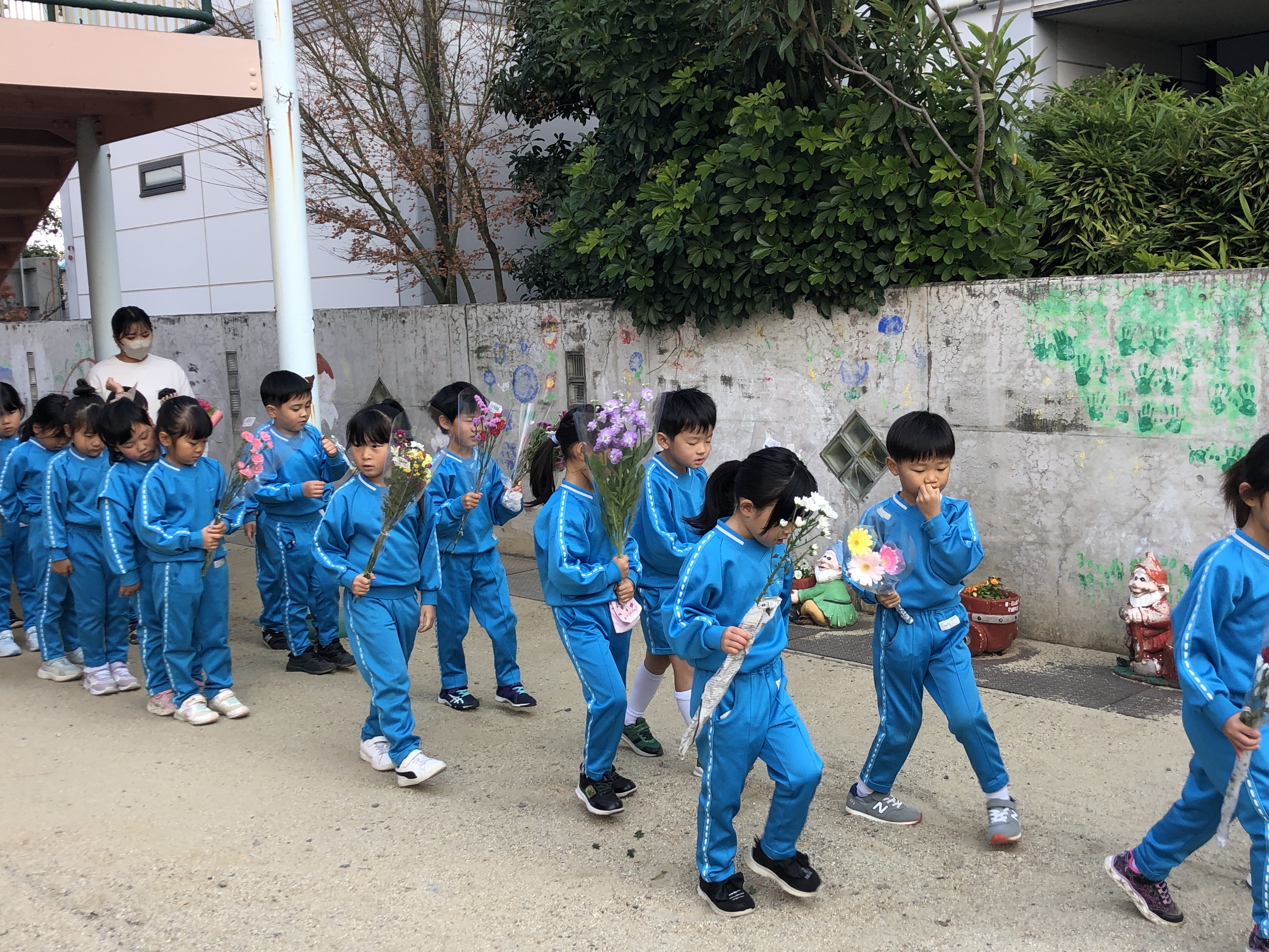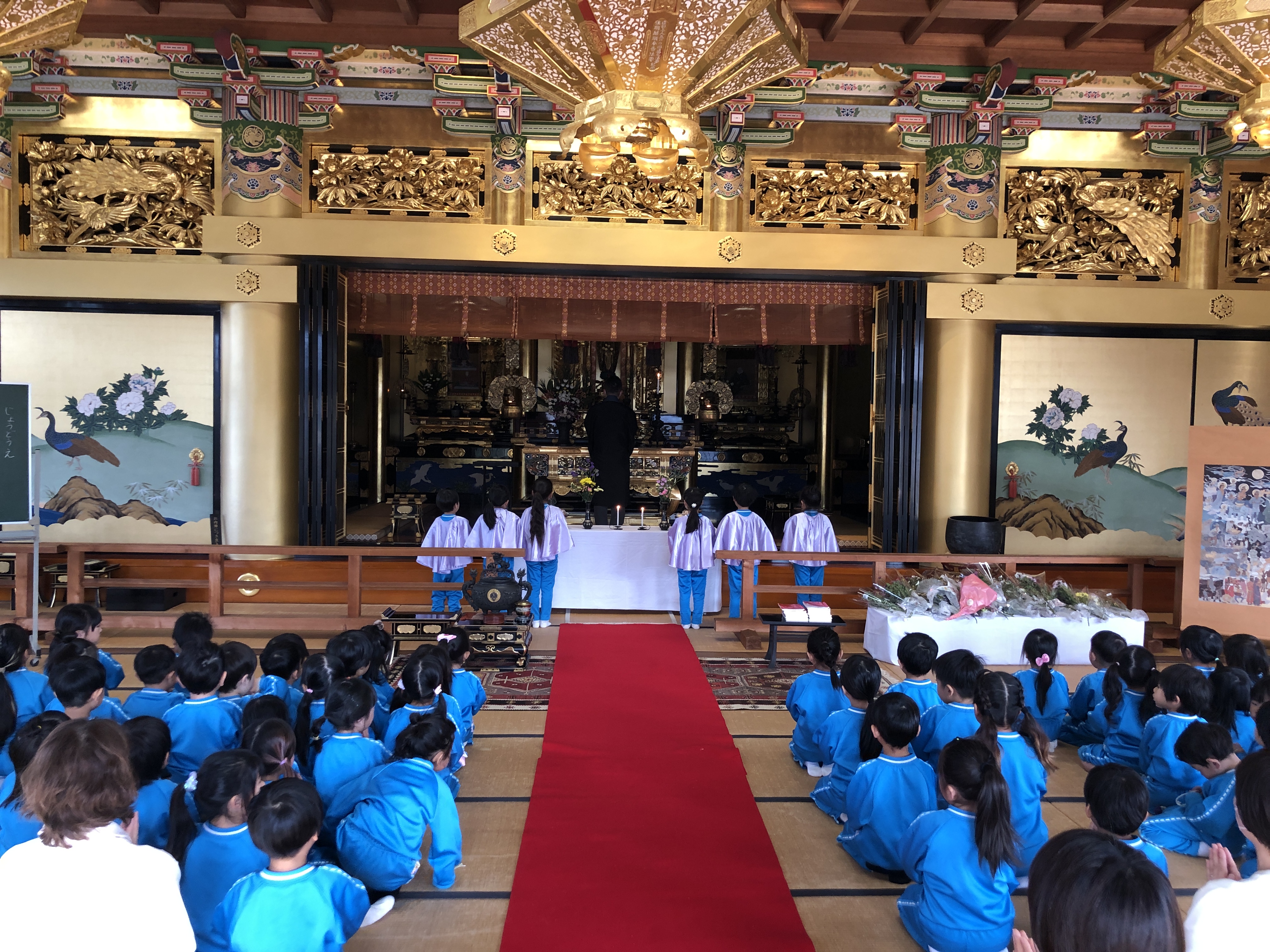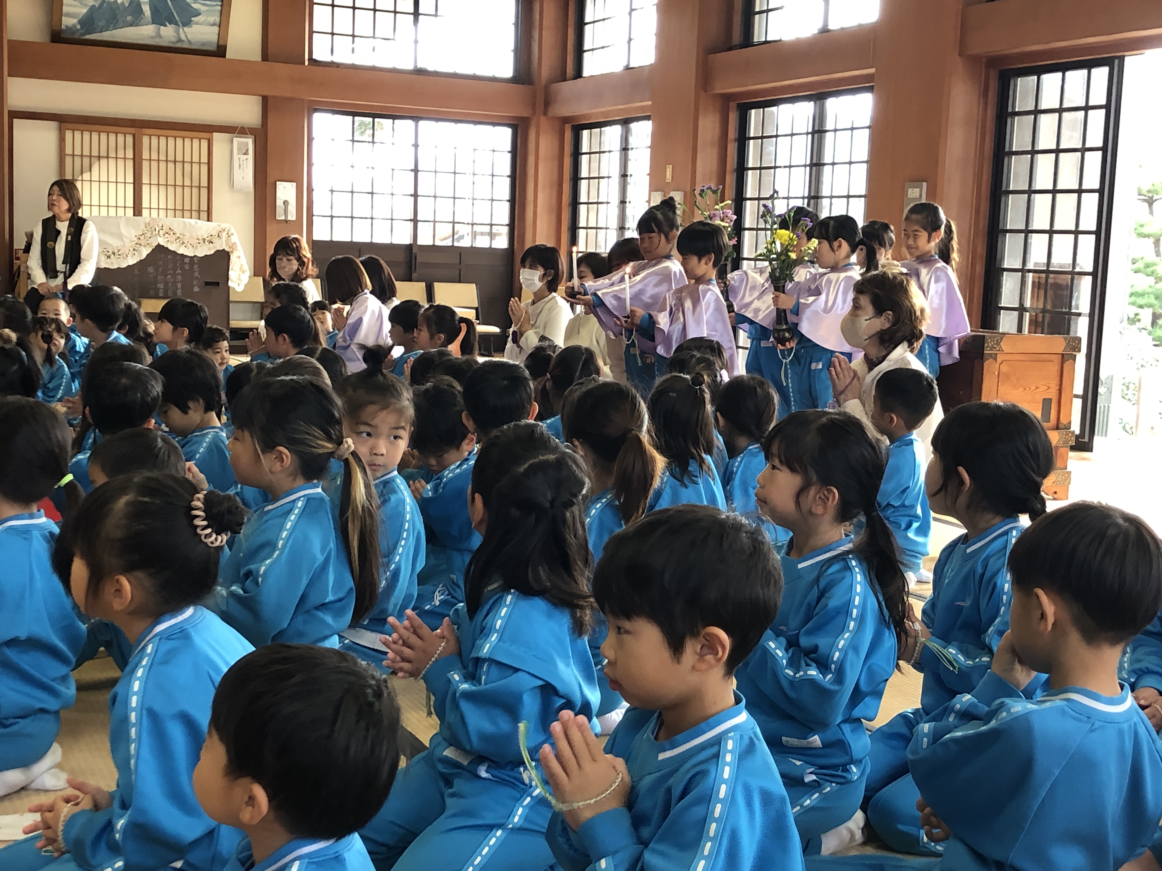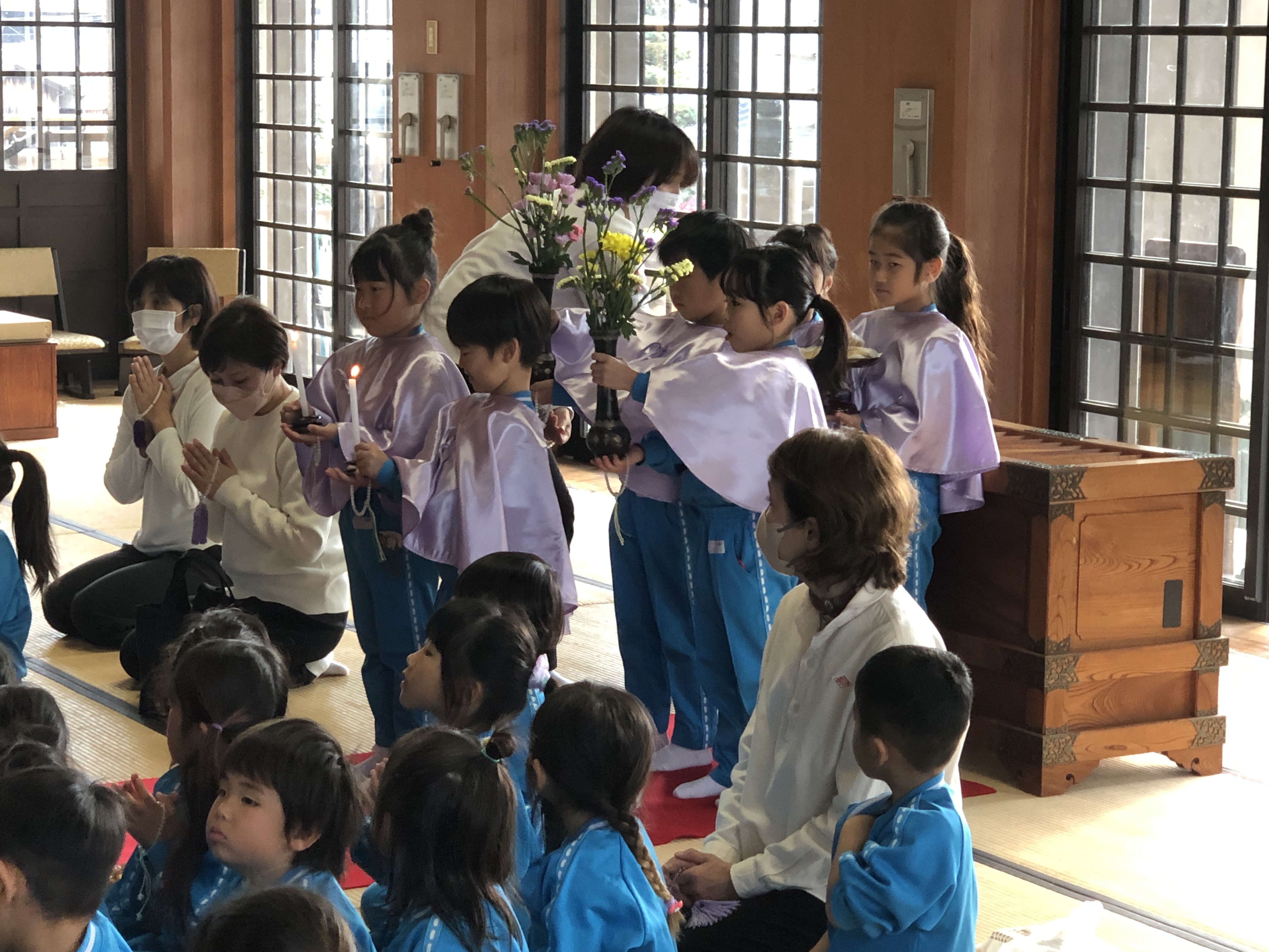 お花をお供えした後、園歌「めぐみのこども」や仏歌「成道会」を歌って、元気いっぱい 「お約束」を唱えます。