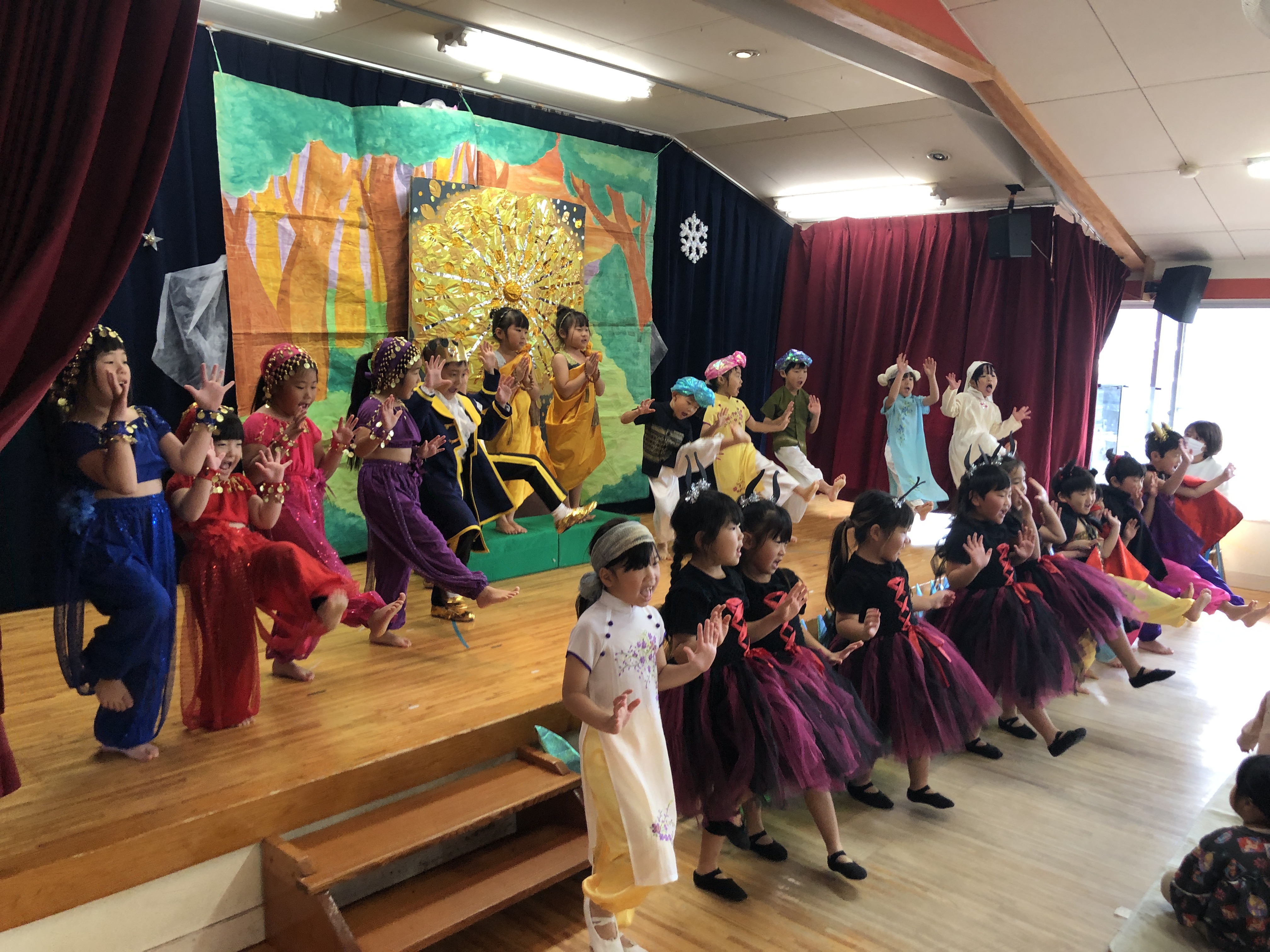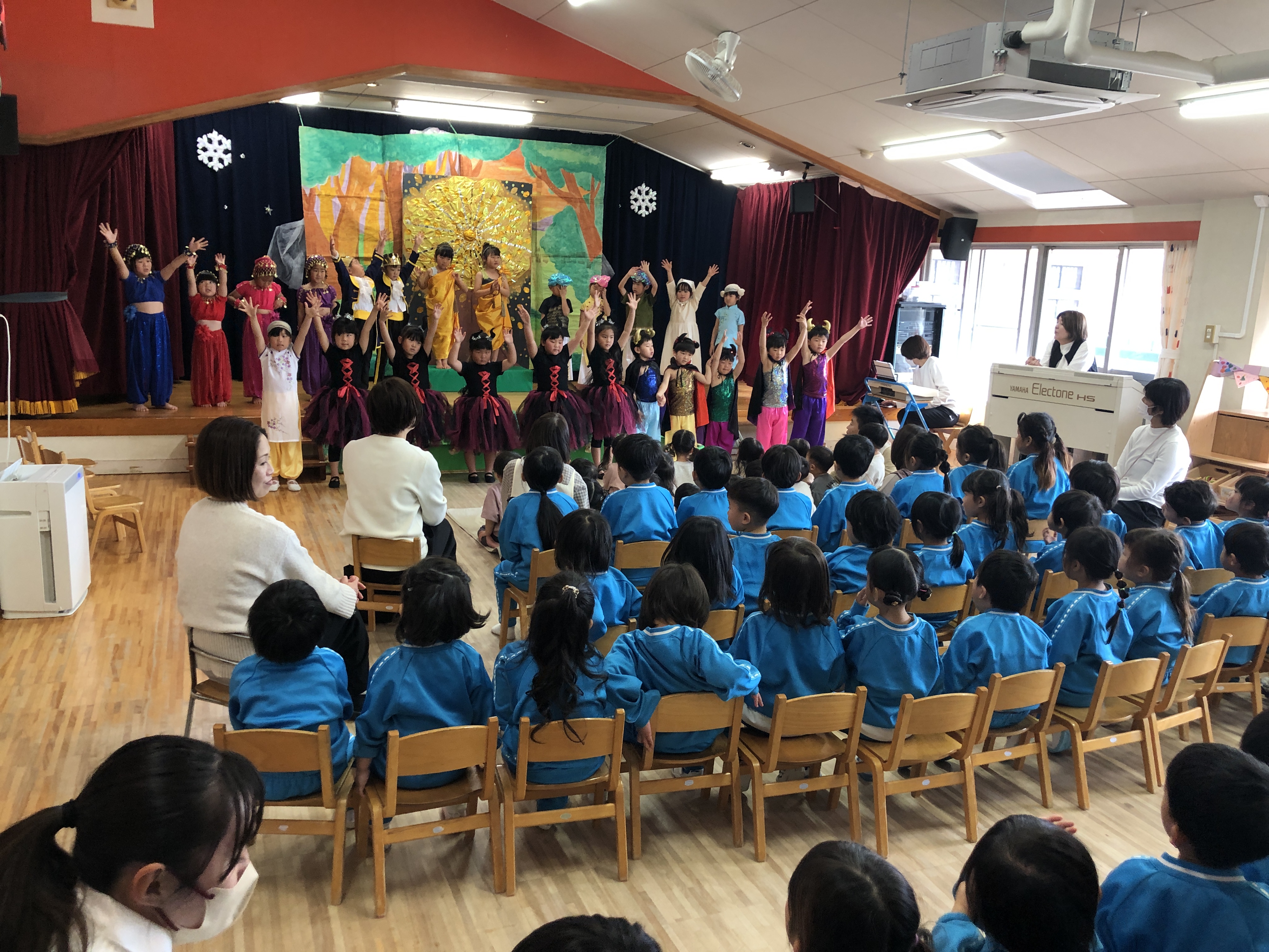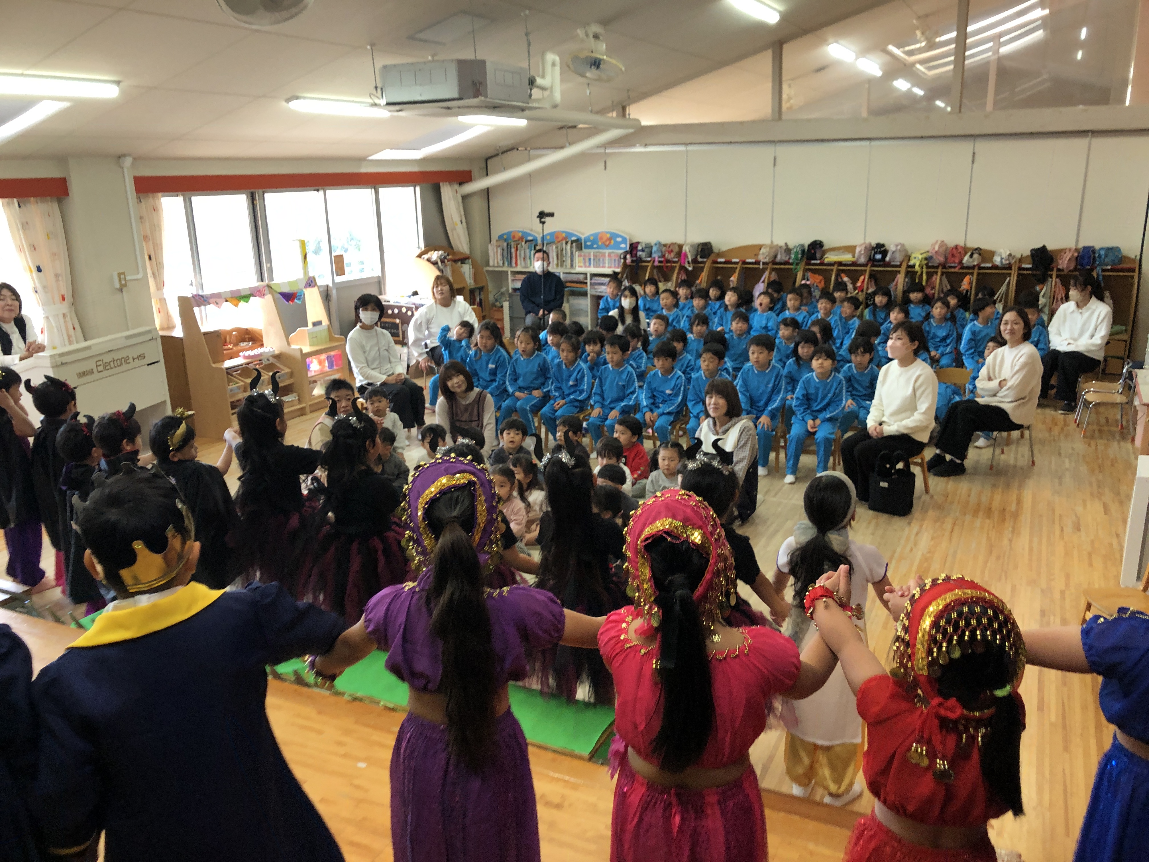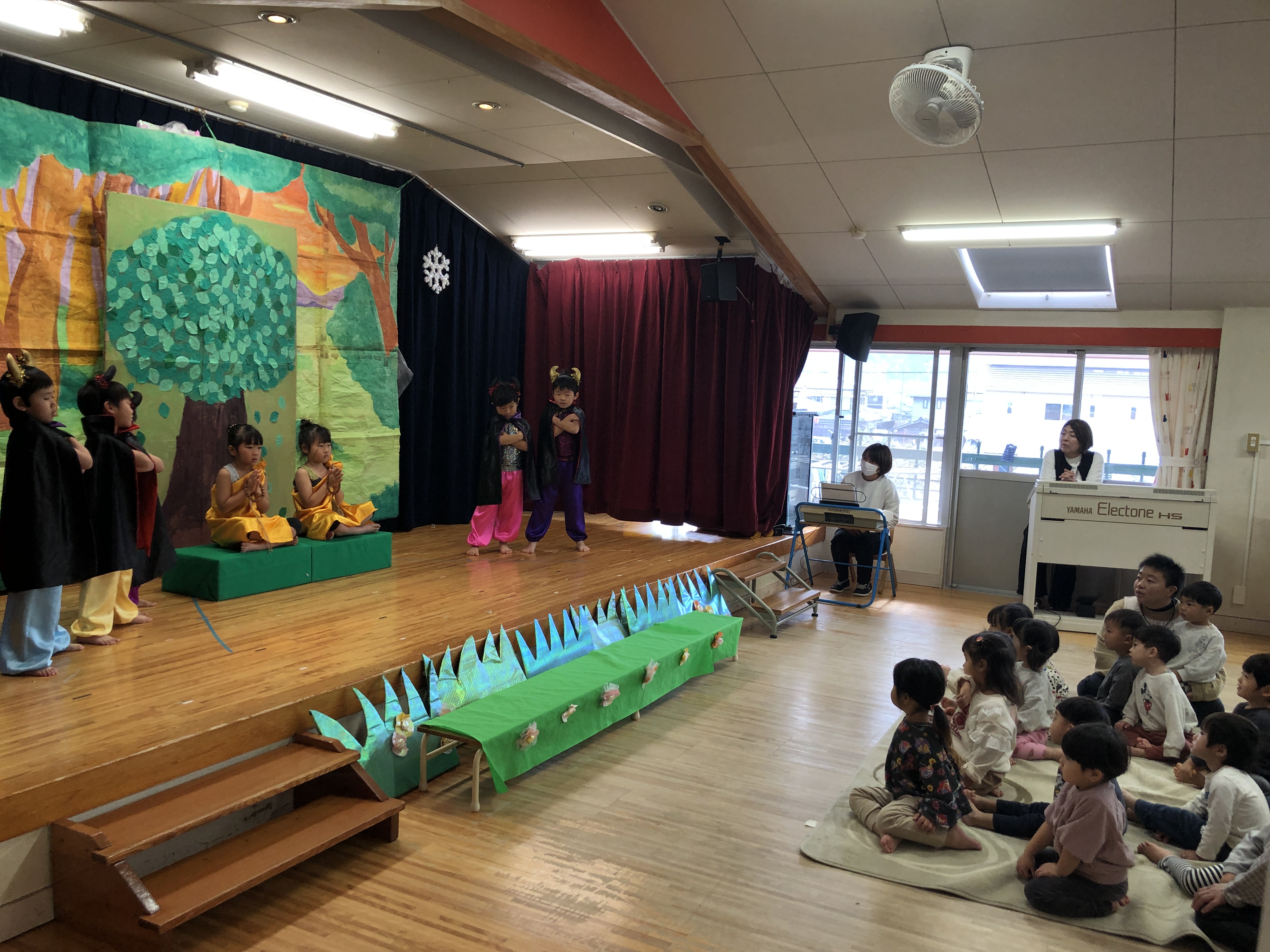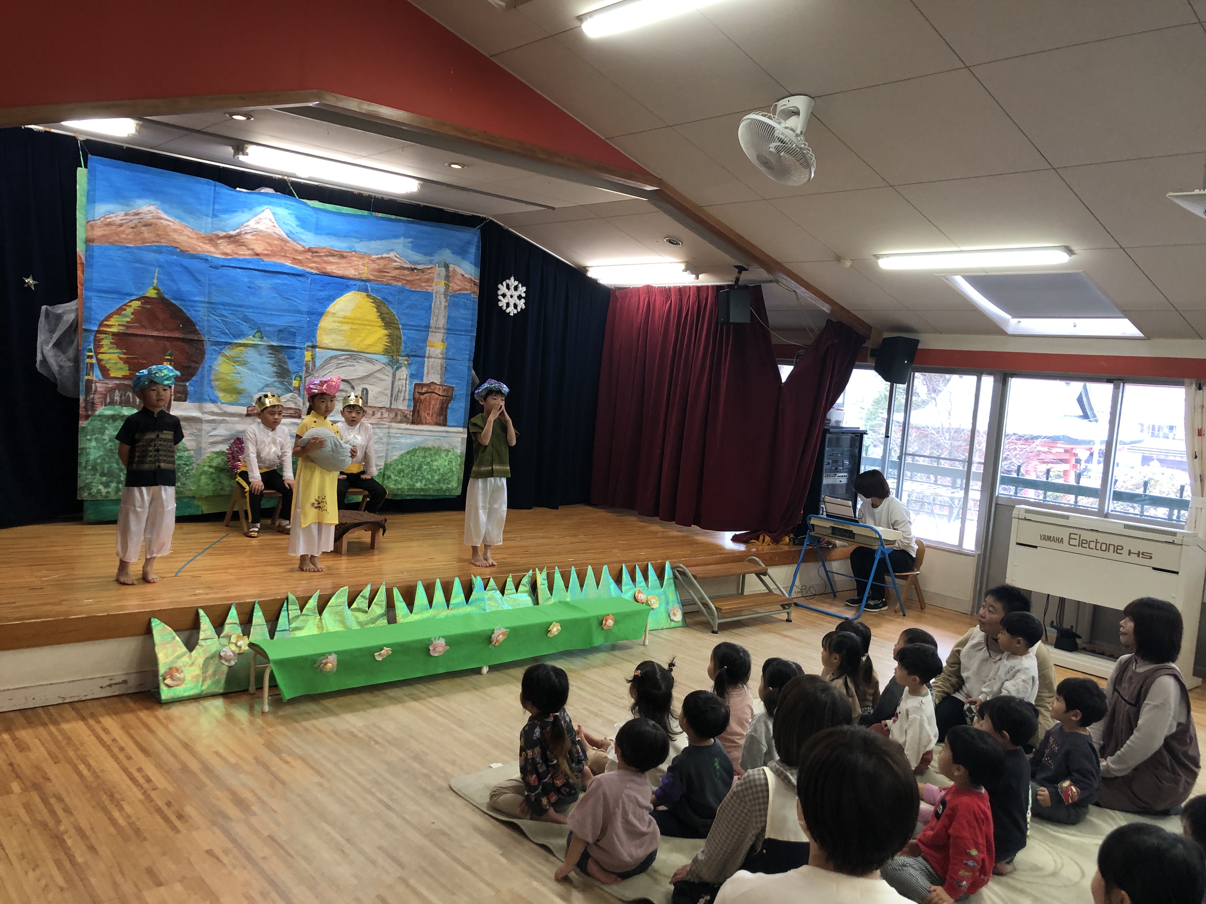 ダーナの後、さくら組(年長児)のお友だちが「おしゃかさまミュージカル」を披露し、お釈迦さまが悟りを開かれた成道会について、ルンビニのお友だちやめぐみのお友だち(2歳児以上)に、分かりやすく伝えてくれました。
