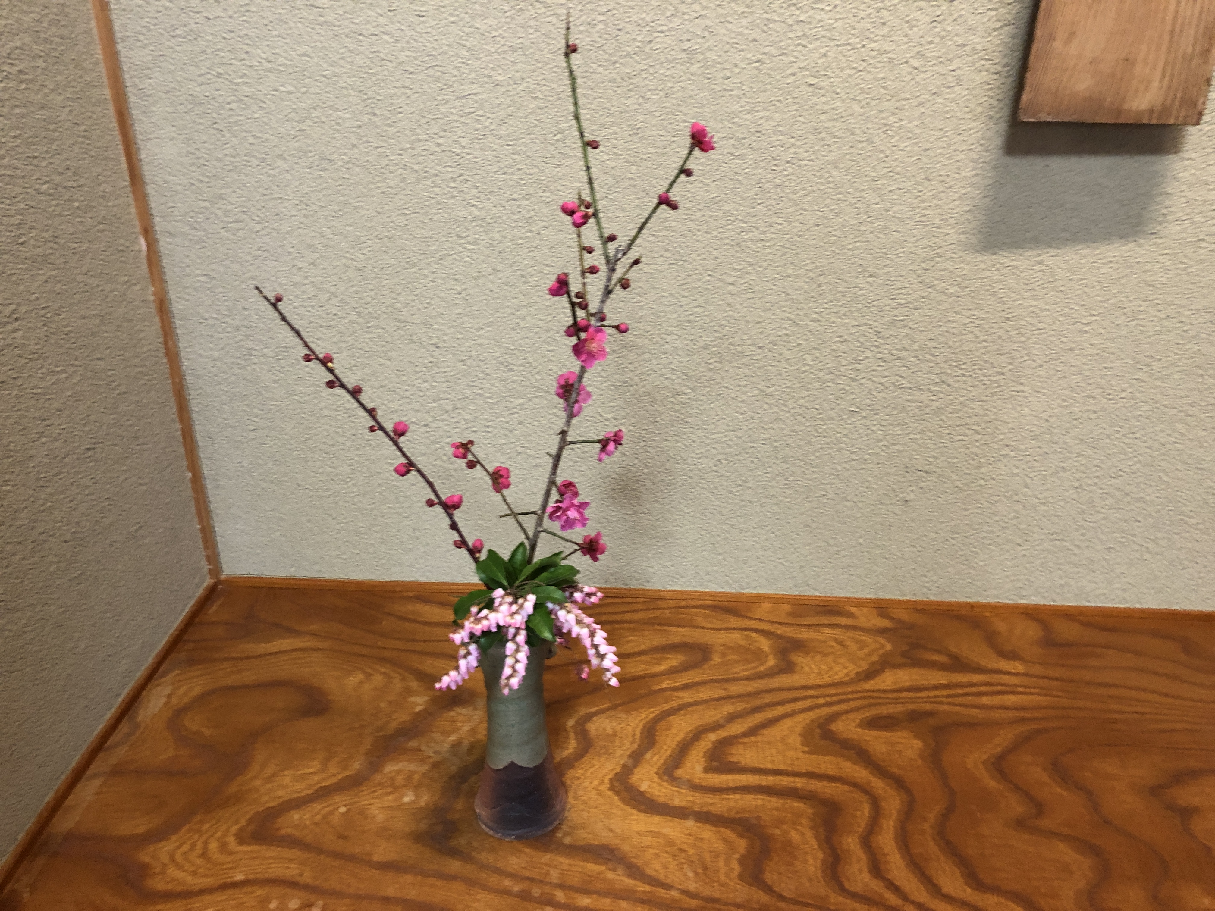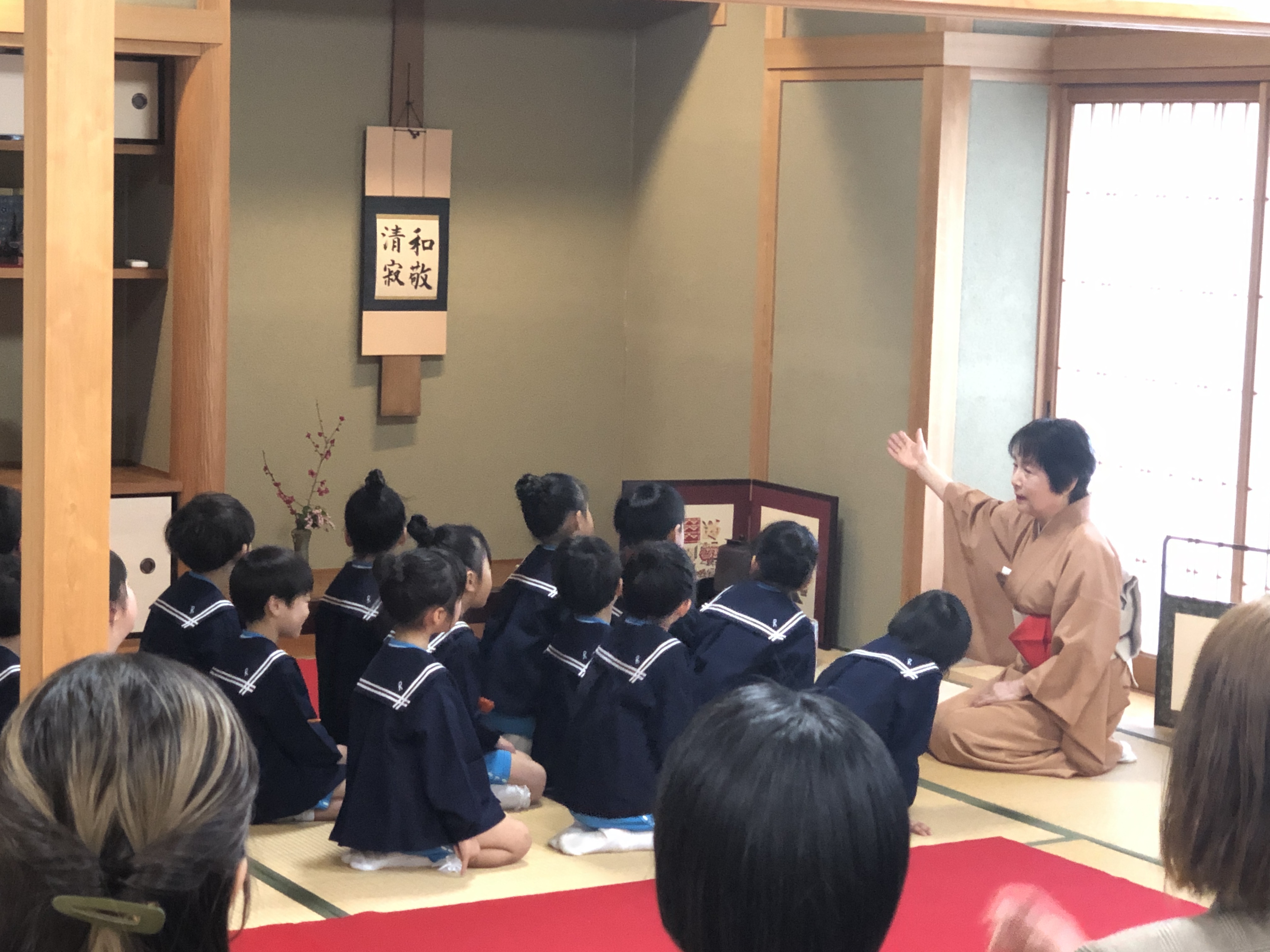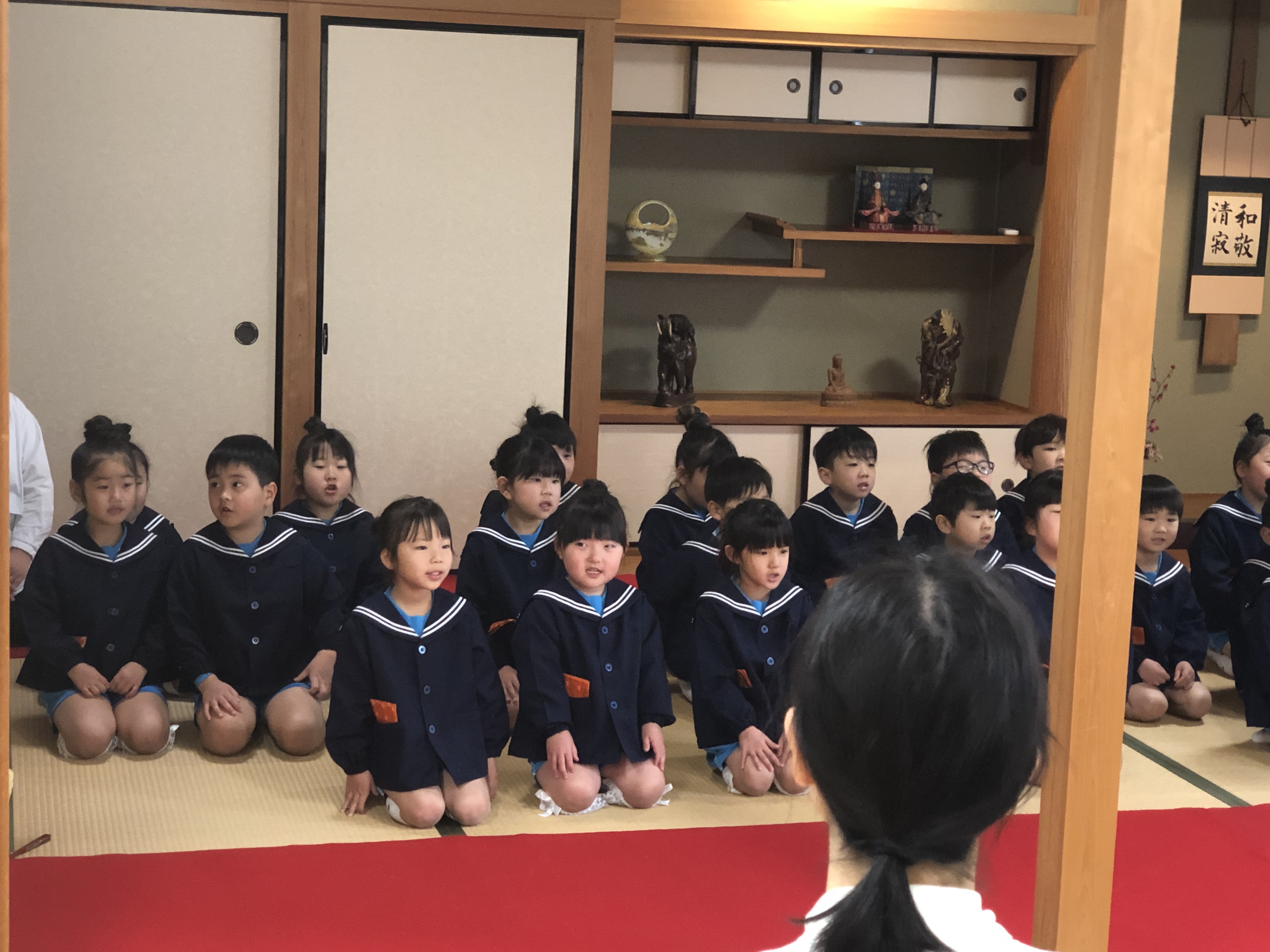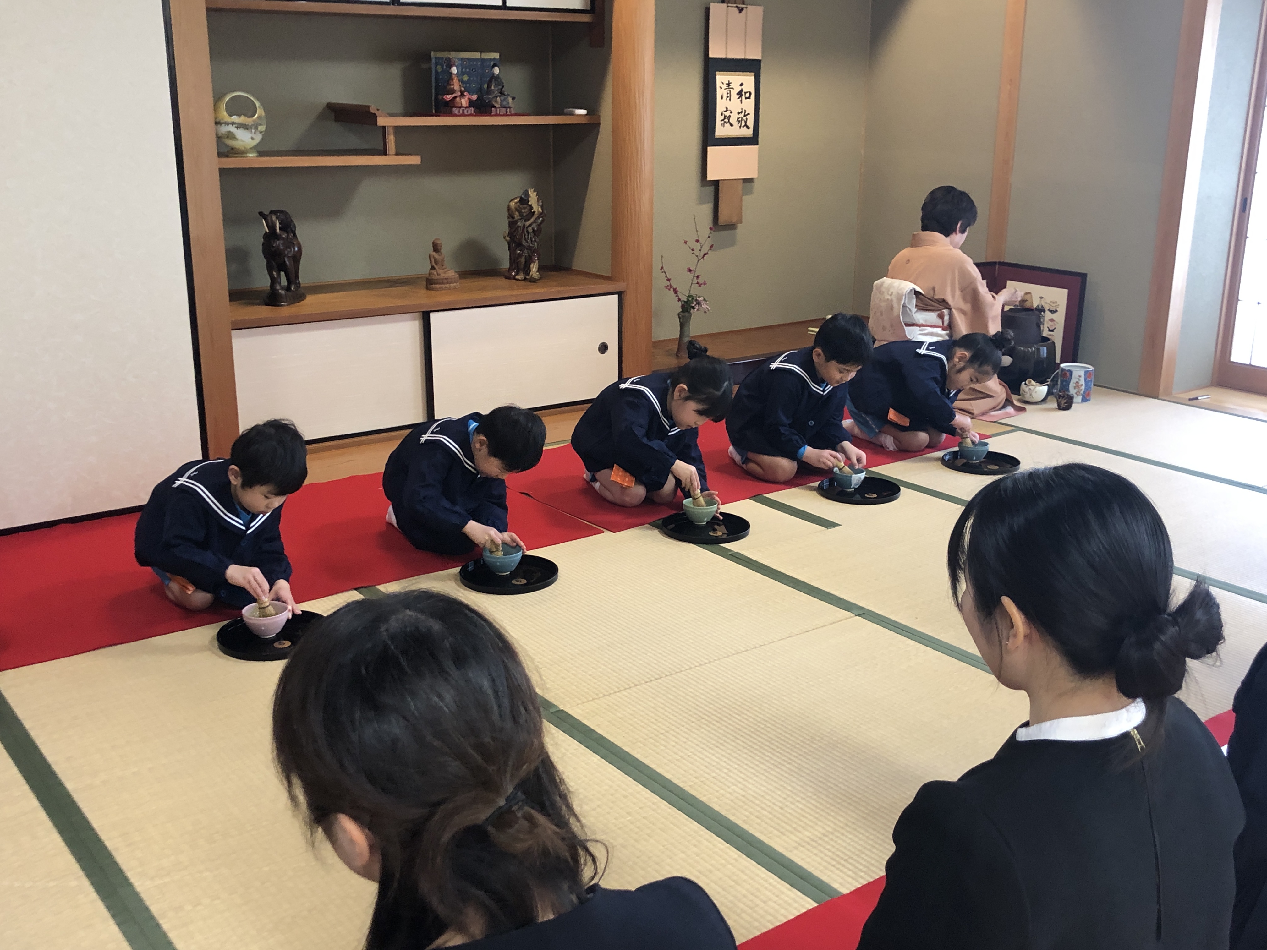 いよいよ卒園茶会の始まりです。お客さまをお迎えする季節の花は、明るい春を告げる紅梅、鈴のような小さな花をたくさんつけた馬酔木の花。茶道の精神である「和敬清寂」の意味をみんなで唱和します。