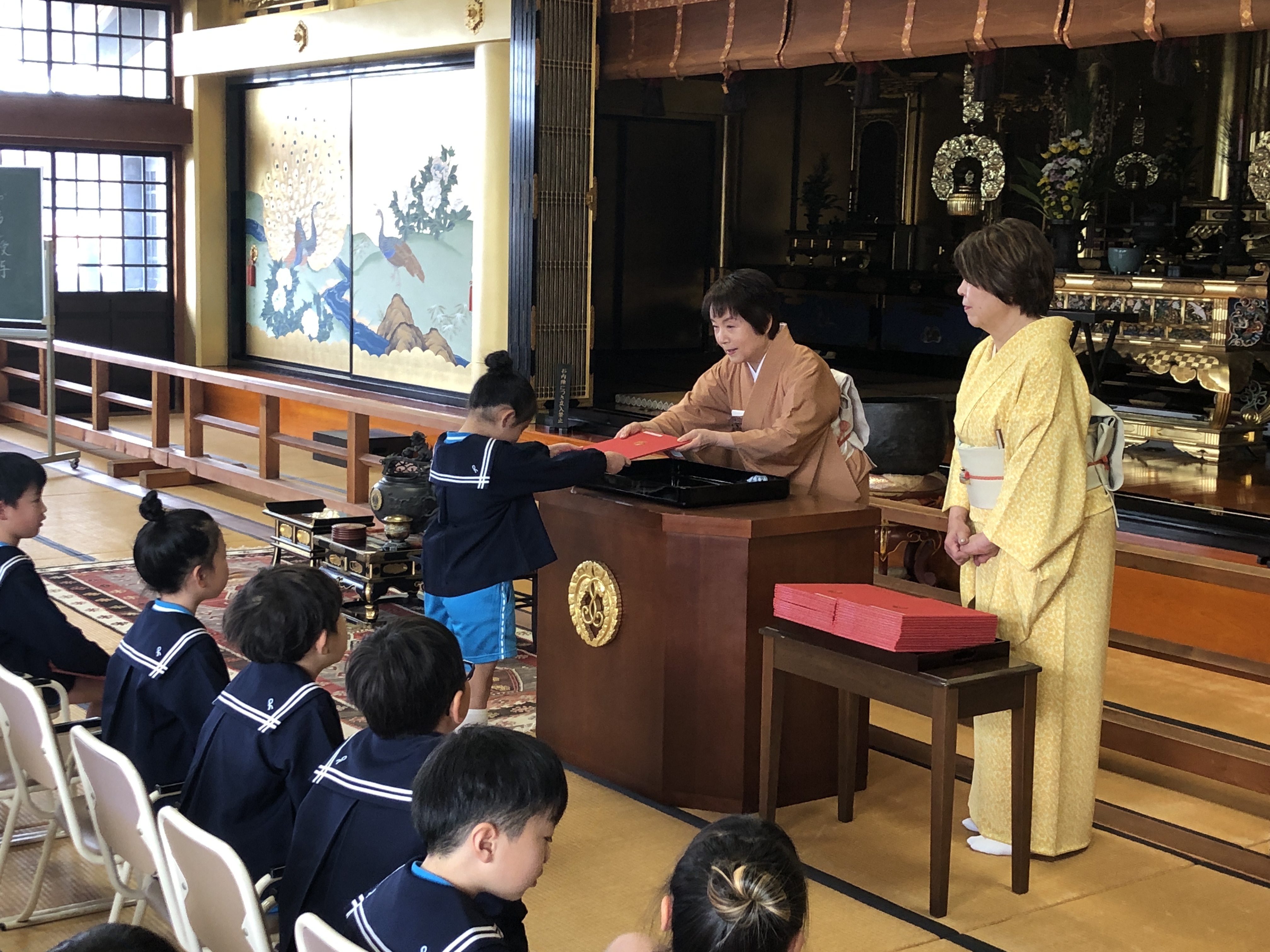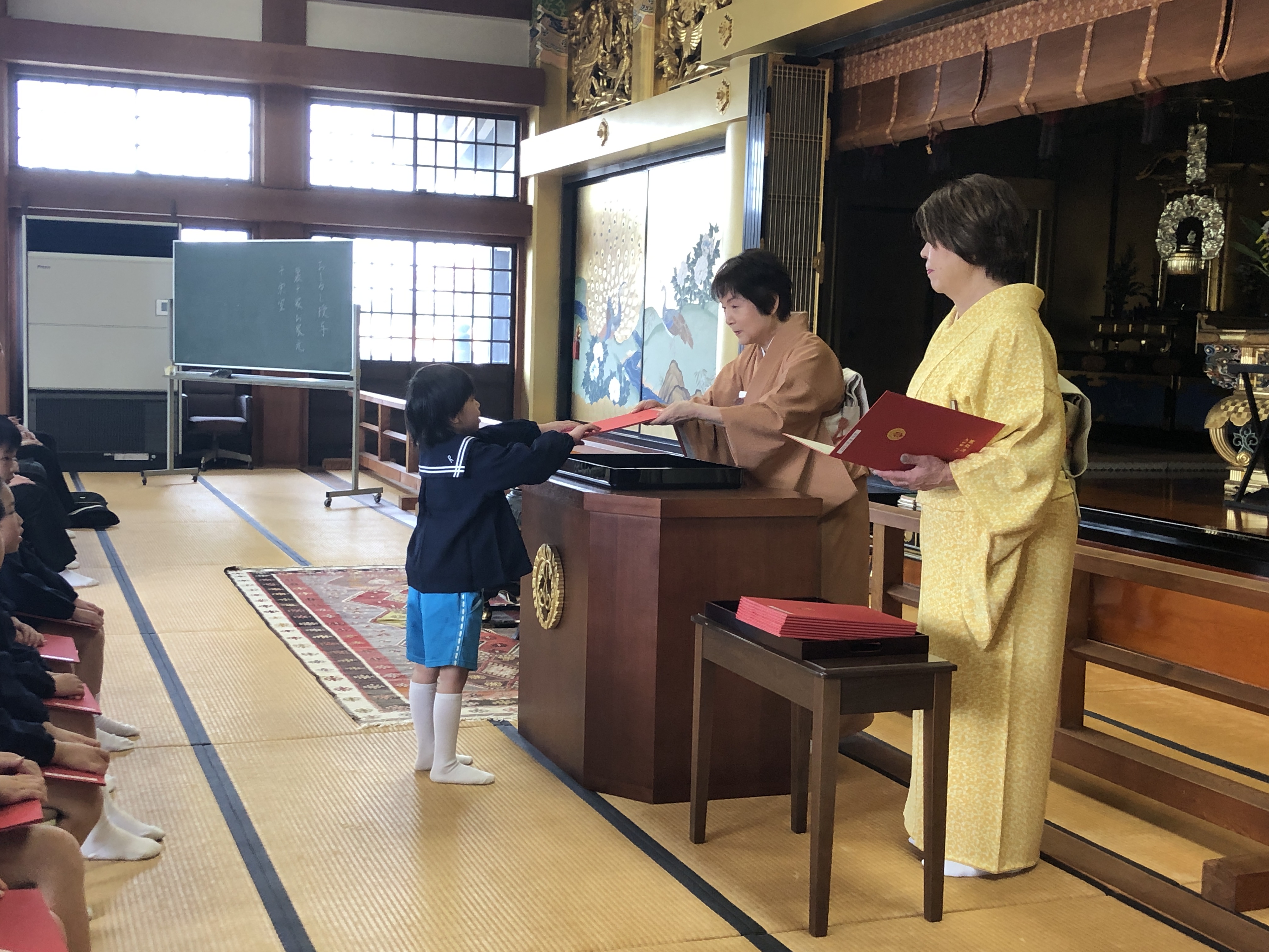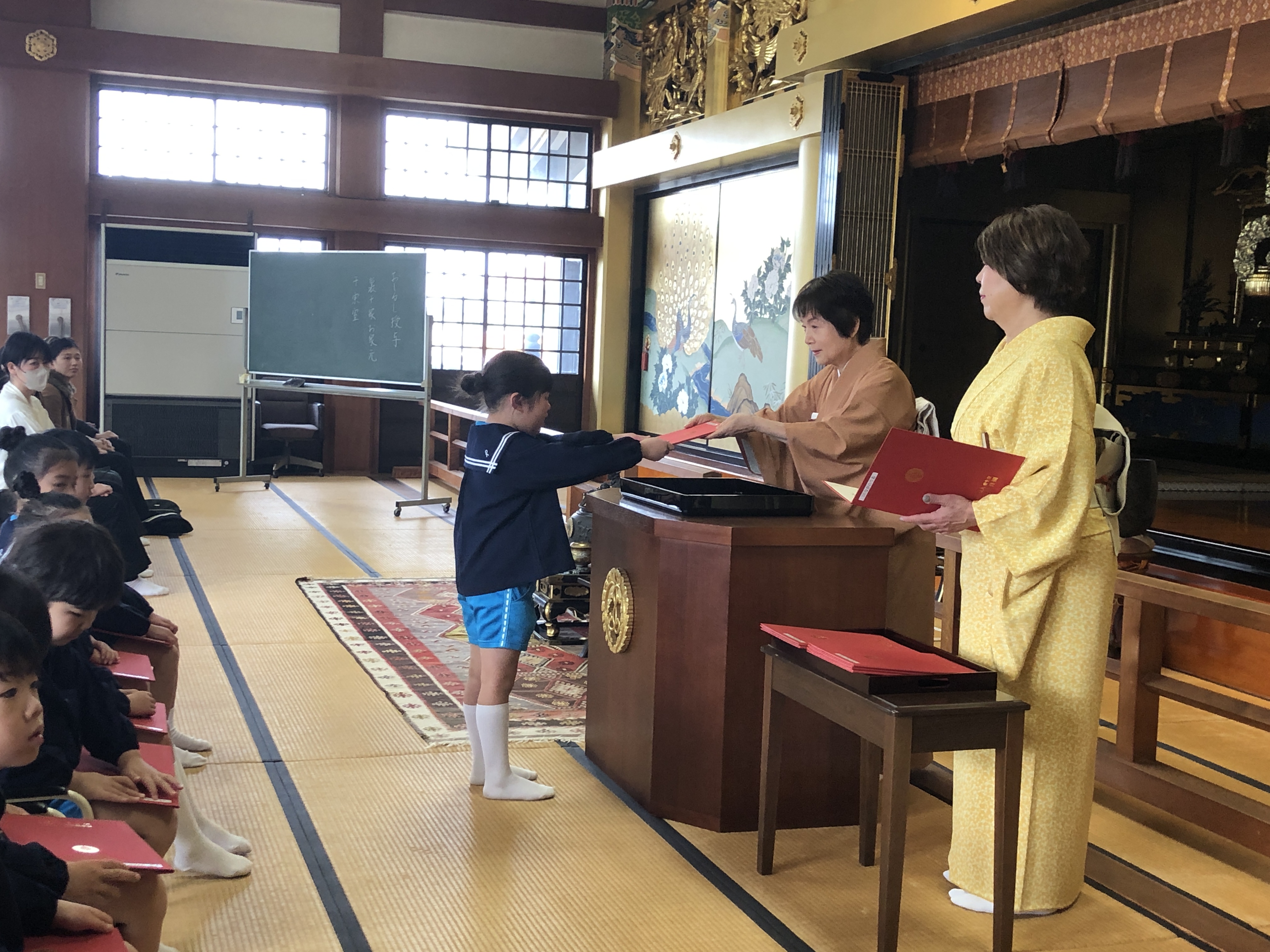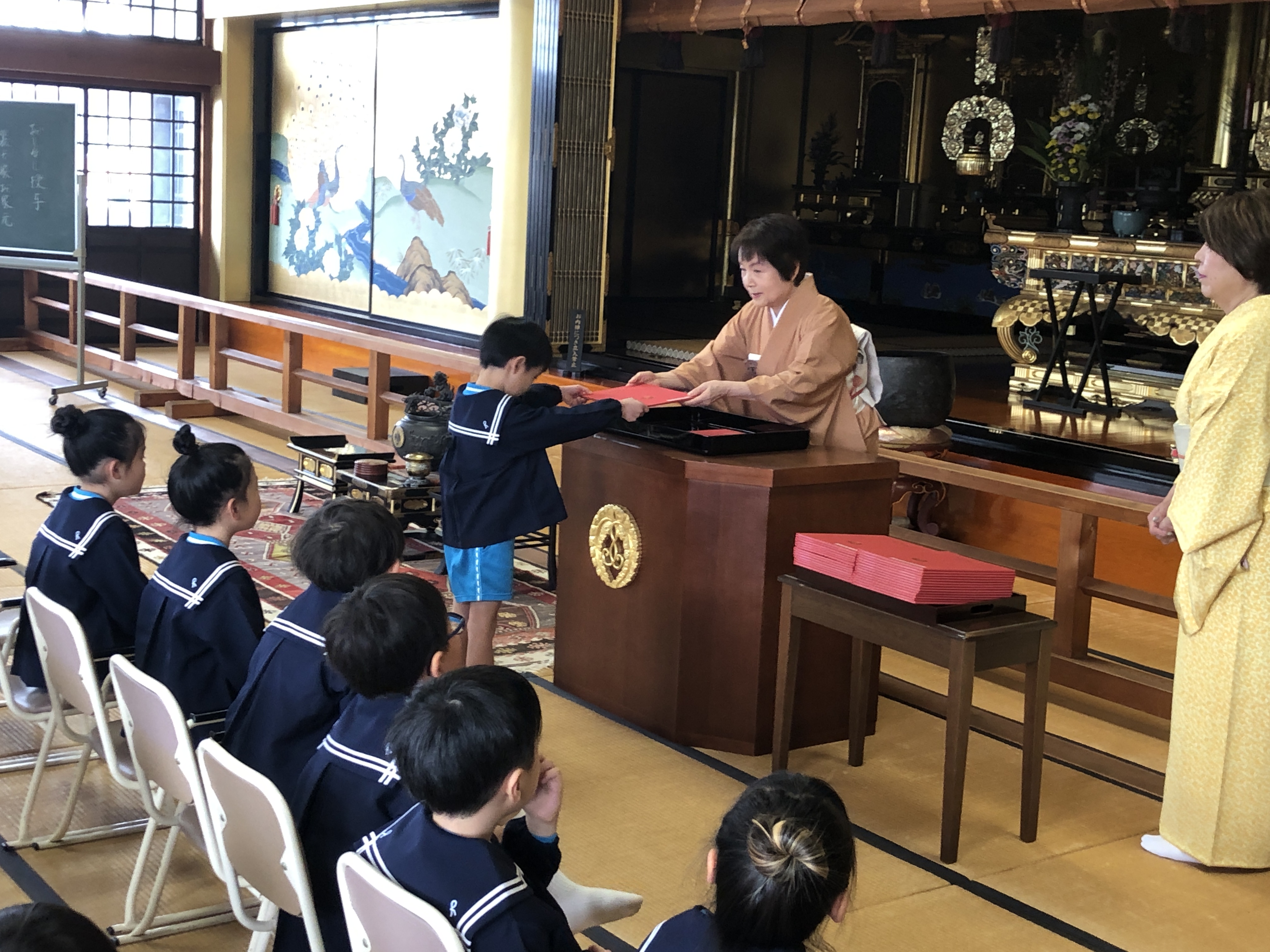 はじめに、裏千家家元からいただいた「おしるし」の授与が本堂で行われました。茶道講師の乗山先生から一人一人におしるしが授与されると、少し緊張しながらも「ありがとうございます。」と元気な声で感謝の気持ちを伝えることができました。