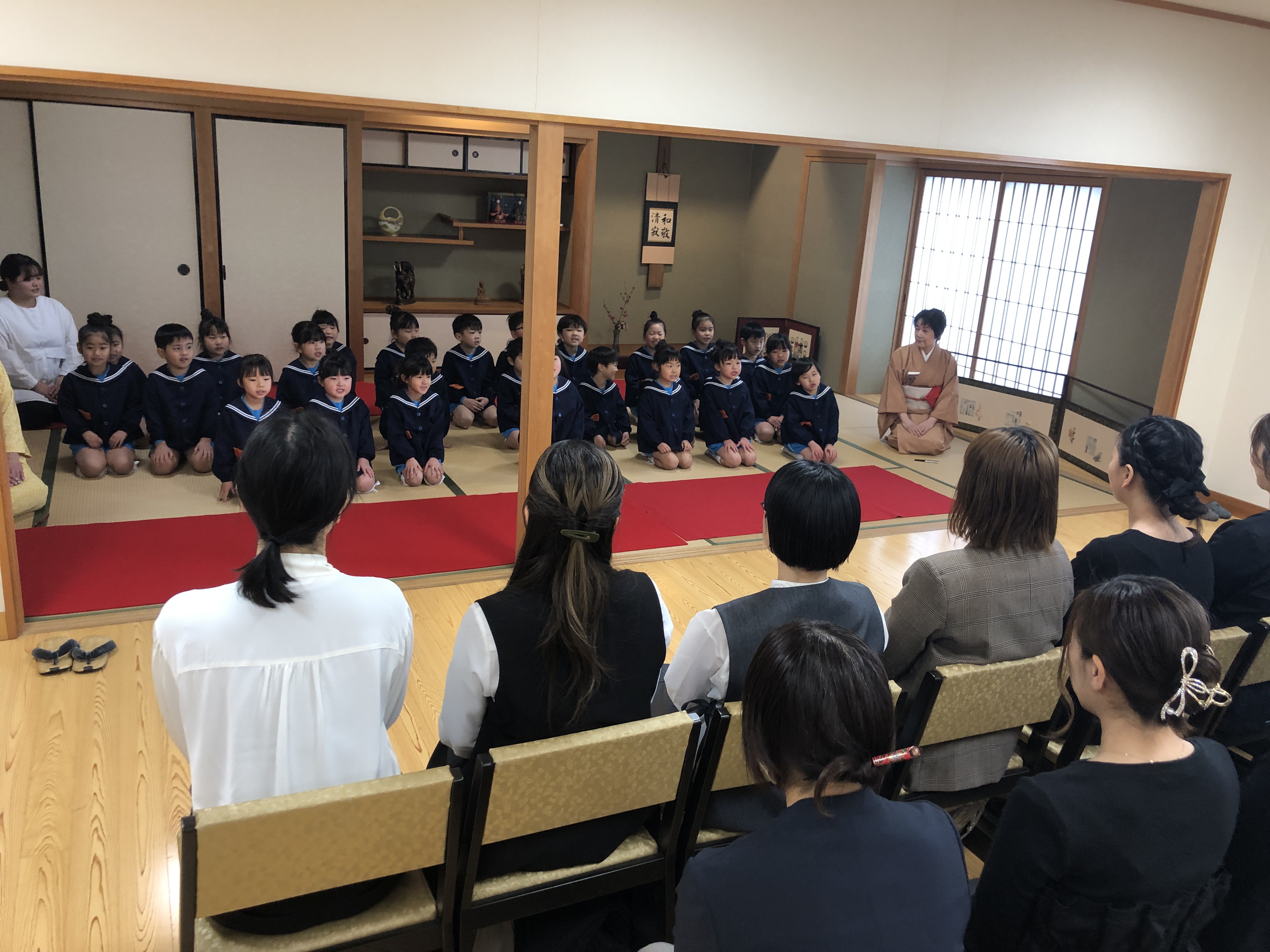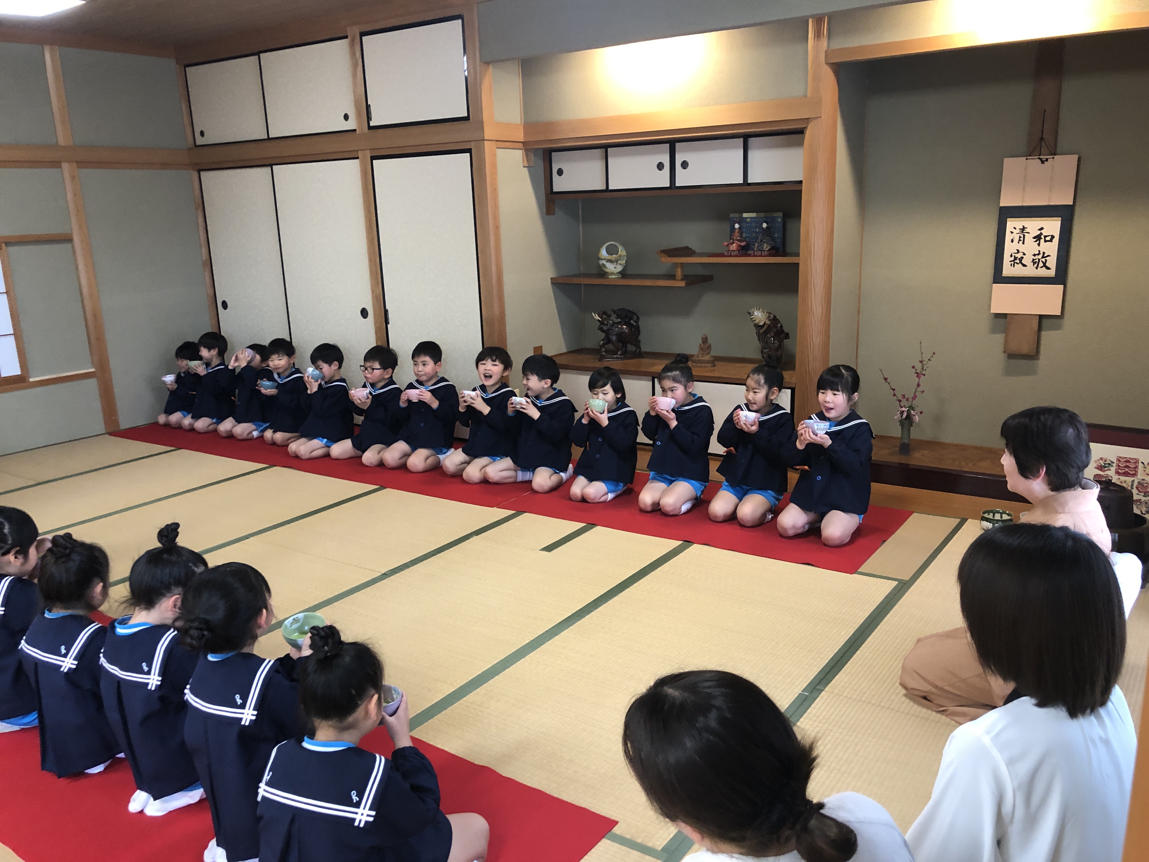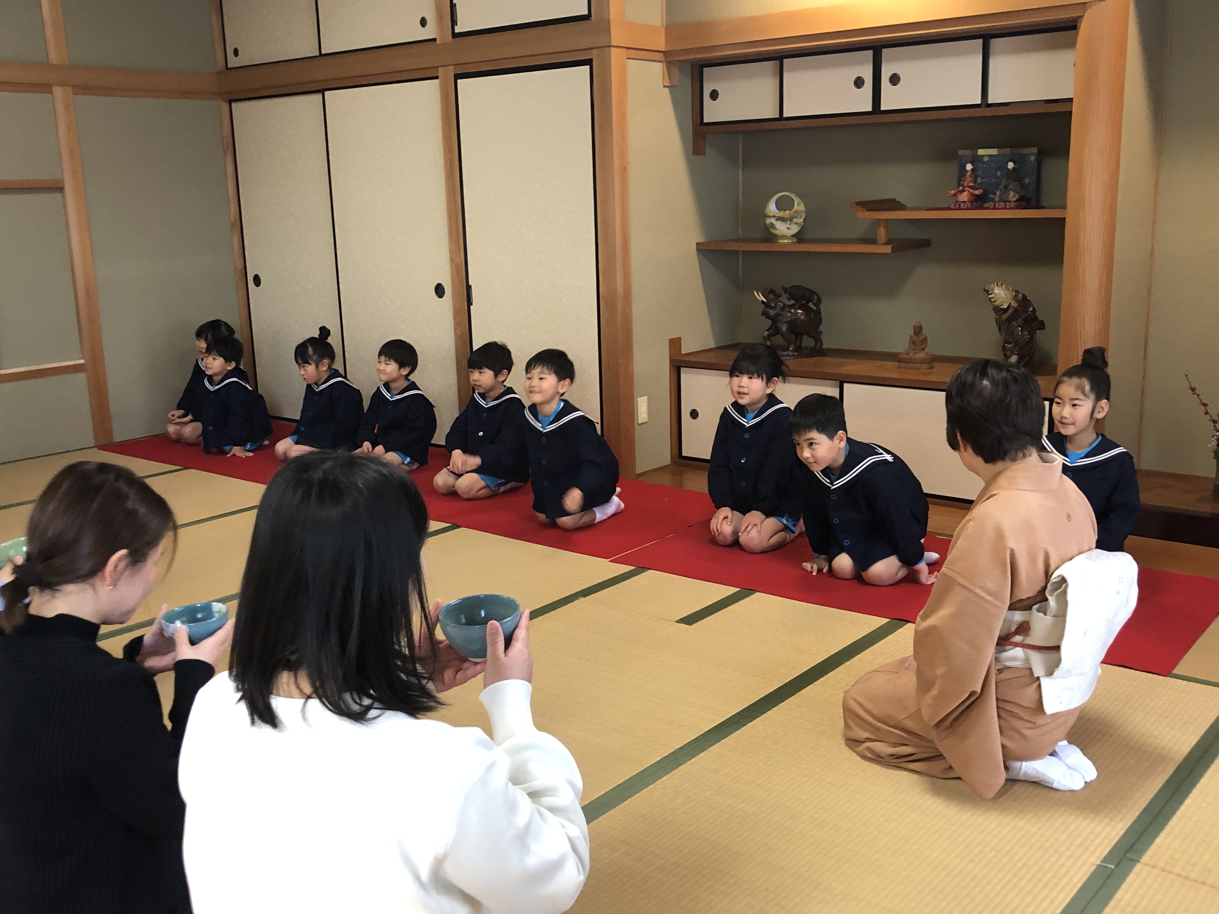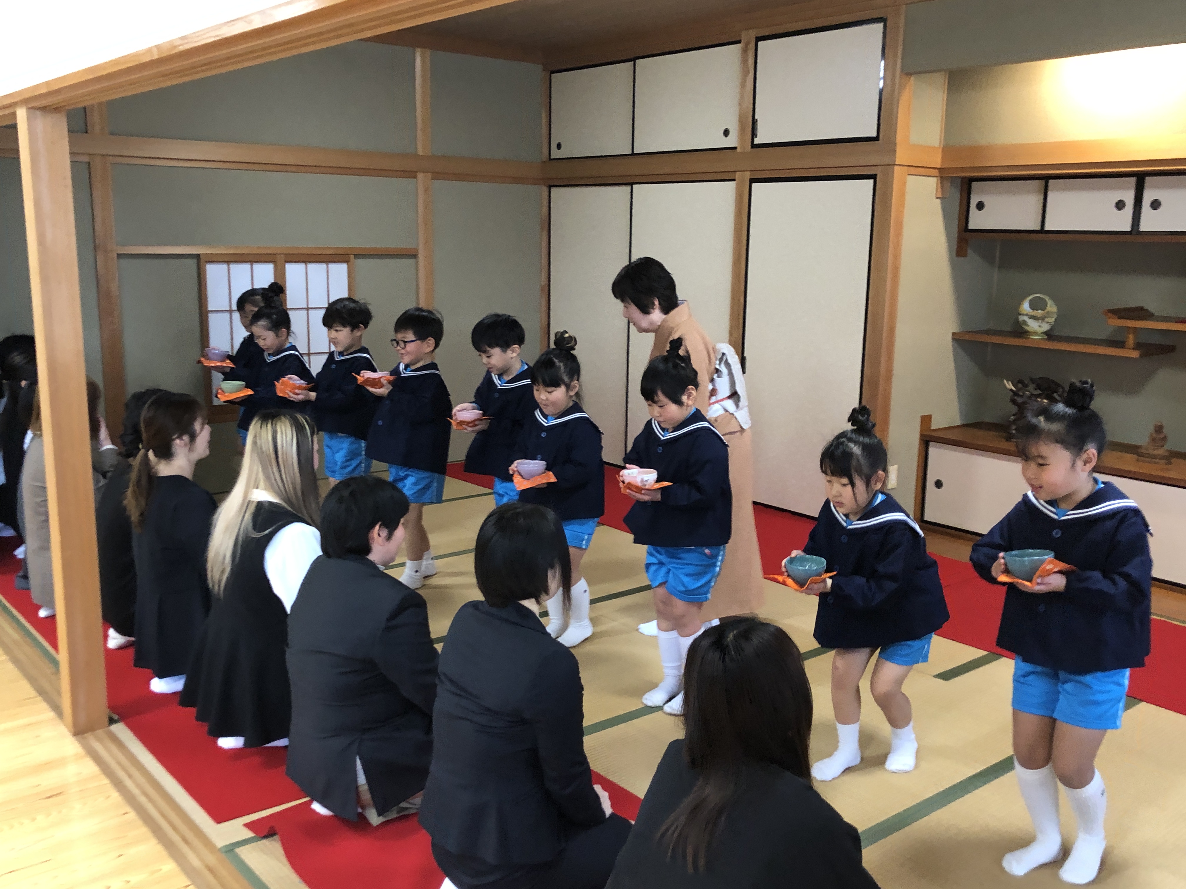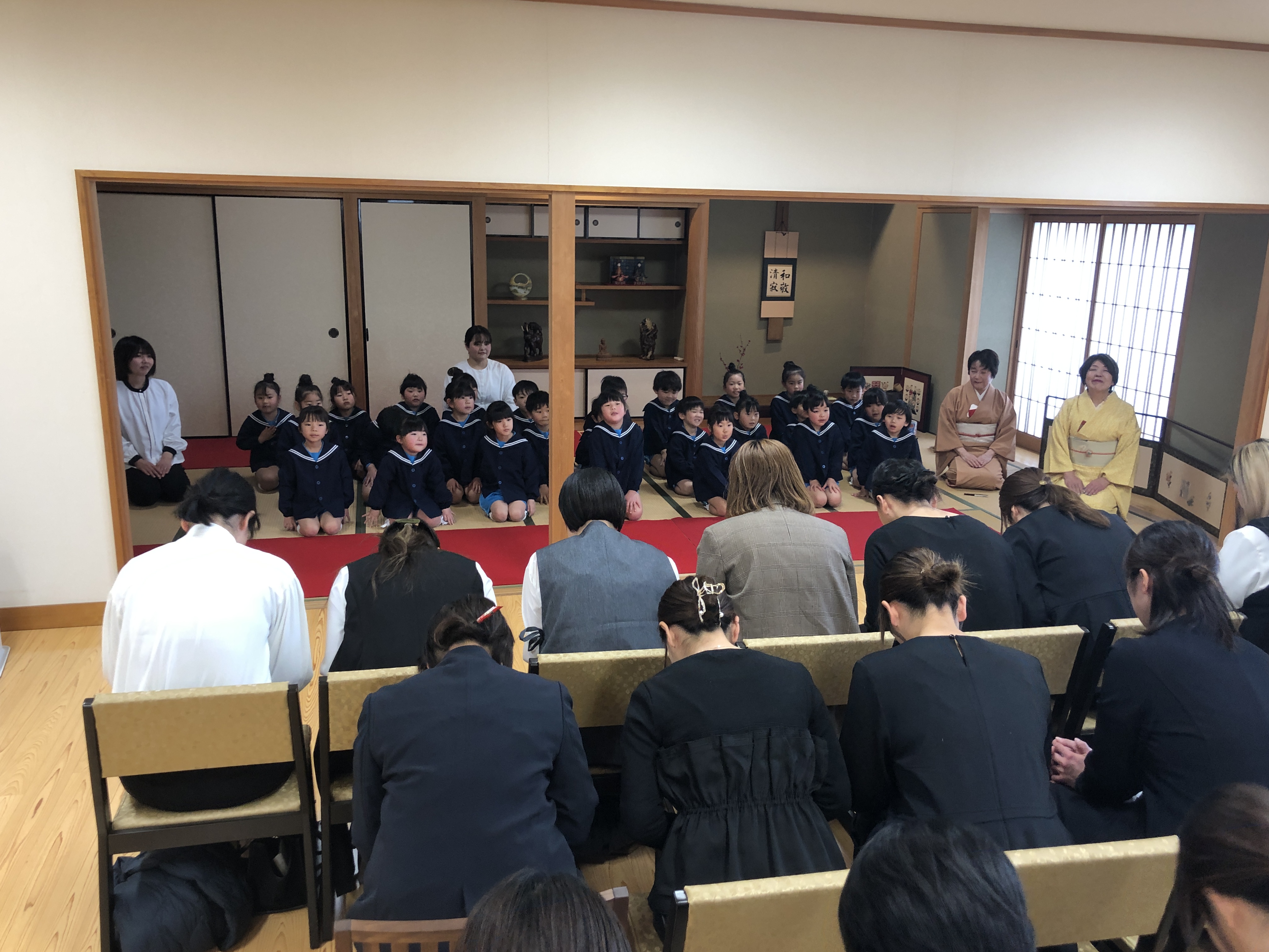 もうすぐ卒園の日を迎える さくら組のお友だちが、茶道教室で1年間学んだお稽古の成果を披露する卒園茶会が開かれ、立派に成長した姿をお家の方に見ていただきました。