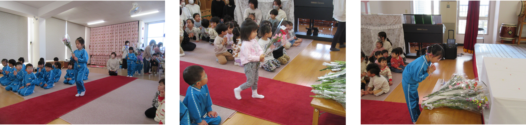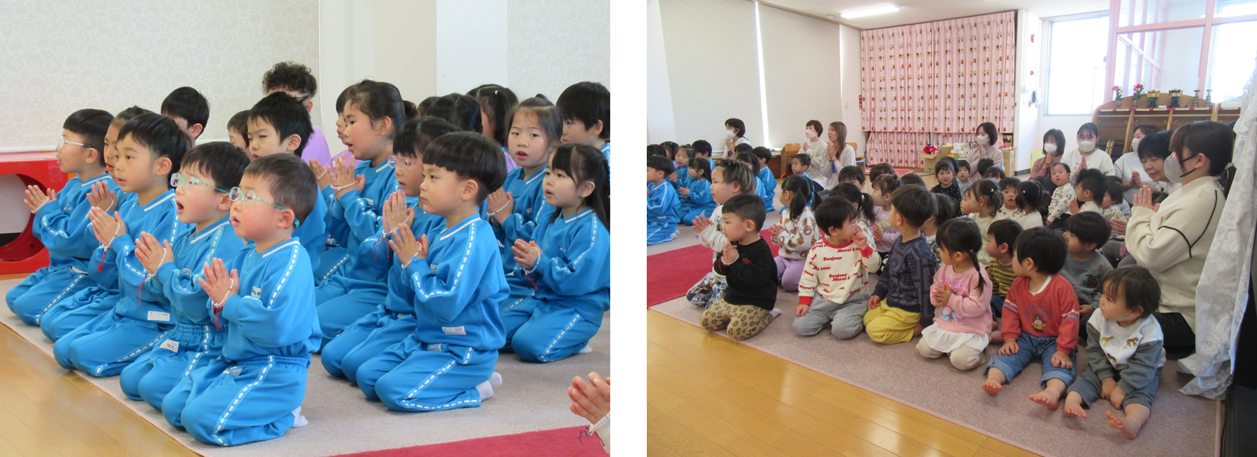 0歳児さんから5歳児さんまでみんな、お花をお供えし手を合わせました。