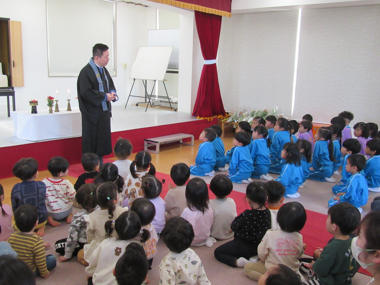 仏歌『さよならおしゃかさま』を歌いました。0,1歳児の子どもたちは、幼児組さんが大きな声で歌ったり、おつとめしたりするのをよく見ていました。