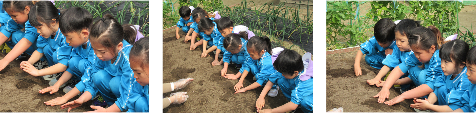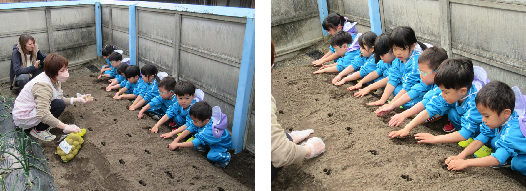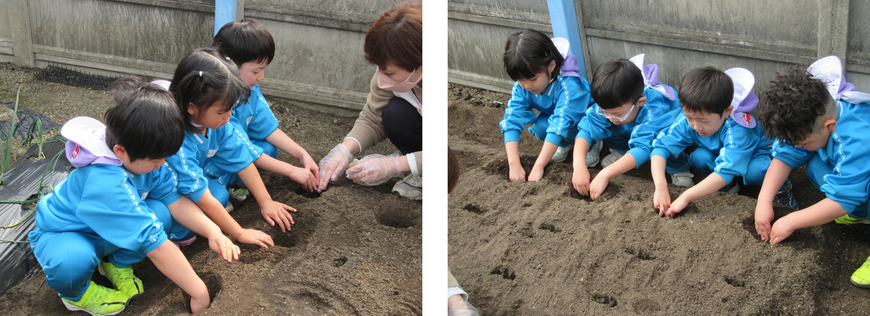 年中さんや年長さんも、年少さんと同じように穴を掘って種芋を植えていきました。