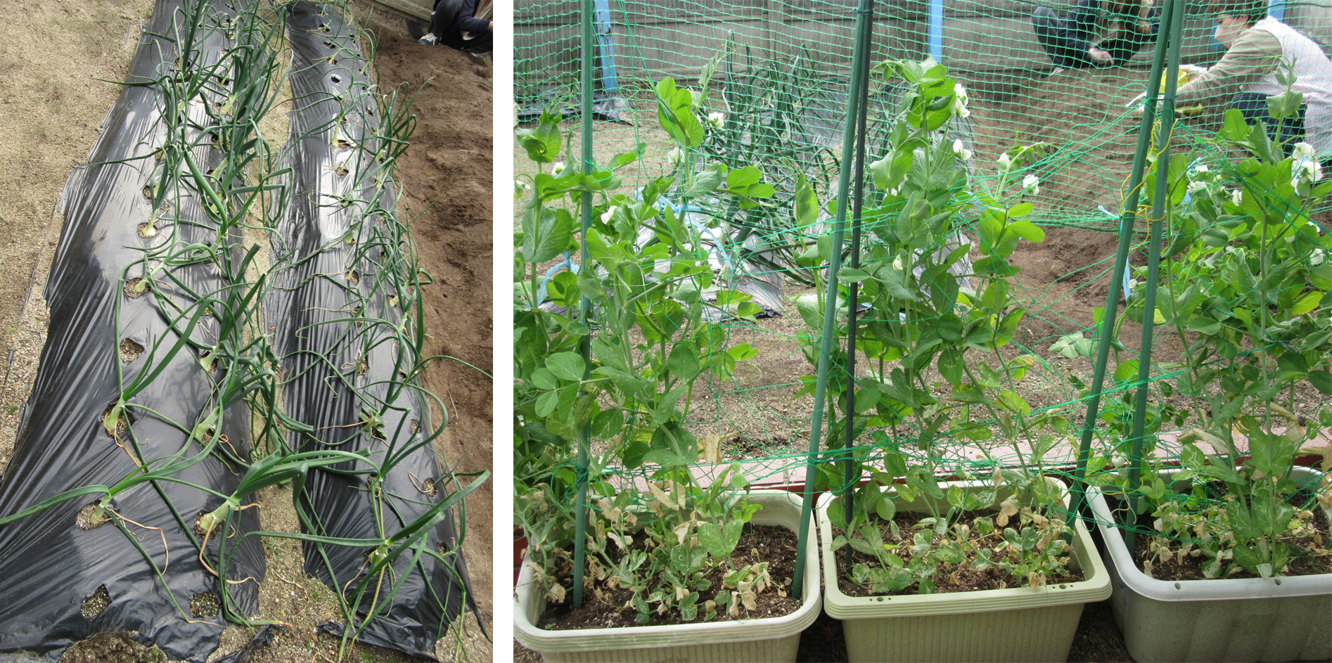 じゃがいもの他に、玉ねぎやスナップエンドウも大きくなっています。
