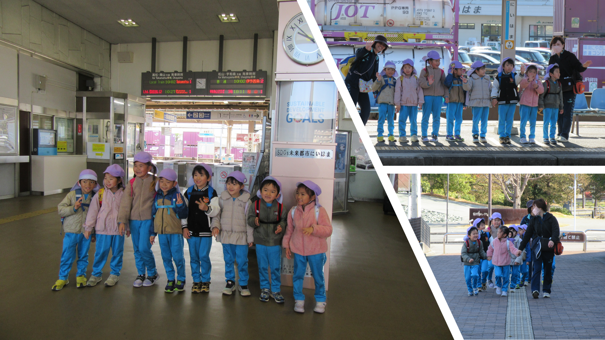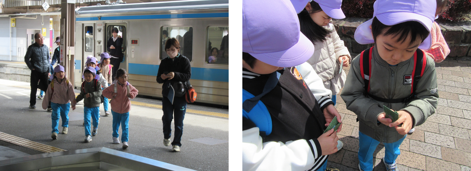 保育園から新居浜駅まで歩いて行きました。電車に初めて乗る子どもたちもいました。