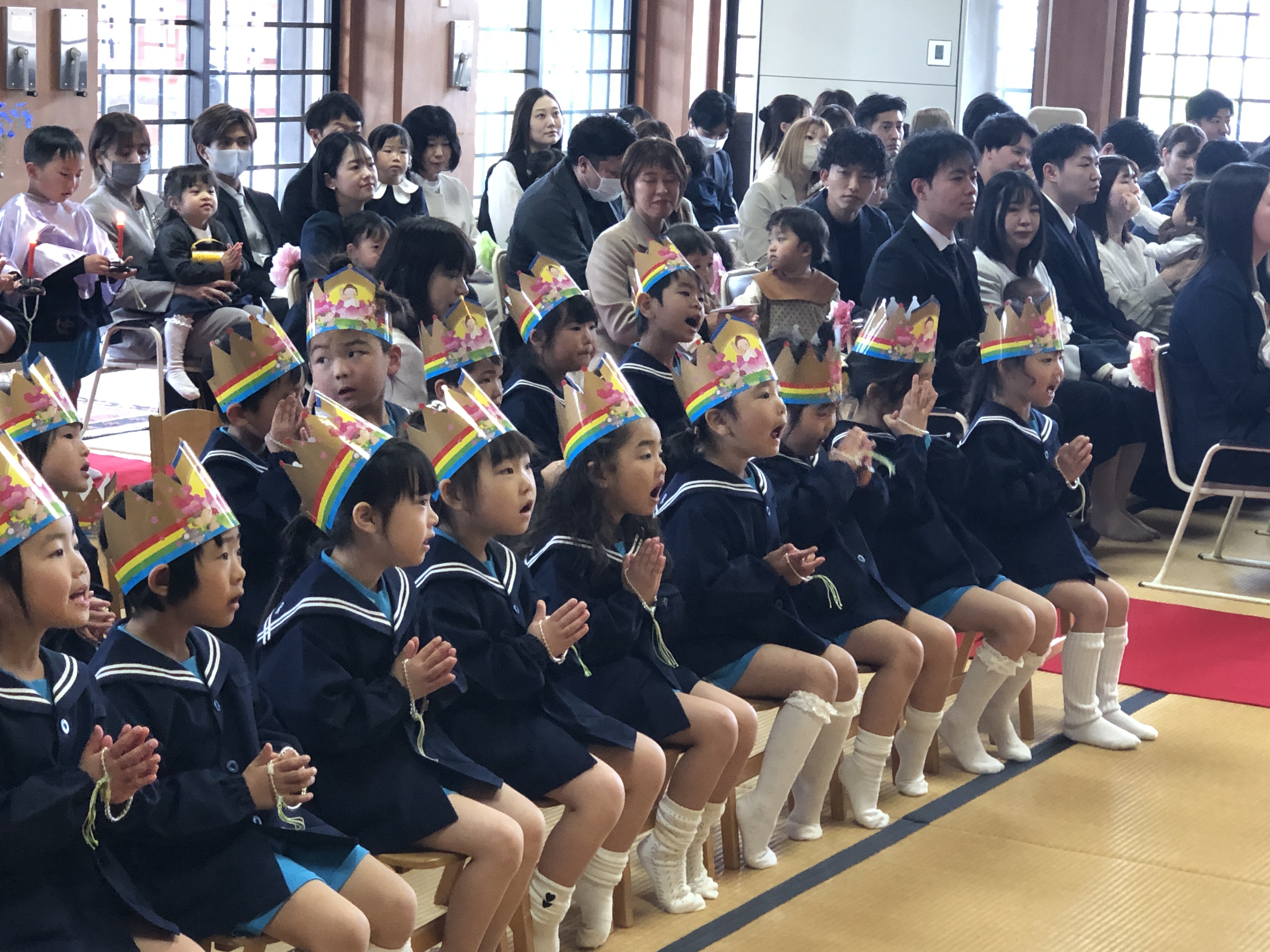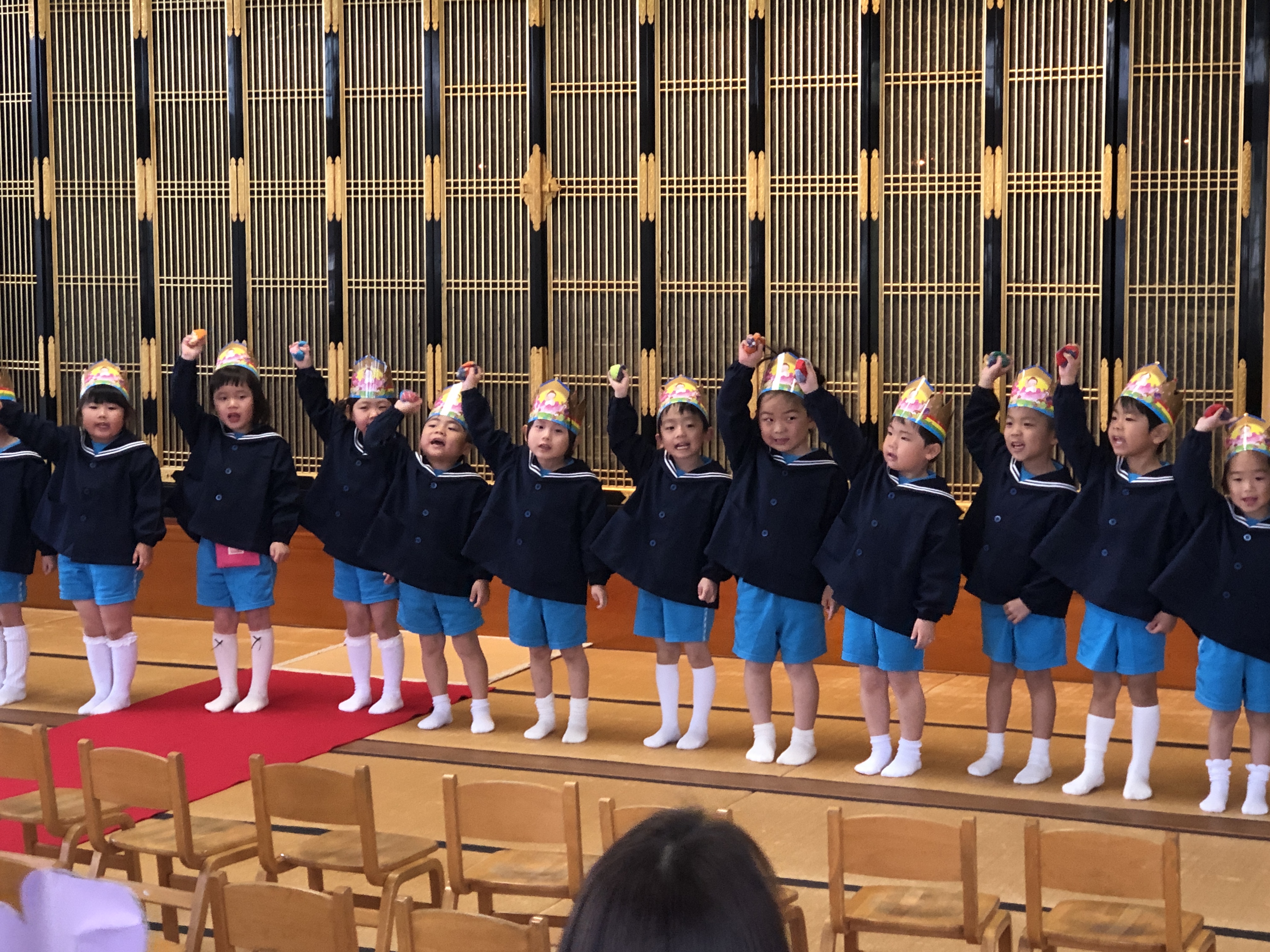 開式前のお楽しみでは、在園児を代表してさくら組(年長児)のお友だちが、「ハイ・ハイ・ハーイ」の歌と お手玉遊びを披露し、「ご入園おめでとうございます。いっしょに仲よく遊ぼうね。」と元気いっぱいに挨拶してくれました。