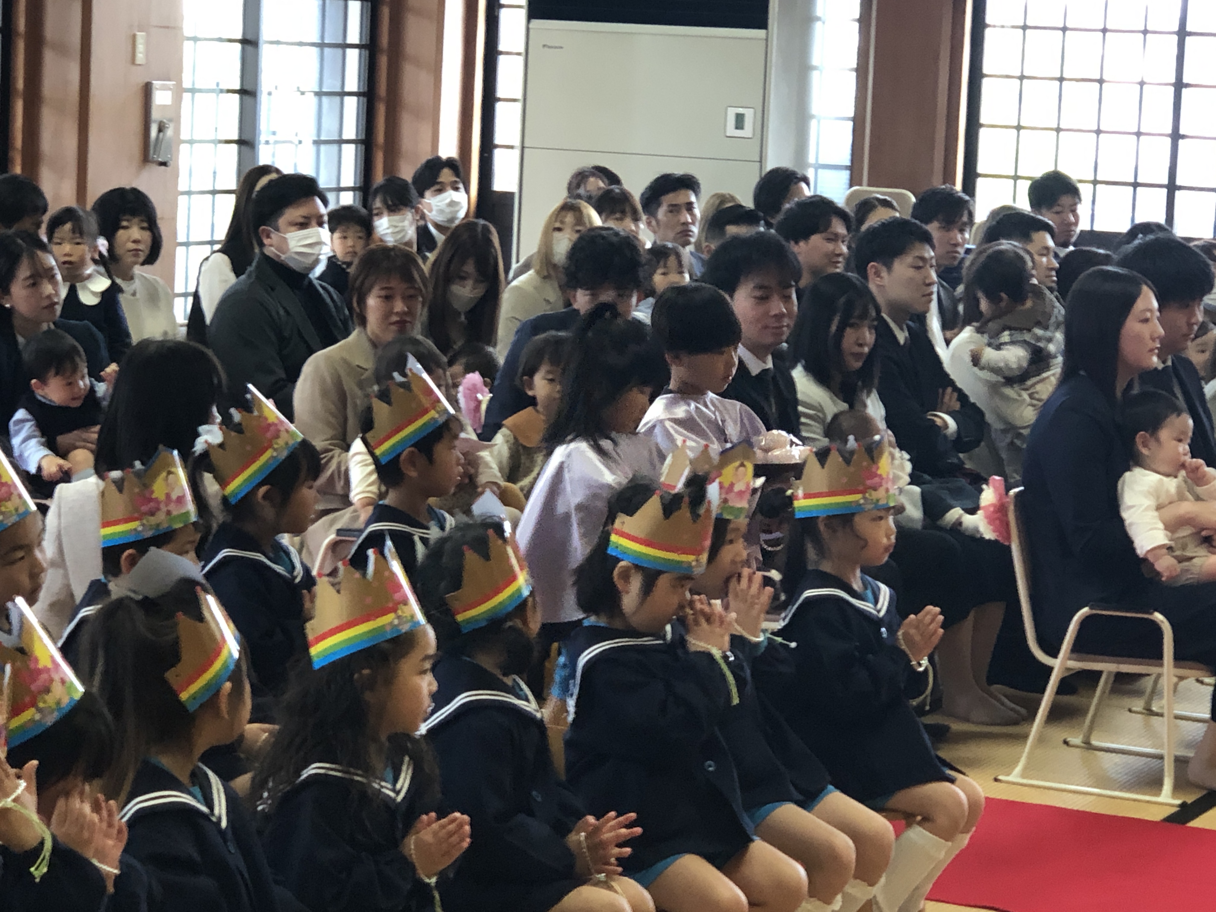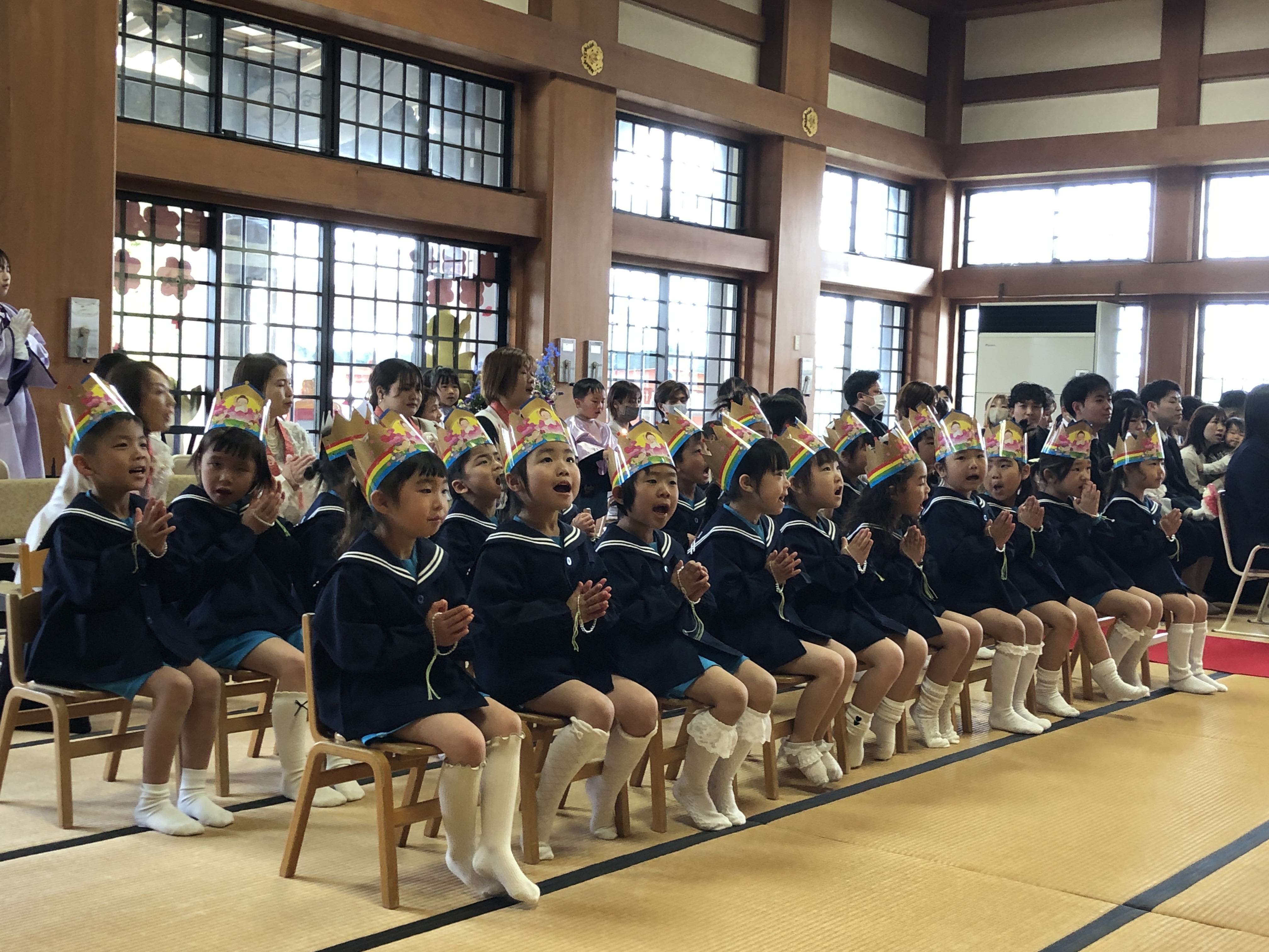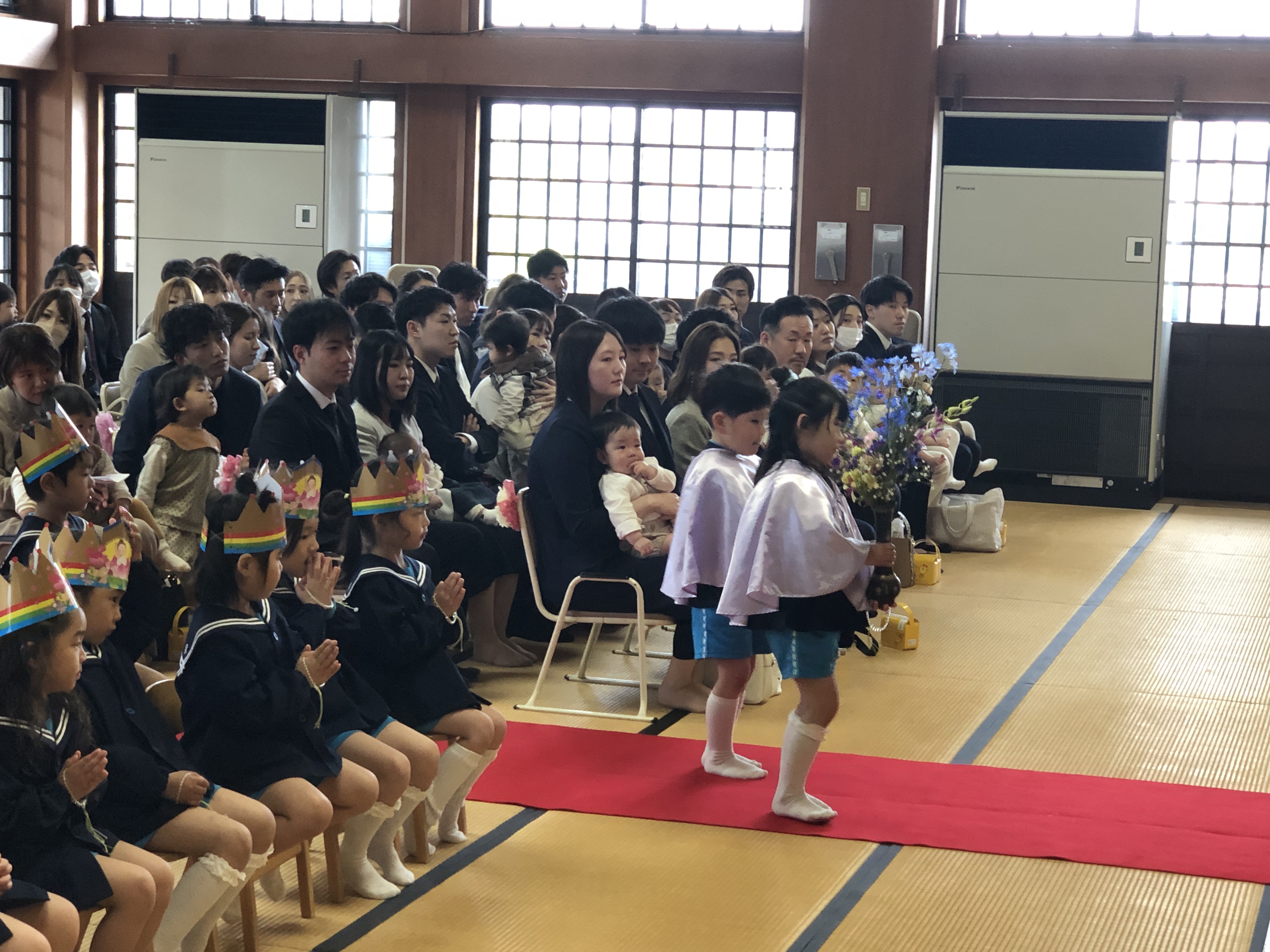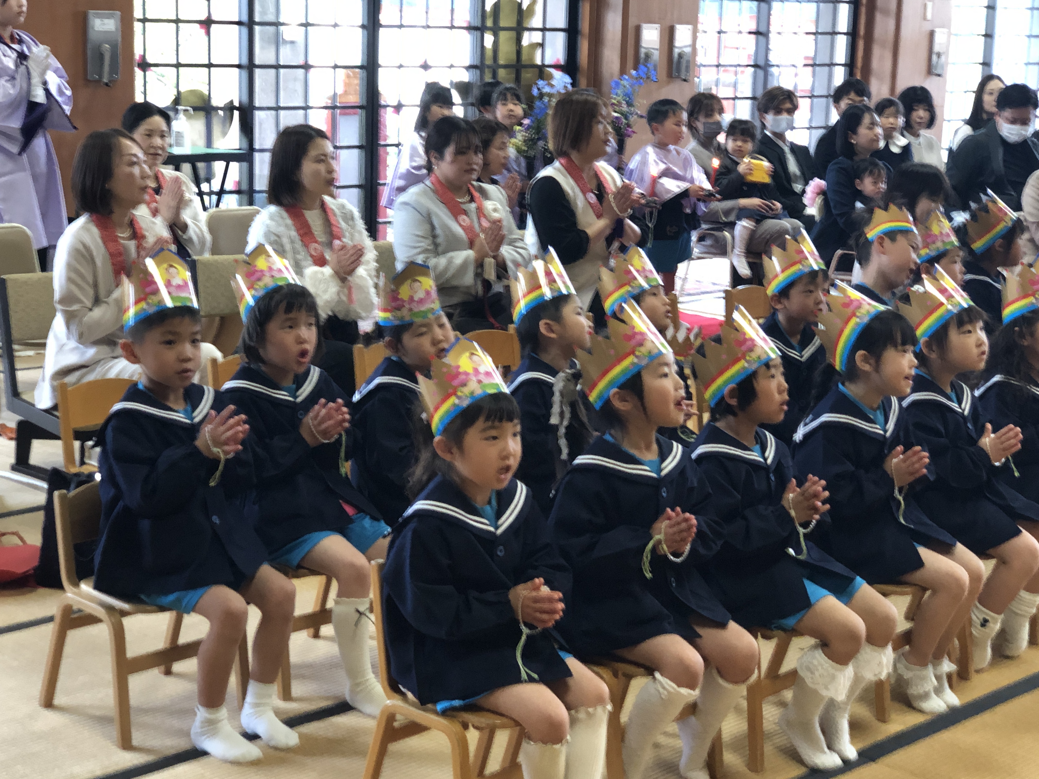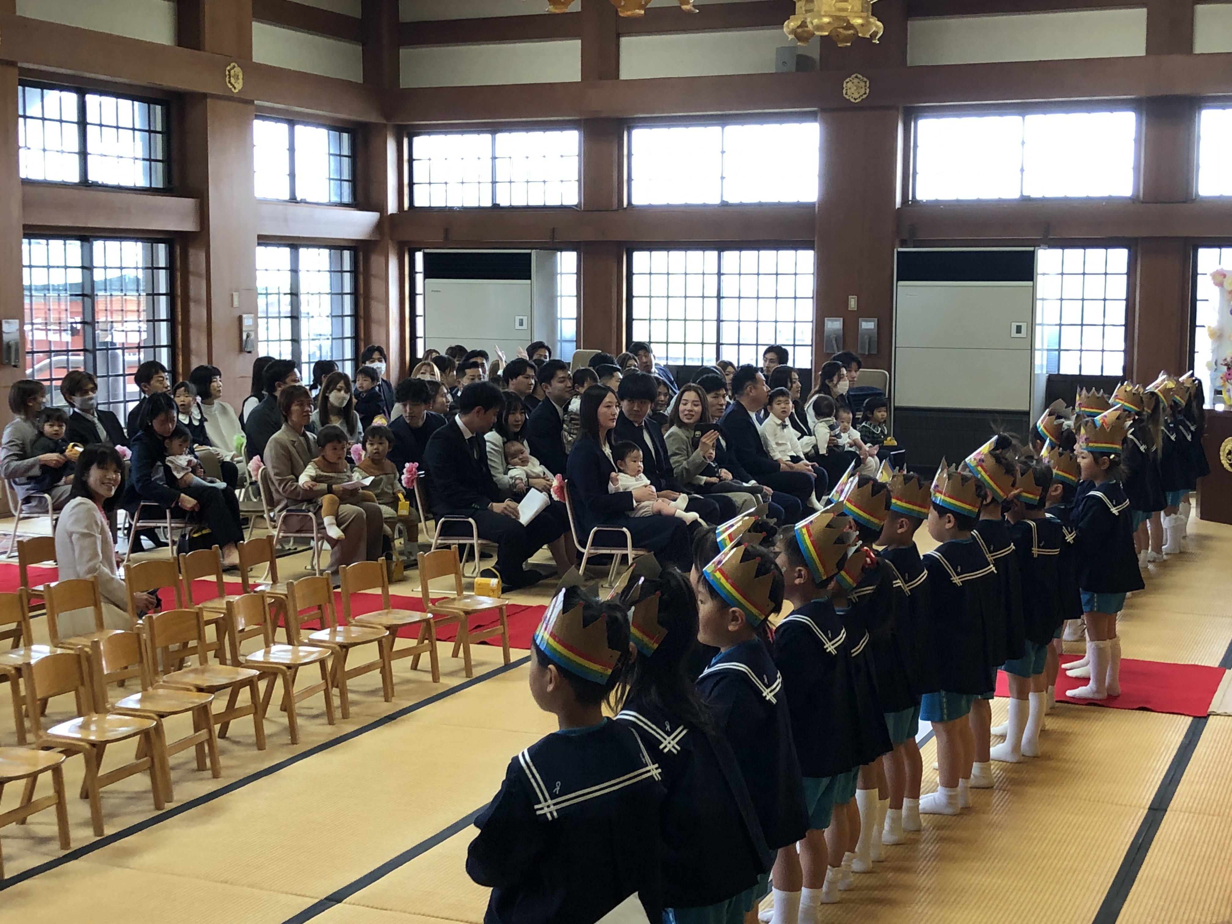 入園式が始まり、園歌「めぐみのこども」「おねんじゅ おててに」を年長児のお友だちが明るい声で歌います。
