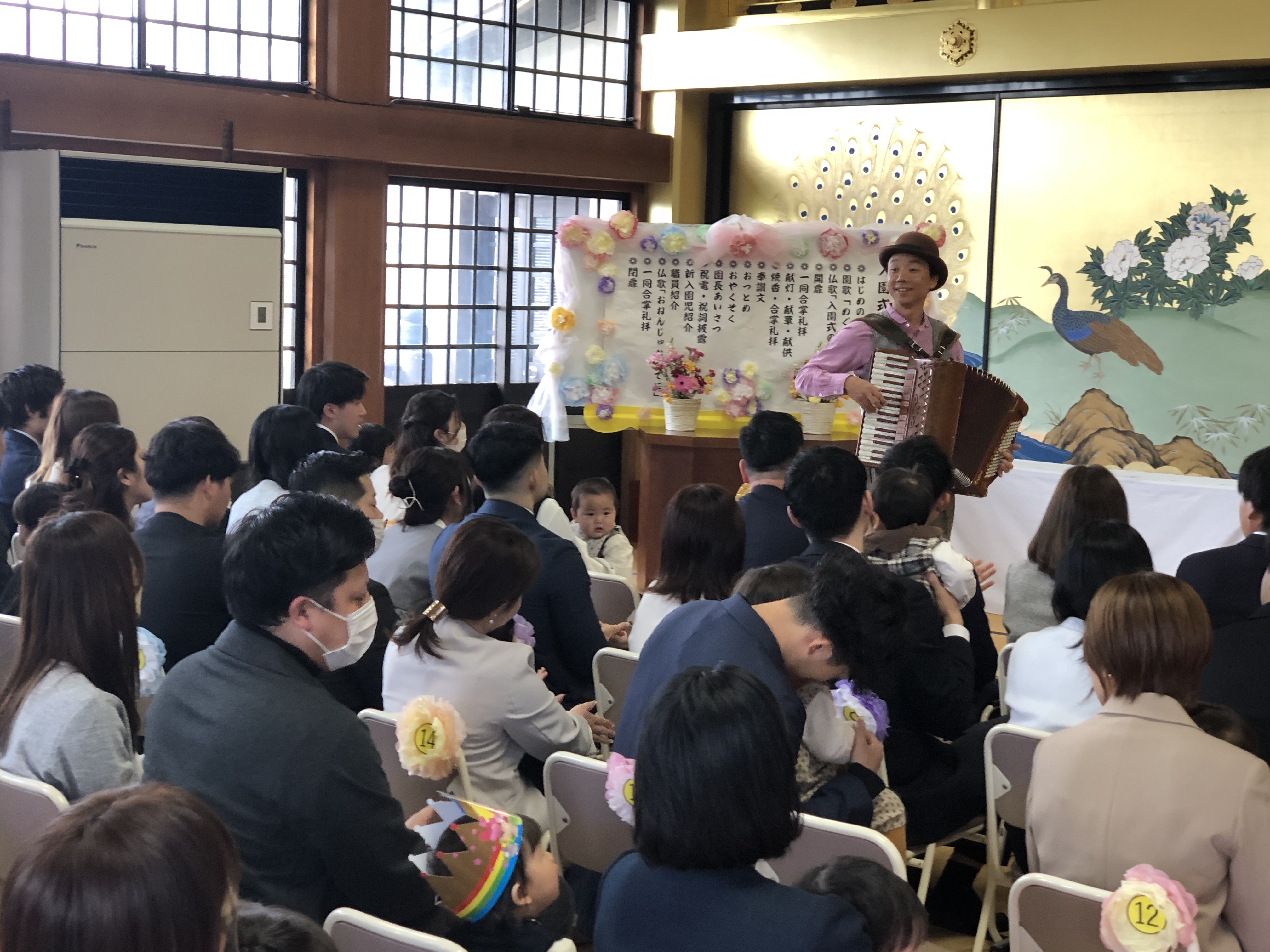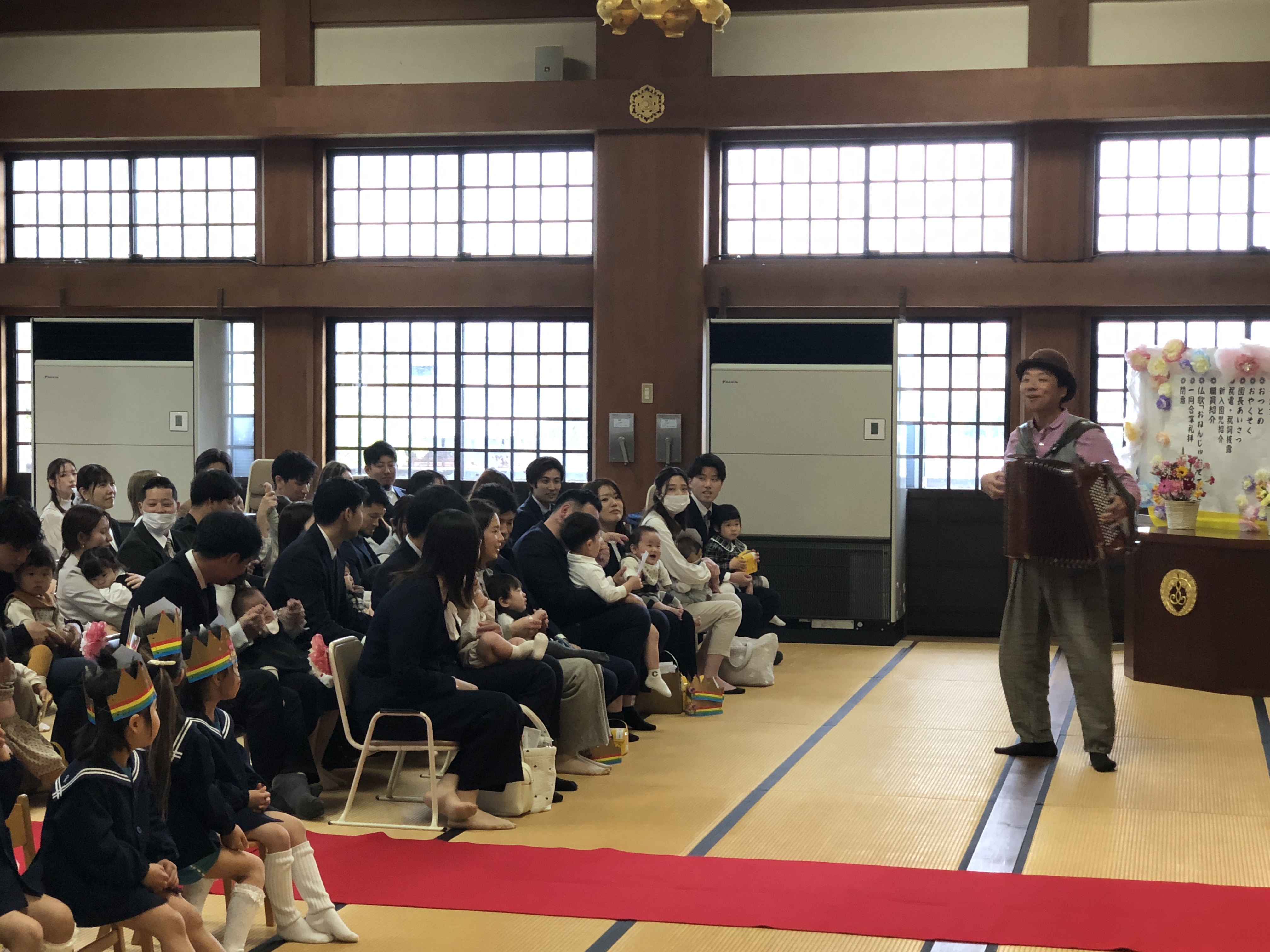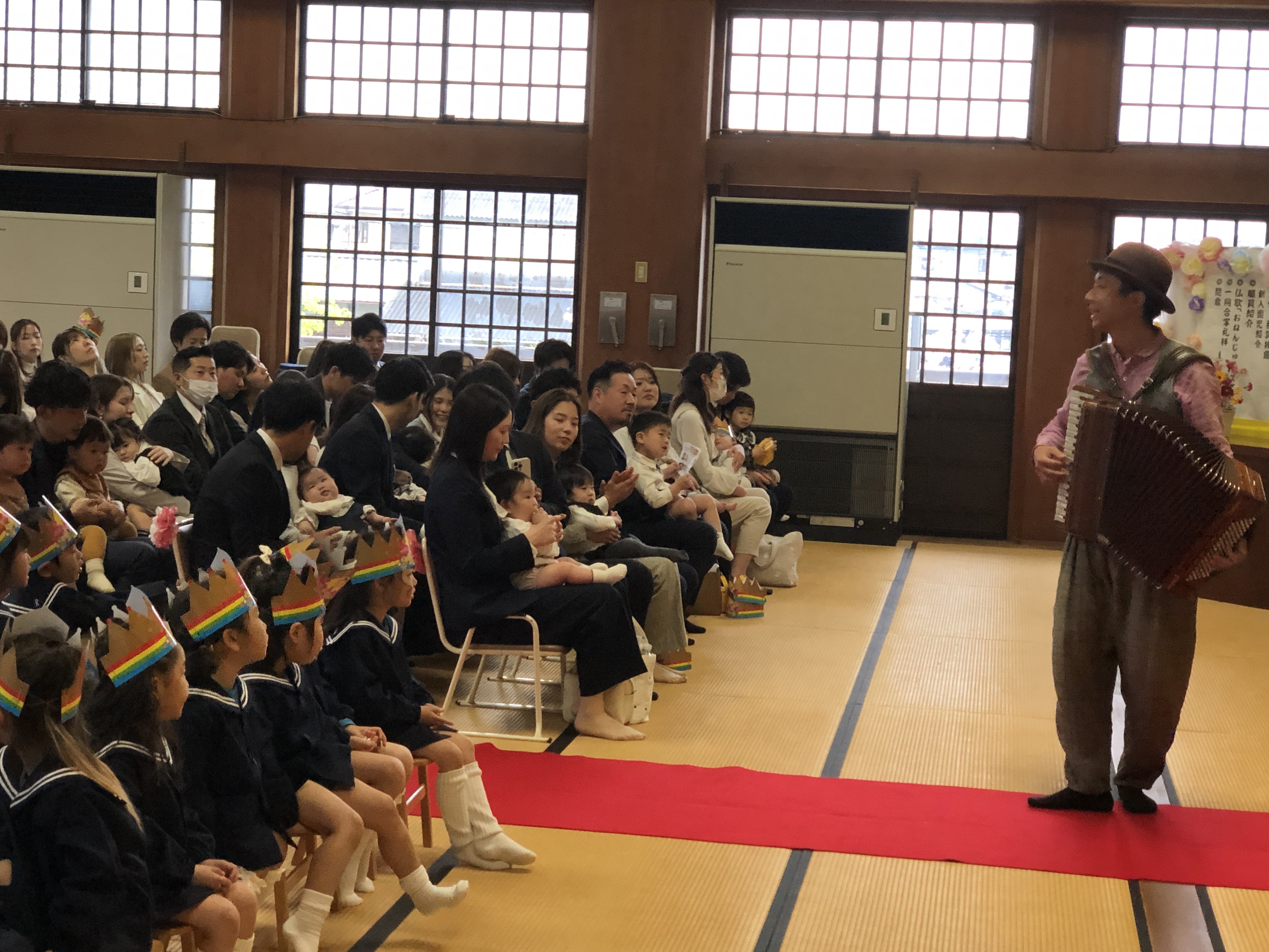 閉式後のお楽しみは、めぐみ保育園ではお馴染みの特別ゲスト 七つ星のアコーディオン弾き「アライタケヒト」さんによる歌とアコーディオンライブが開かれました。