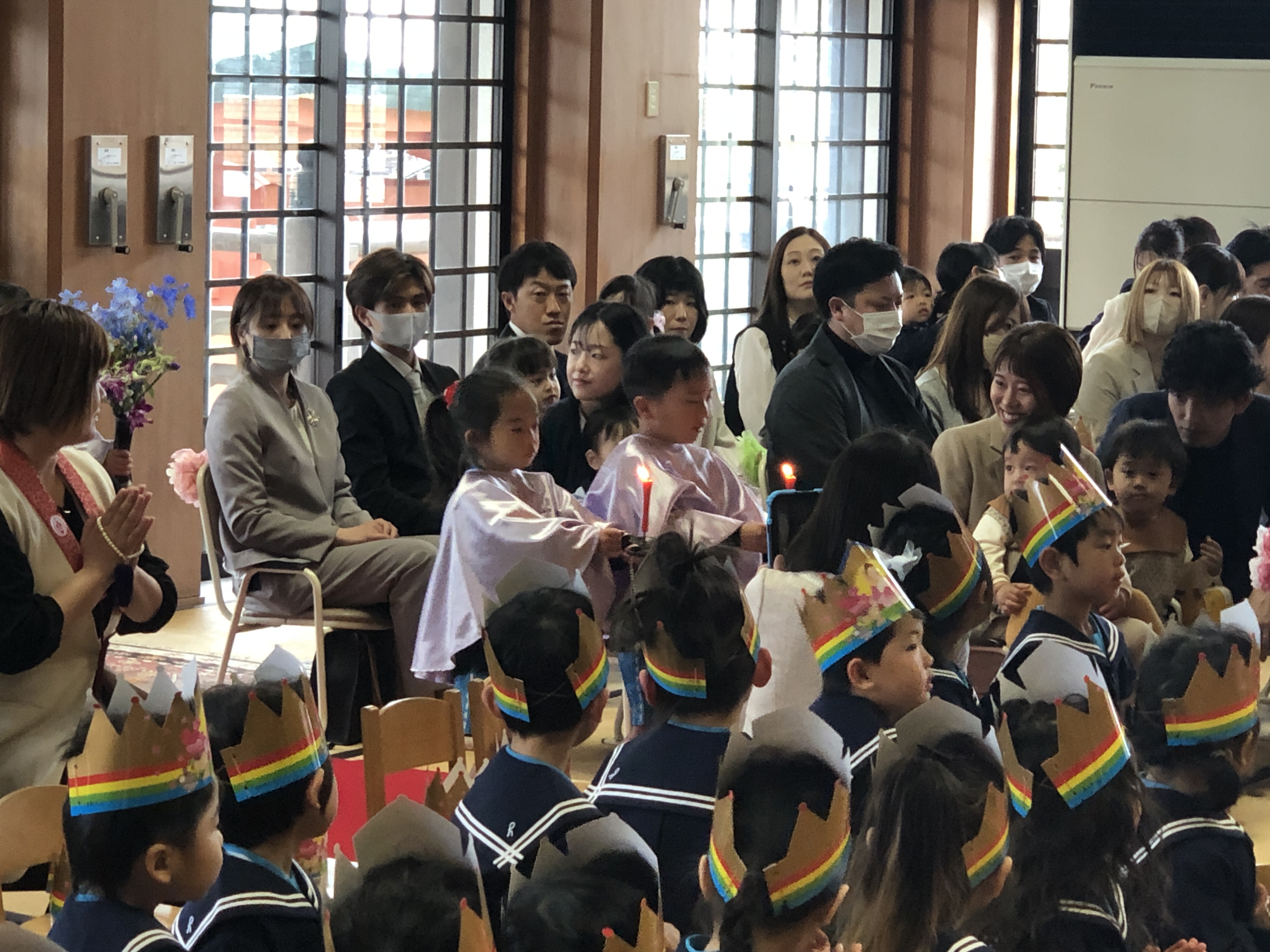 0歳児のお友だちから順にお名前が紹介され、ののさまの花冠(はなかんむり)を被してもらいます。