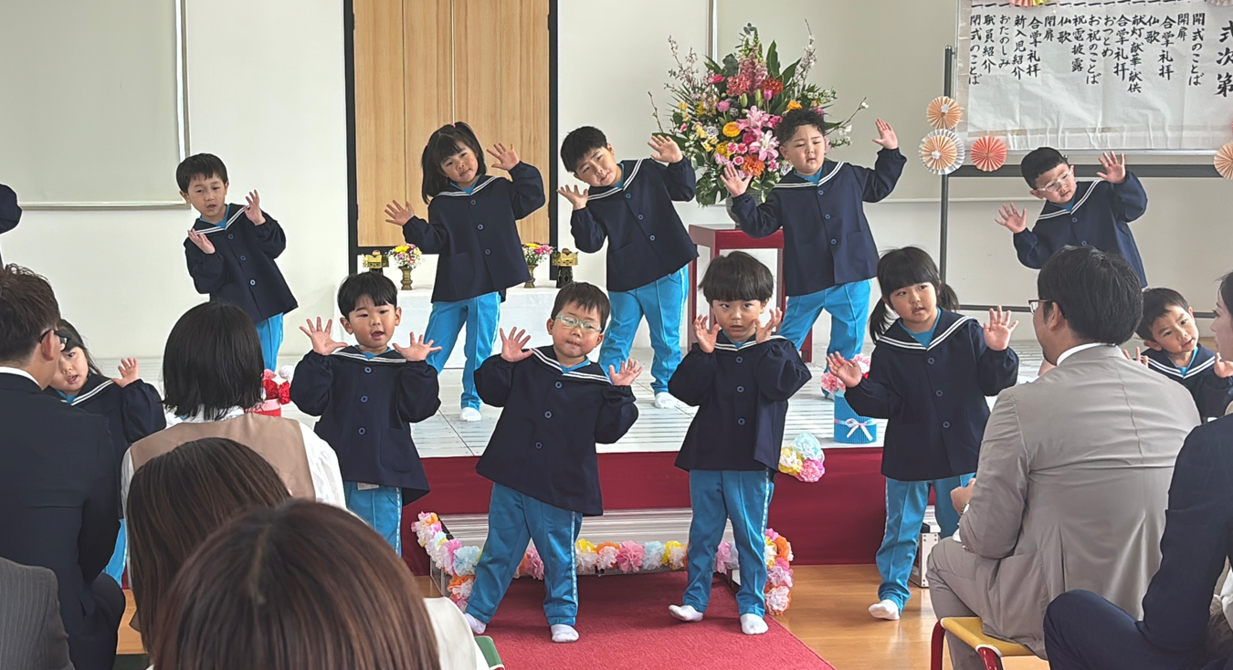 年長さんと年中さんが、手遊び『トントントンアンパンマン』をしたり『チューリップ』『先生とお友だち』『犬のおまわりさん』の歌を歌ったりして、新入園児さんたちをお祝いをしました。